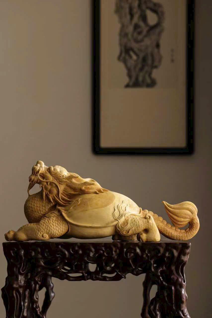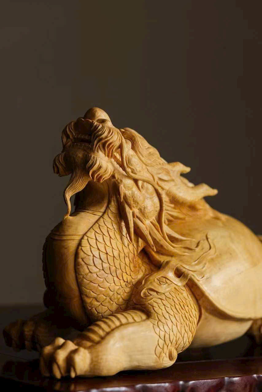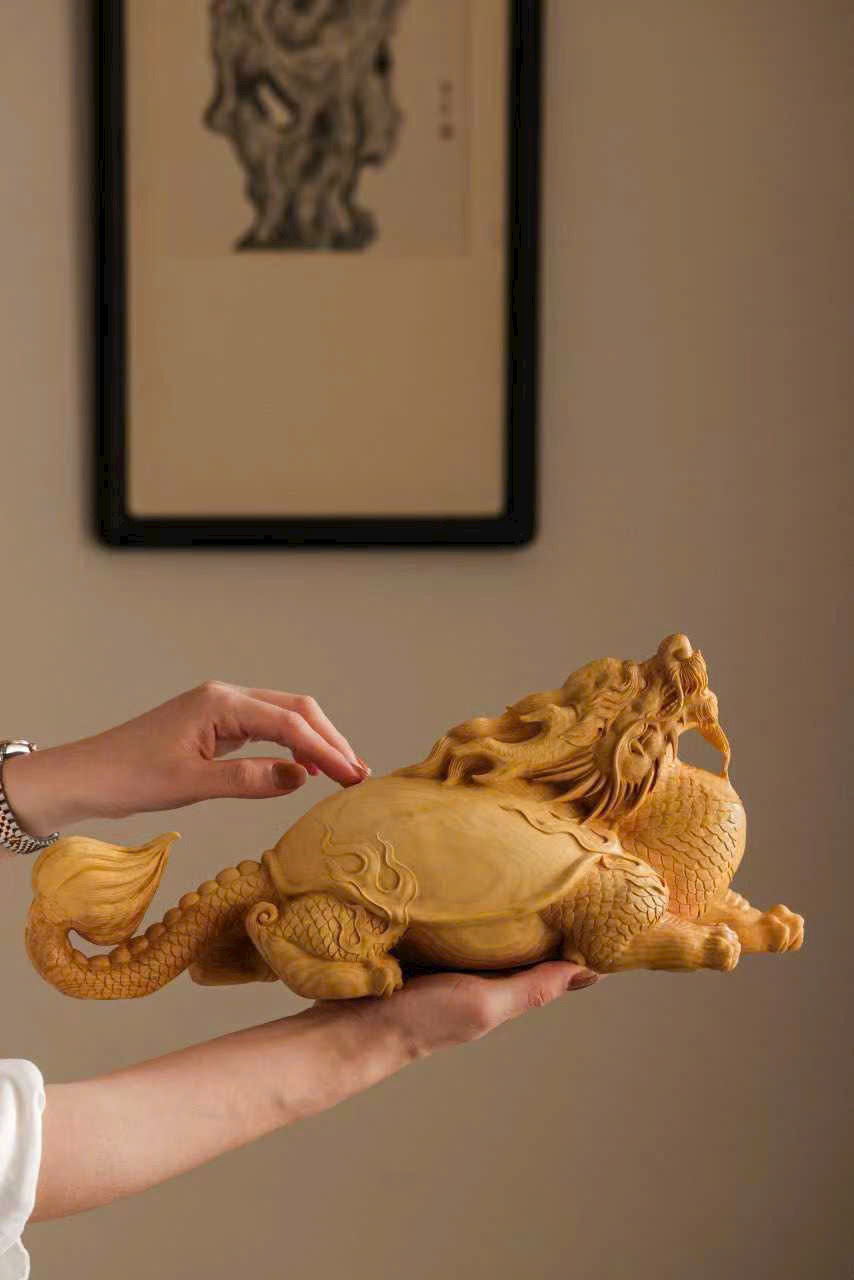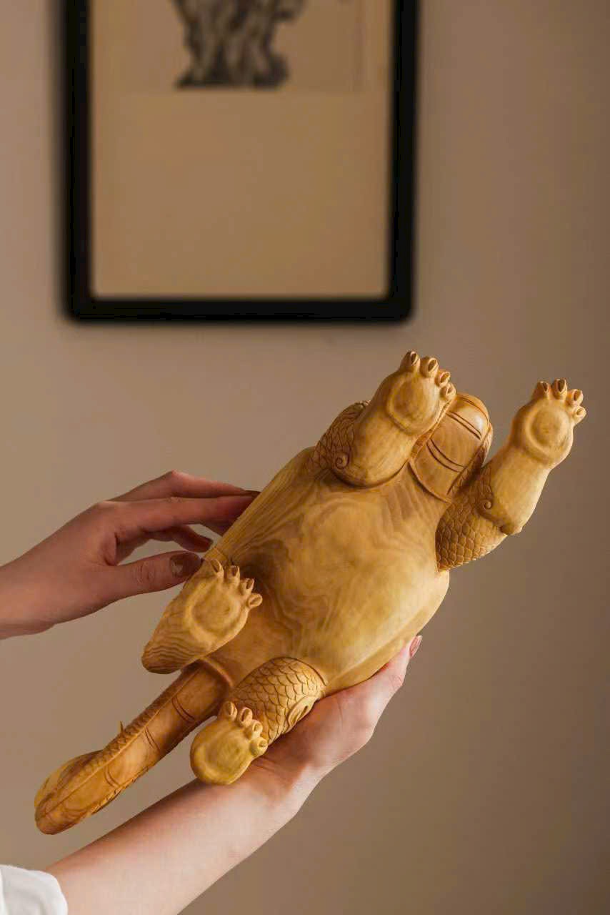 Chất gỗ mịn đẹp, bóng nhuận tự nhiên. Nghệ nhân thuận theo vân gỗ mà chạm khắc, khắc họa hình tượng long quy với thân hình đầy đặn, rắn chắc. Trên mai rồng ẩn hiện cảnh sơn thủy – vân yên, ẩn chứa khí tượng cát tường và phú quý. Tổng thể hòa hợp giữa chất liệu và tạo hình, thần thái sinh động, ý cảnh viên mãn.
