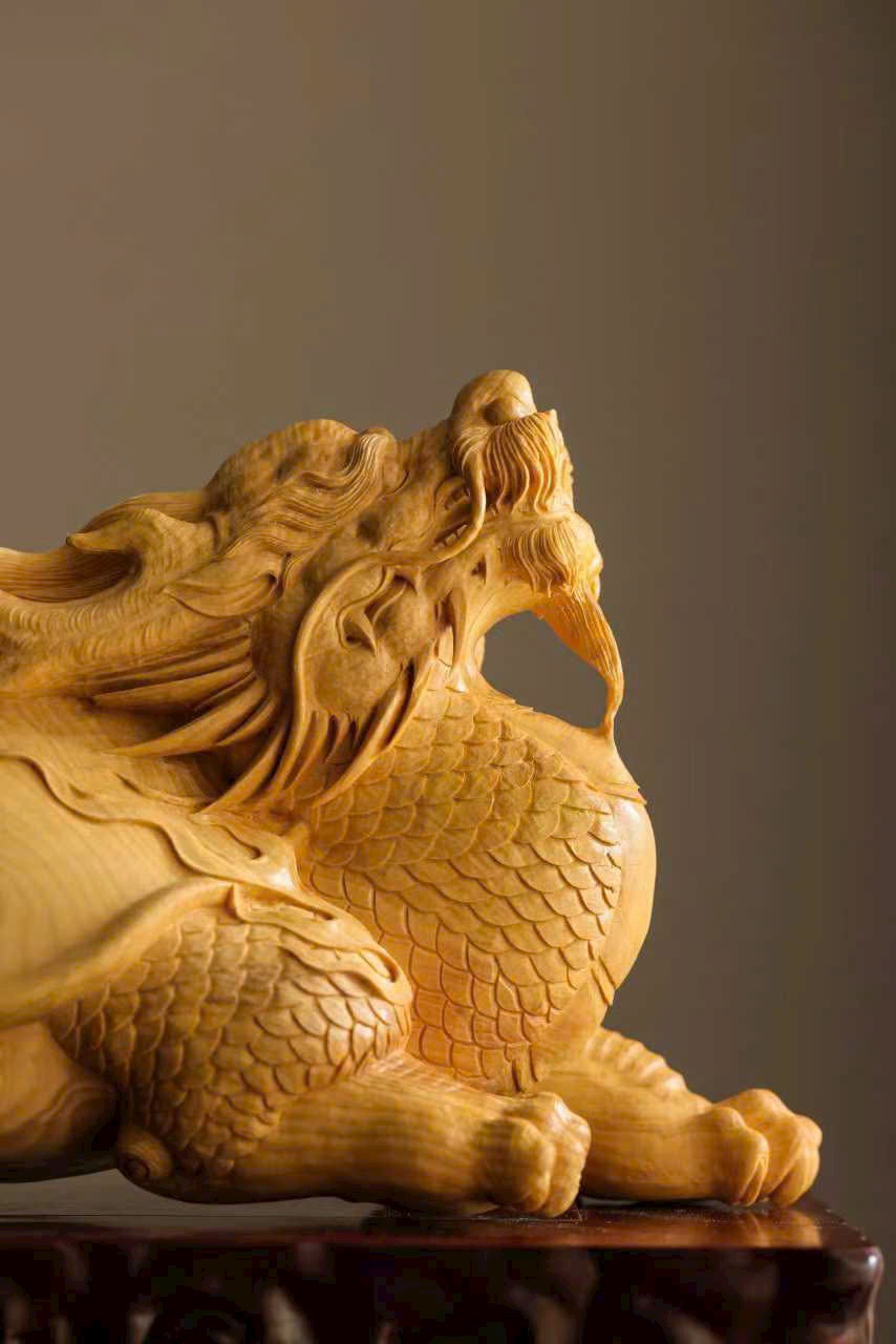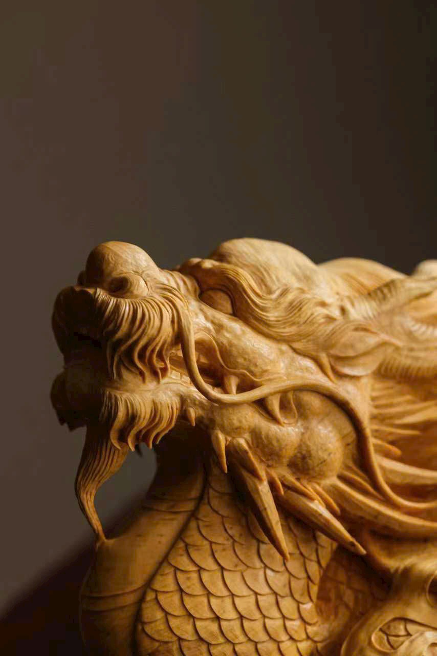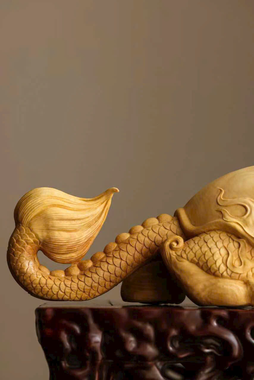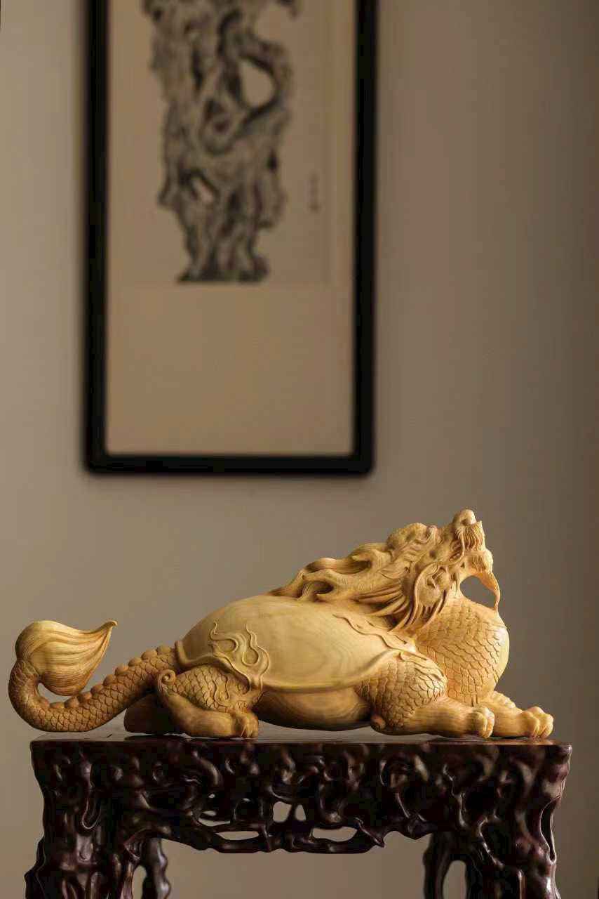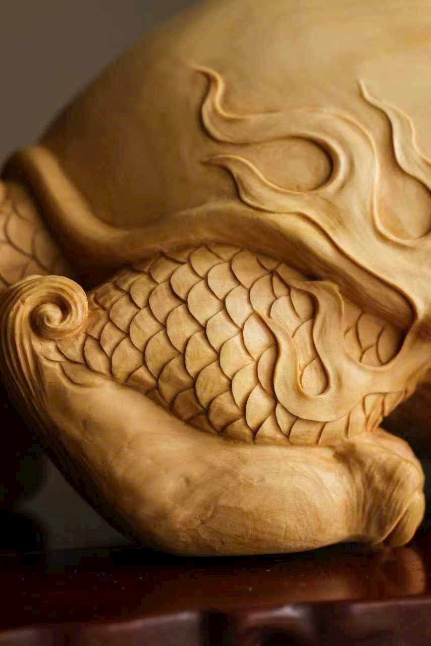 Chất gỗ mịn đẹp, bóng nhuận tự nhiên. Nghệ nhân thuận theo vân gỗ mà chạm khắc, khắc họa hình tượng long quy với thân hình đầy đặn, rắn chắc. Trên mai rồng ẩn hiện cảnh sơn thủy – vân yên, ẩn chứa khí tượng cát tường và phú quý. Tổng thể hòa hợp giữa chất liệu và tạo hình, thần thái sinh động, ý cảnh viên mãn.