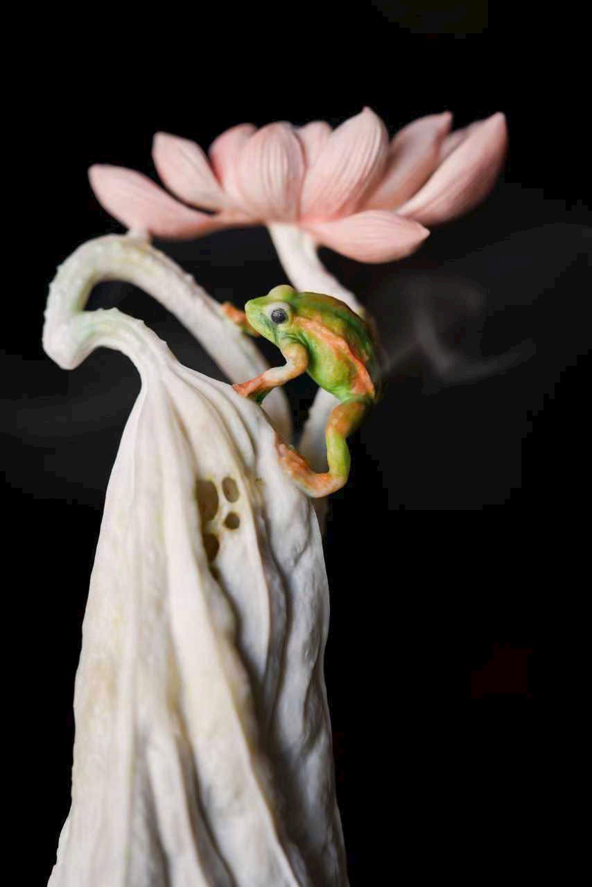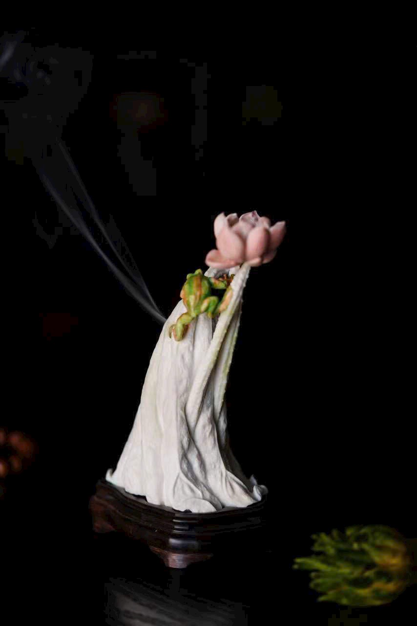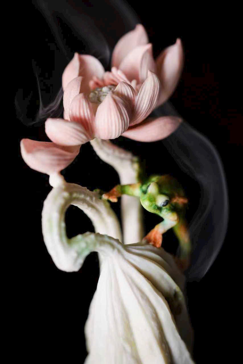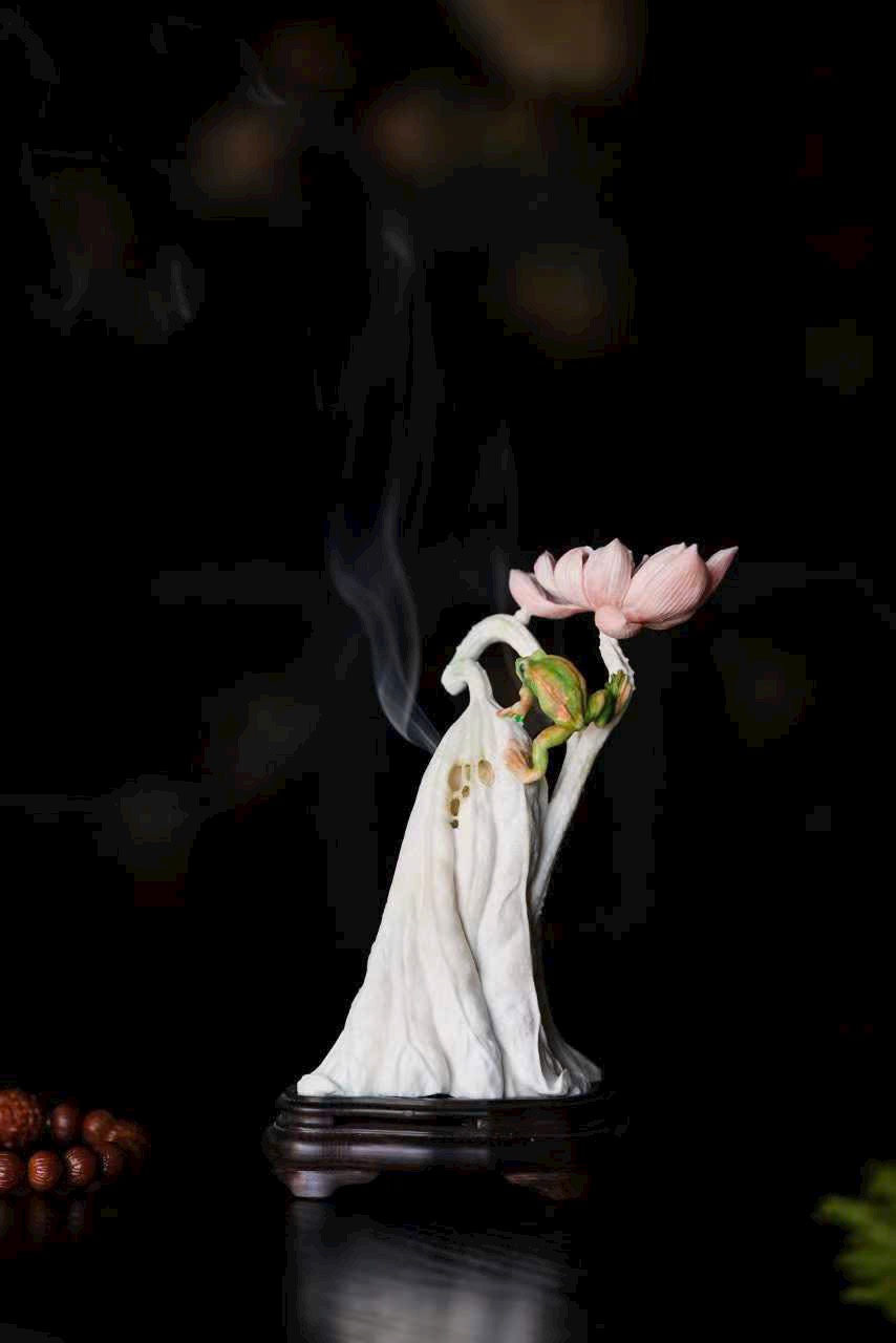 Chất sừng ấm nhuận như mật, khéo chạm lá sen cuộn mở. Ếch ngồi trên lá, bụng căng tròn, lưng đỡ khói trầm Bác Sơn uốn lượn; gương sen rủ giọt sương khéo làm núm nắp. Khi trà hương lan tỏa, tựa nghe mưa rơi trên lá sen, cả gian phòng dấy lên thanh thú.