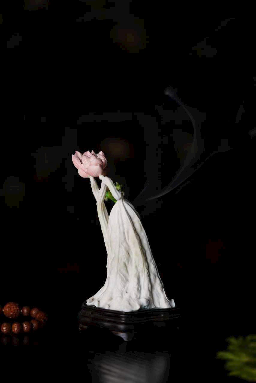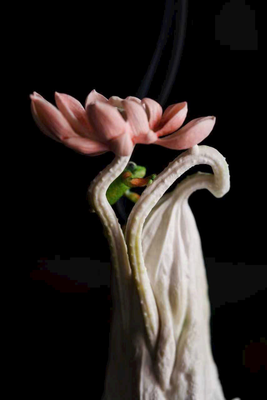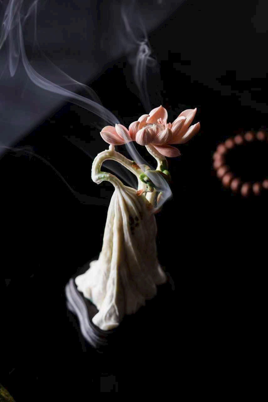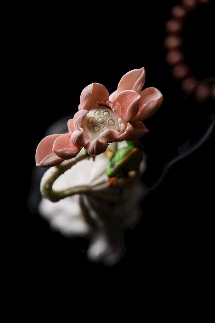 Chất sừng ấm nhuận như mật, khéo chạm lá sen cuộn mở. Ếch ngồi trên lá, bụng căng tròn, lưng đỡ khói trầm Bác Sơn uốn lượn; gương sen rủ giọt sương khéo làm núm nắp. Khi trà hương lan tỏa, tựa nghe mưa rơi trên lá sen, cả gian phòng dấy lên thanh thú.
