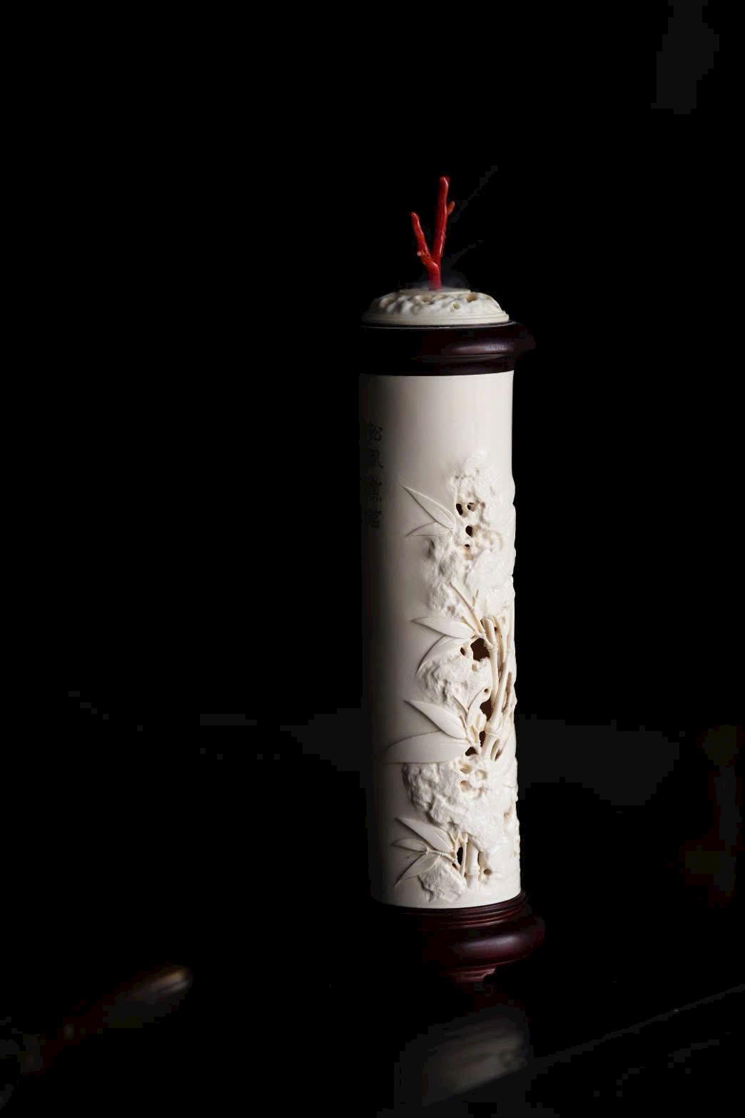 Chất n.gà sáng bóng như ngọc, thân lư hương chạm thủng khắc cành trúc lồng bóng. Đốt trúc thẳng vươn như nét triện, gân lá trong sáng như họa. Phẩm bày nơi án thư, toát lên thiền ý thanh u tao nhã.