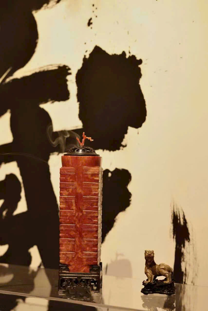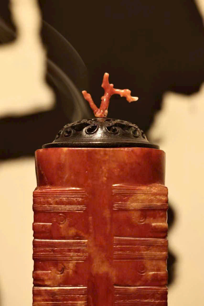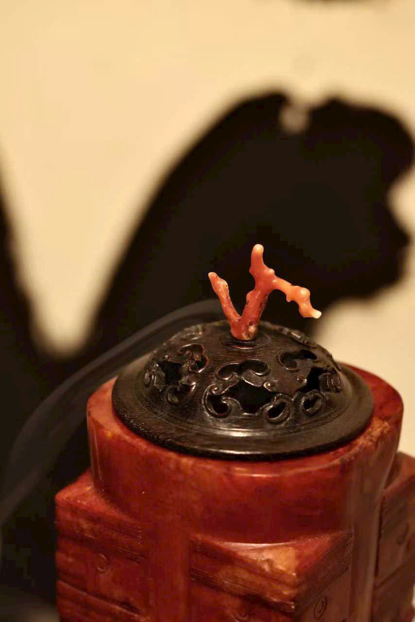 Phối hợp đa chất liệu hài hòa, nắp lư hương chạm khắc xuyên thấu tinh xảo, kết cấu thoáng sáng và cân xứng. Hồng ngọc dáng vẻ thanh nhã, khi hương khói lan tỏa càng tôn thêm vẻ đẹp giao hòa giữa ngọc và khói, tạo nên khí vị cổ nhã, trầm tĩnh mà không tục.