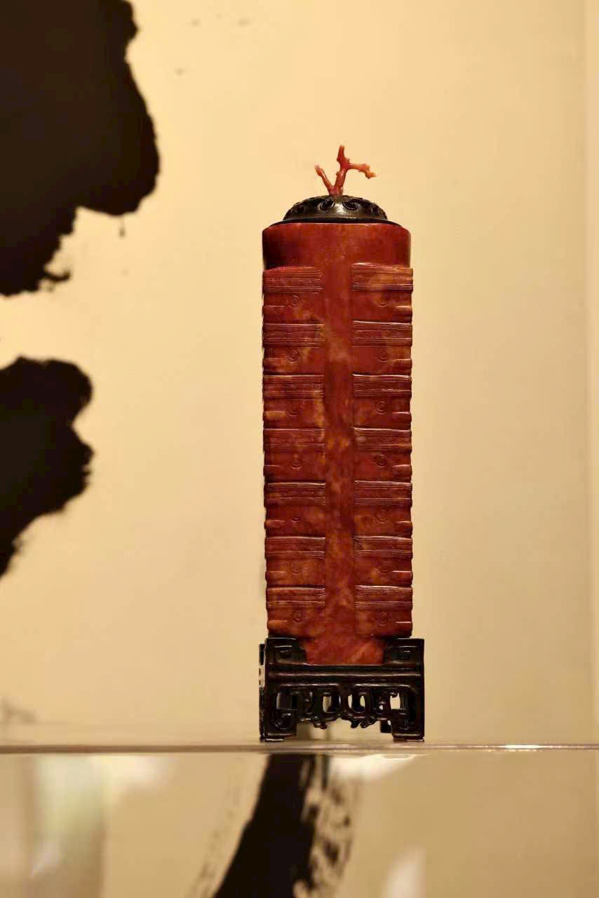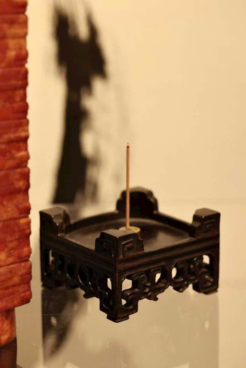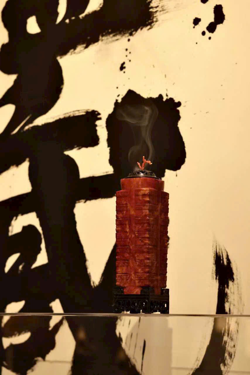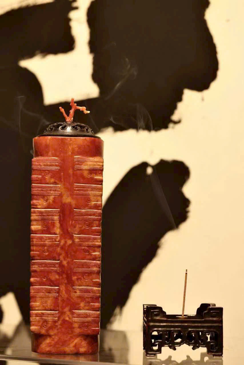Phối hợp đa chất liệu hài hòa, nắp lư hương chạm khắc xuyên thấu tinh xảo, kết cấu thoáng sáng và cân xứng. Hồng ngọc dáng vẻ thanh nhã, khi hương khói lan tỏa càng tôn thêm vẻ đẹp giao hòa giữa ngọc và khói, tạo nên khí vị cổ nhã, trầm tĩnh mà không tục.