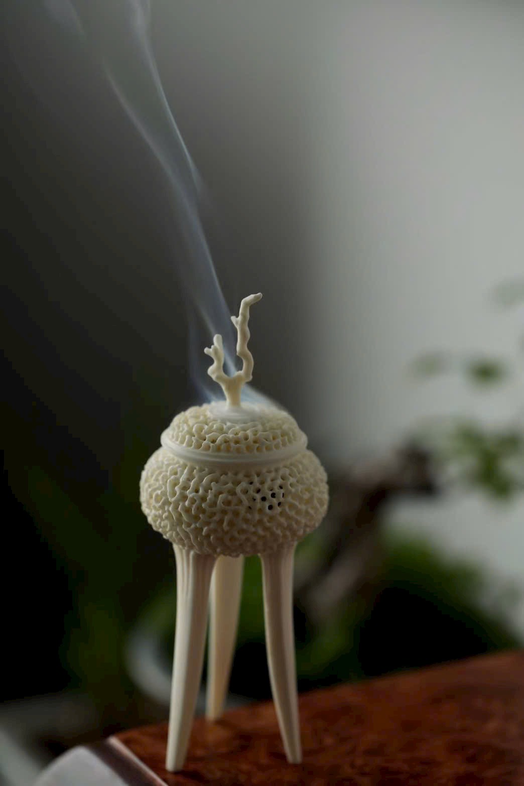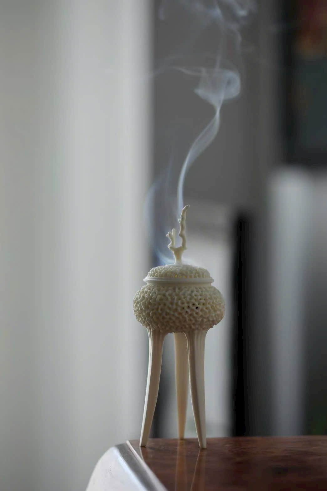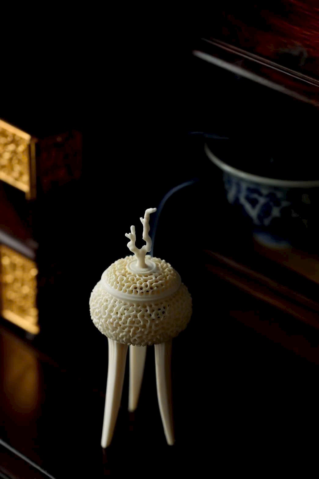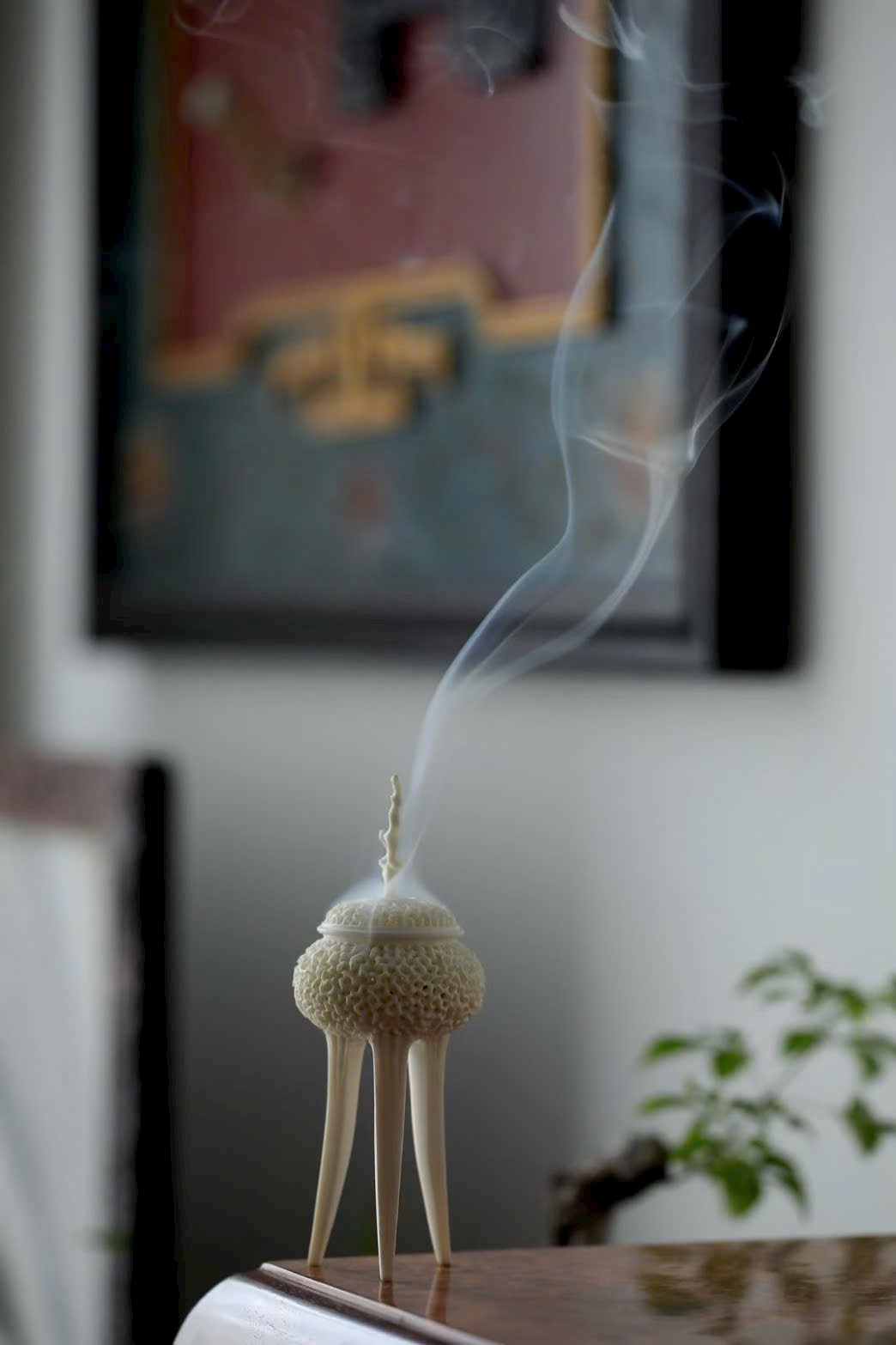 Thiết kế ba chân vững chãi, chạm khắc thông phong tinh vi, toàn thân điêu khắc dày đặc nhưng hài hòa, khói hương bảng lảng, gợi nên cảnh giới tĩnh lặng, rũ bỏ bụi trần.