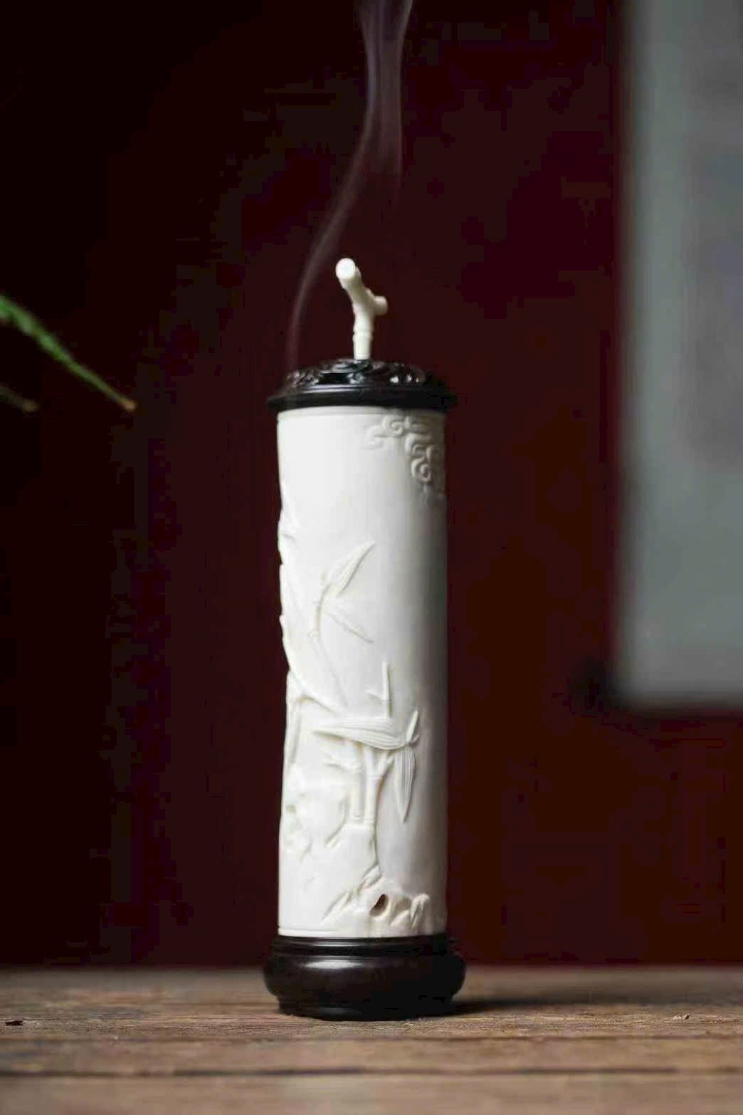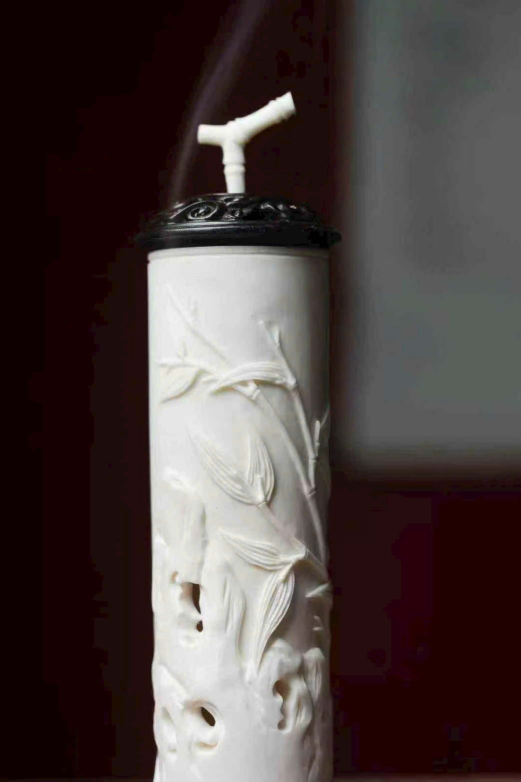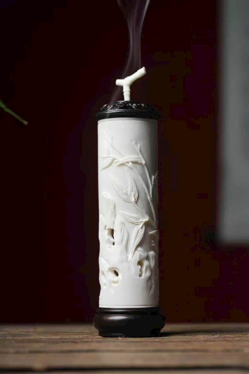 Nguyên khối gạc hươu tạo hình, bề mặt cong nổi khắc phù điêu, chạm họa tiết trúc ngọc “từng đốt vươn cao”. Bố cục thoáng đạt, thanh nhã tao nhã, ẩn chứa ý nghĩa từng bước thăng tiến, cát tường như ý, là nhã vật trong hương sự.