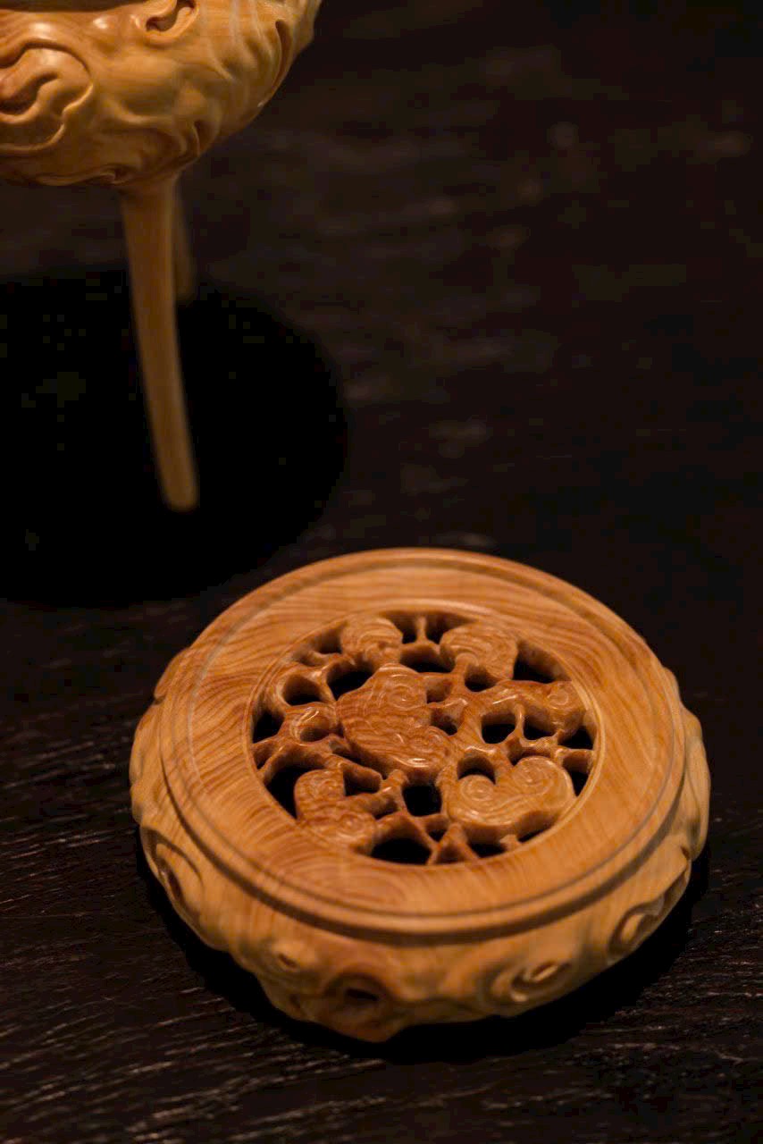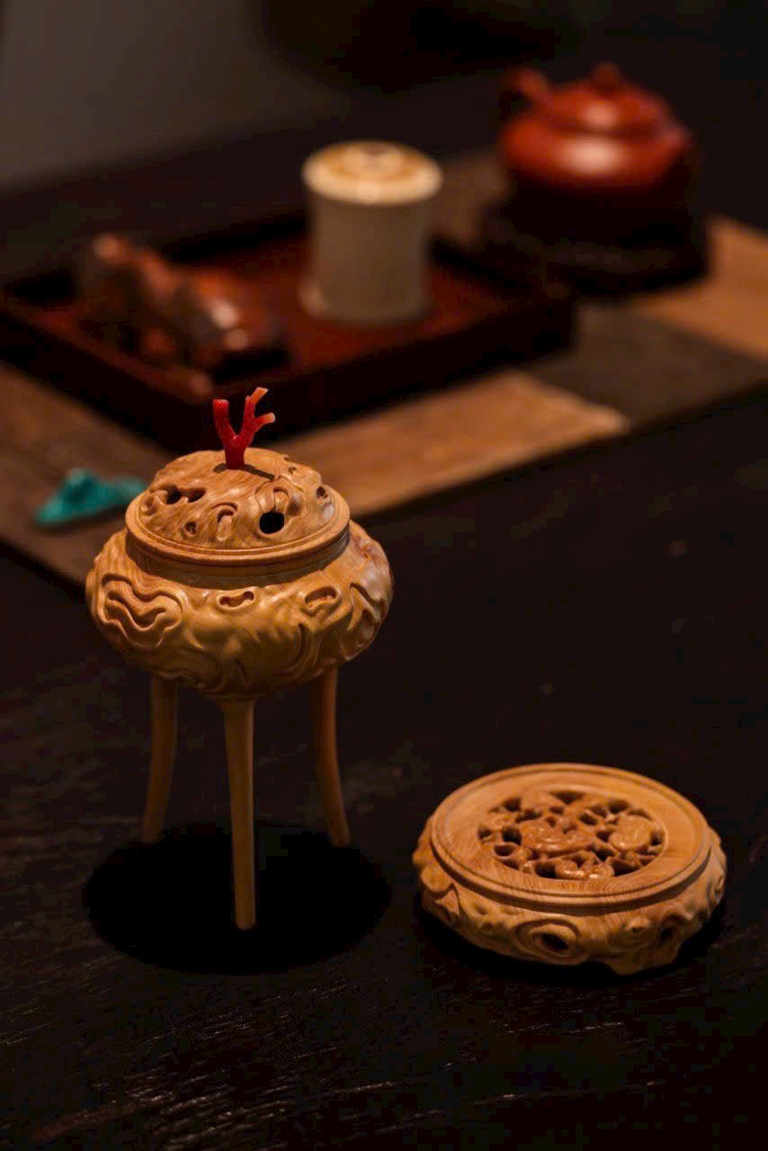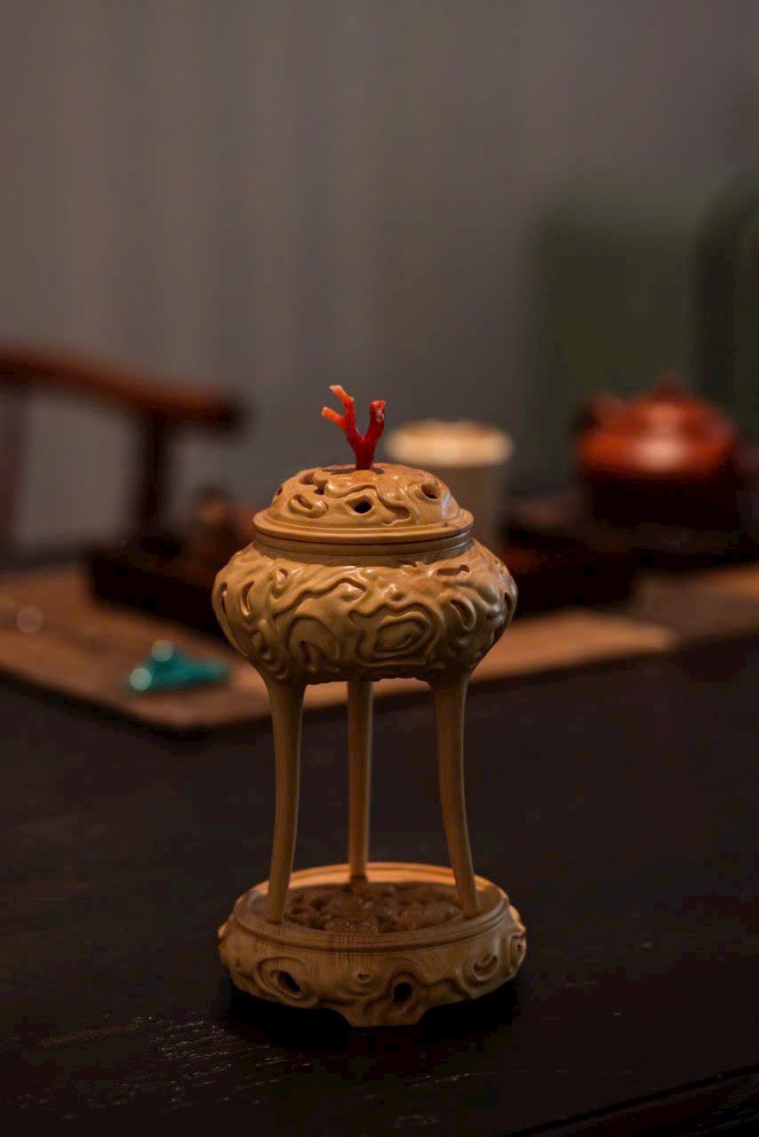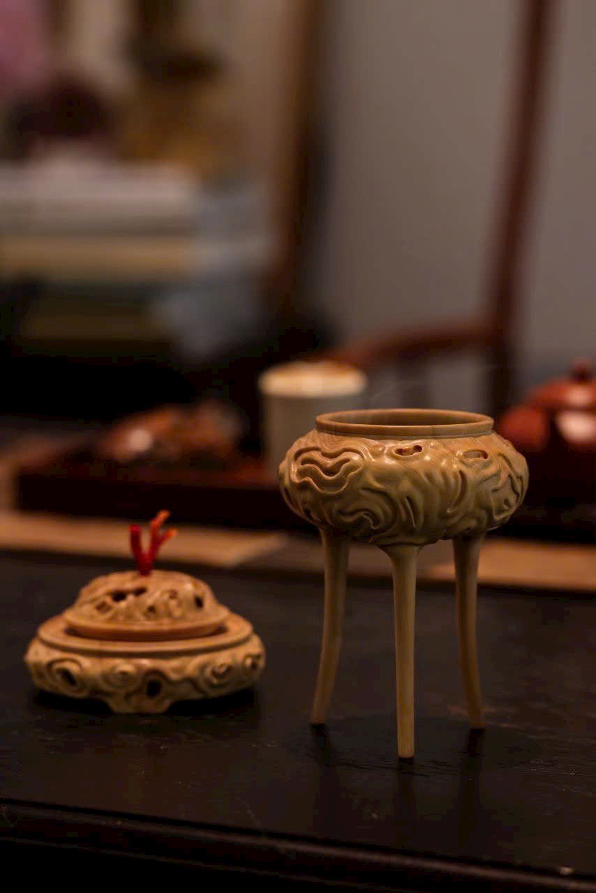 Lư hương ba chân, dáng tự nhiên. Khói trầm bay lên từ nắp khắc rỗng, xoắn quyện không dứt, huyền ảo như chốn bồng lai.