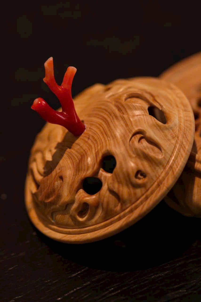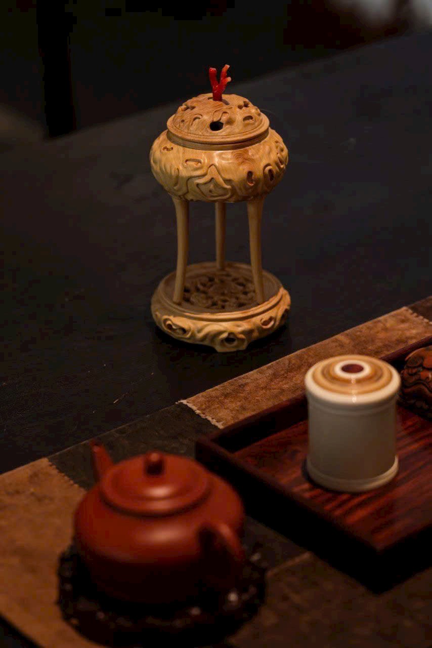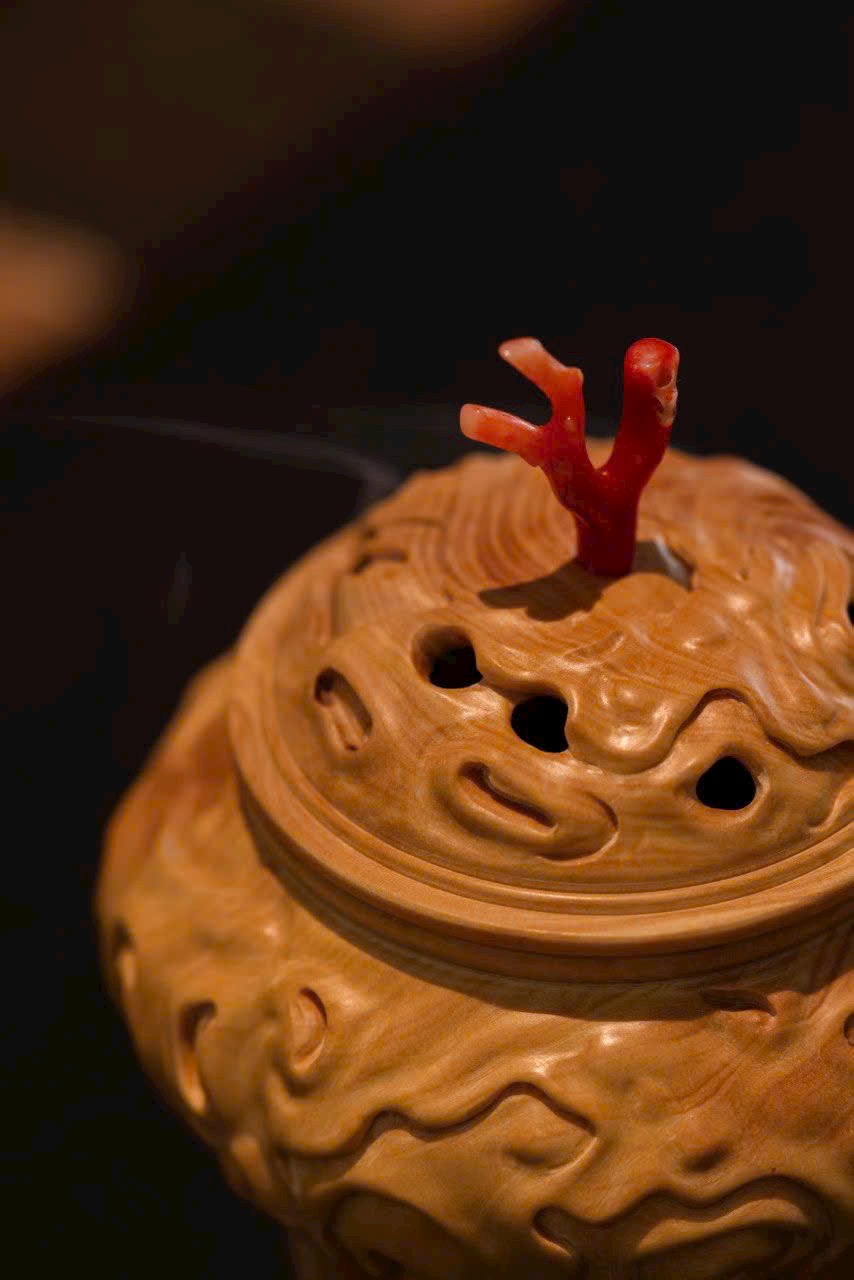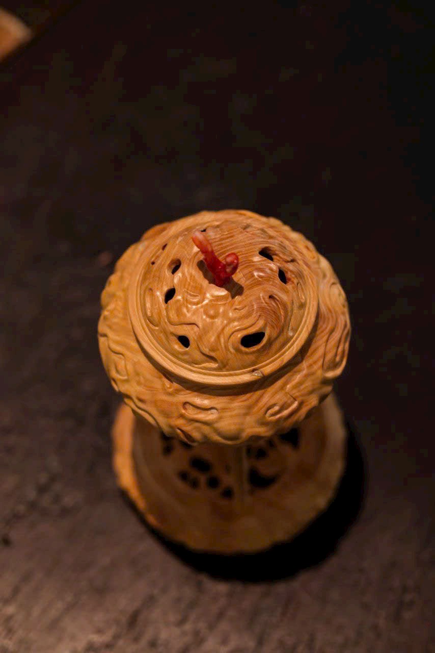 Lư hương ba chân, dáng tự nhiên. Khói trầm bay lên từ nắp khắc rỗng, xoắn quyện không dứt, huyền ảo như chốn bồng lai.