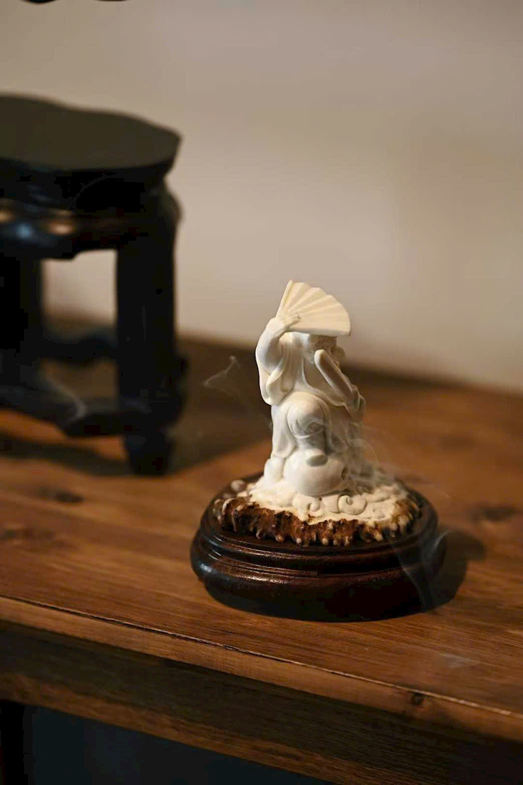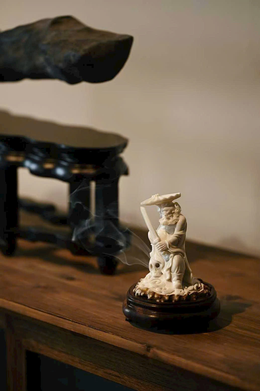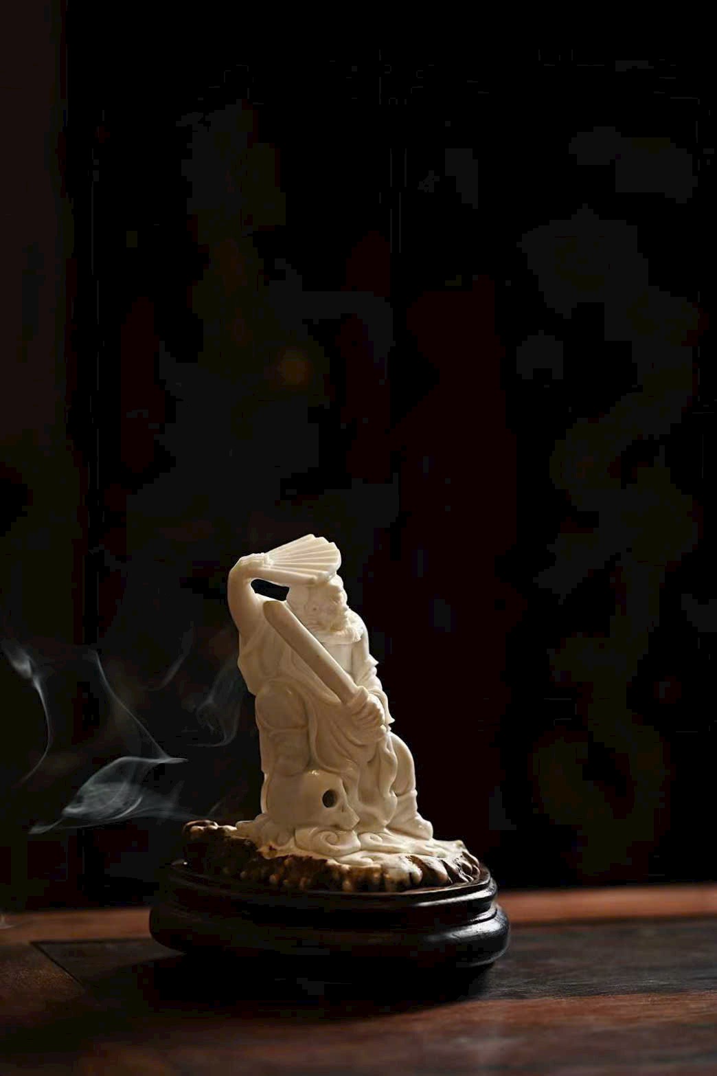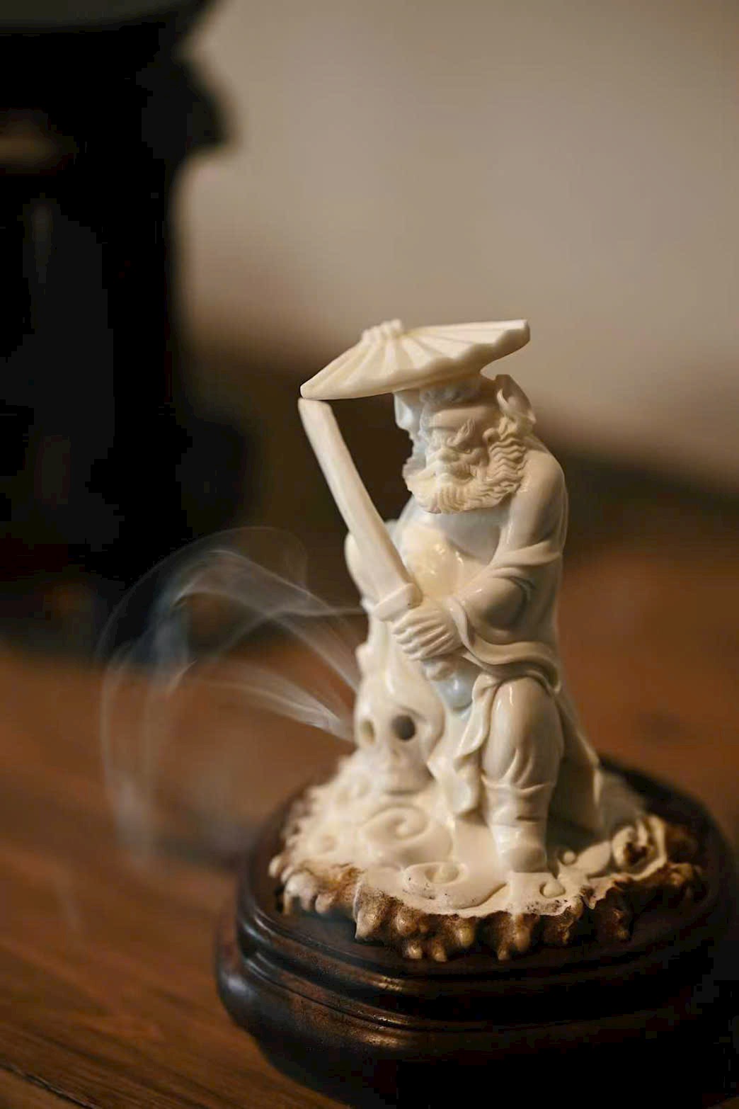 Chất liệu mịn màng, chạm khắc Chung Quỳ với bộ râu tung bay, thần thái và chi tiết khắc họa tinh tế. Tay cầm quạt gấp, toát lên phong thái đặc trưng của Chung Quỳ. Khi đốt hương, khói lan tỏa, độc đáo đầy ý vị.