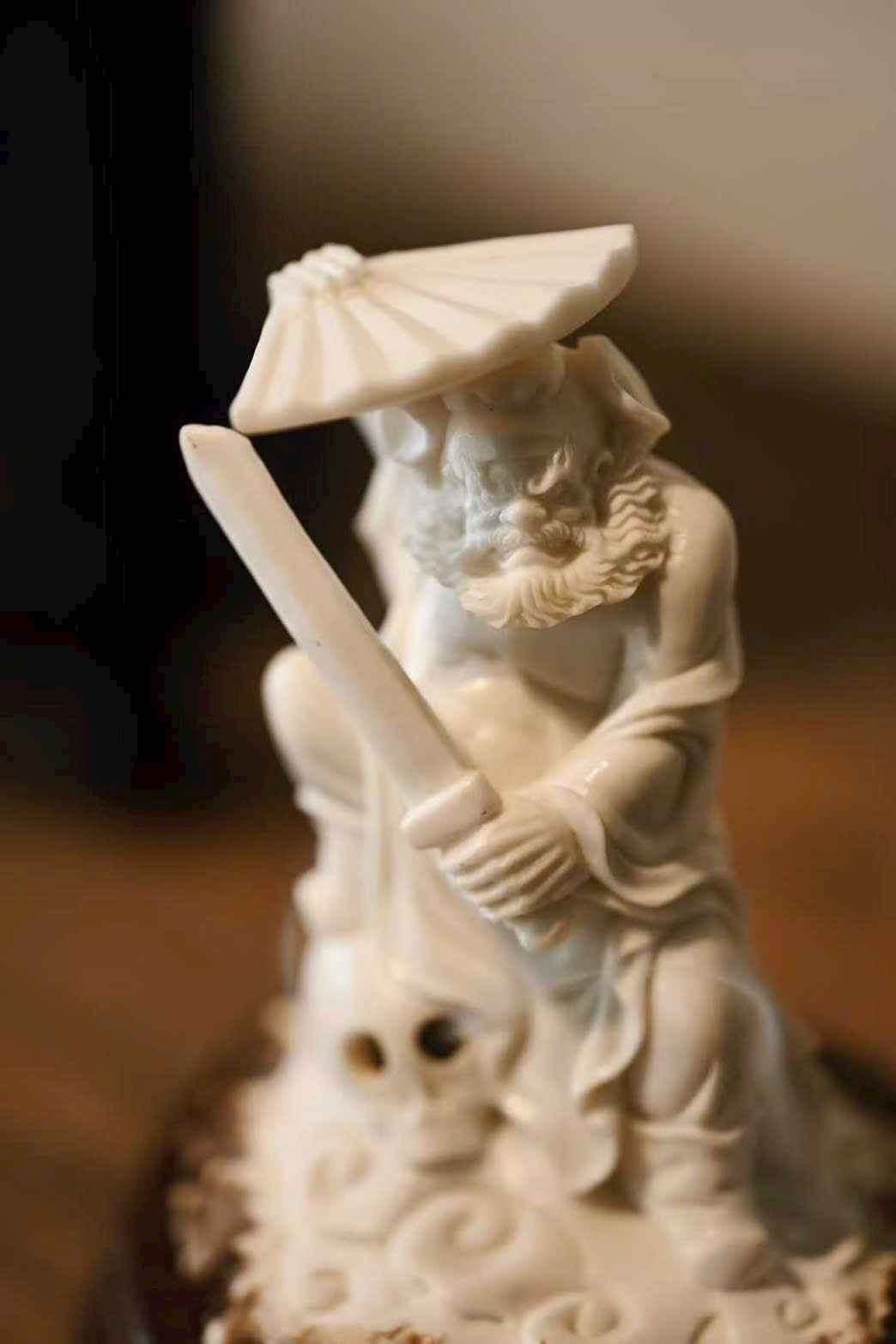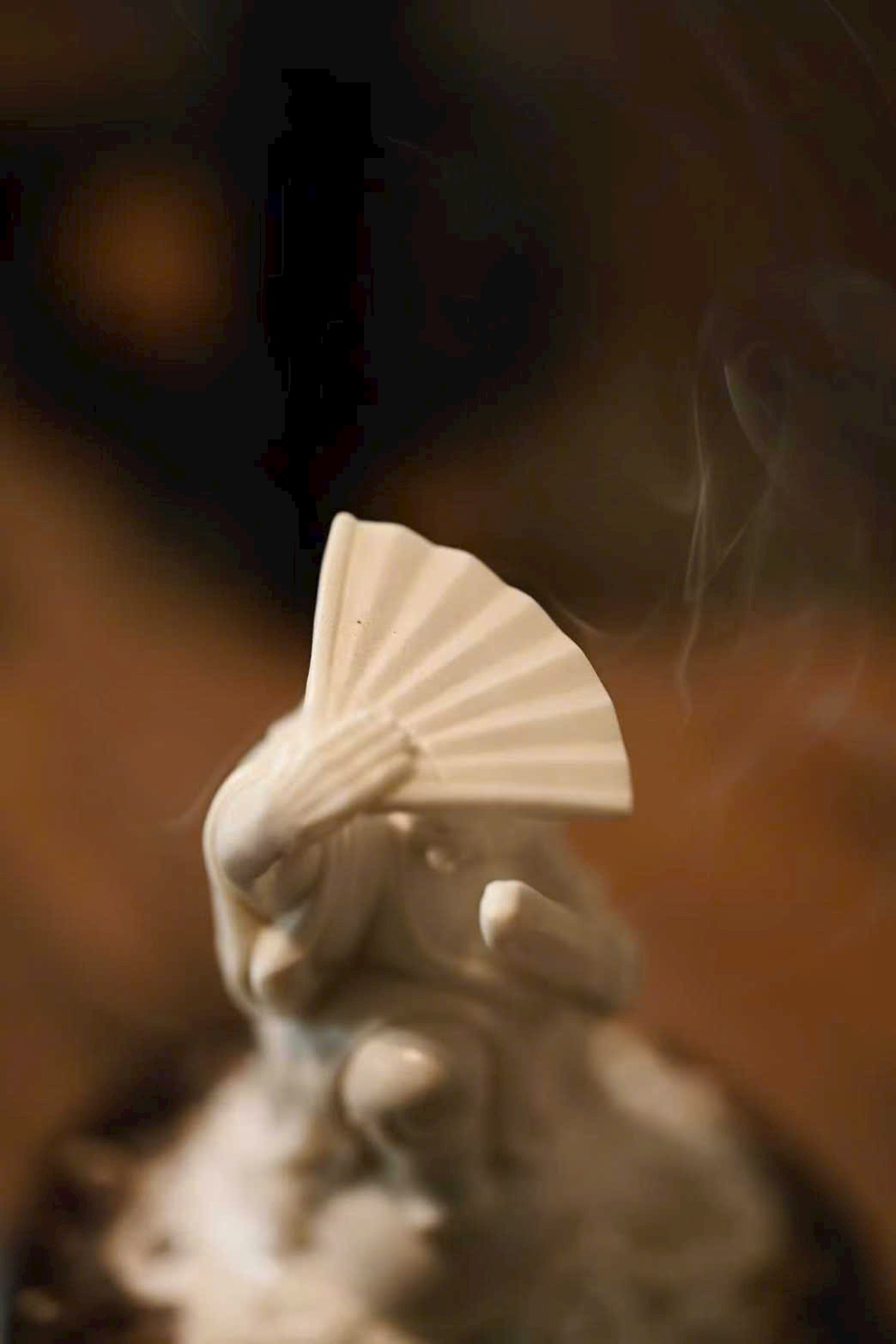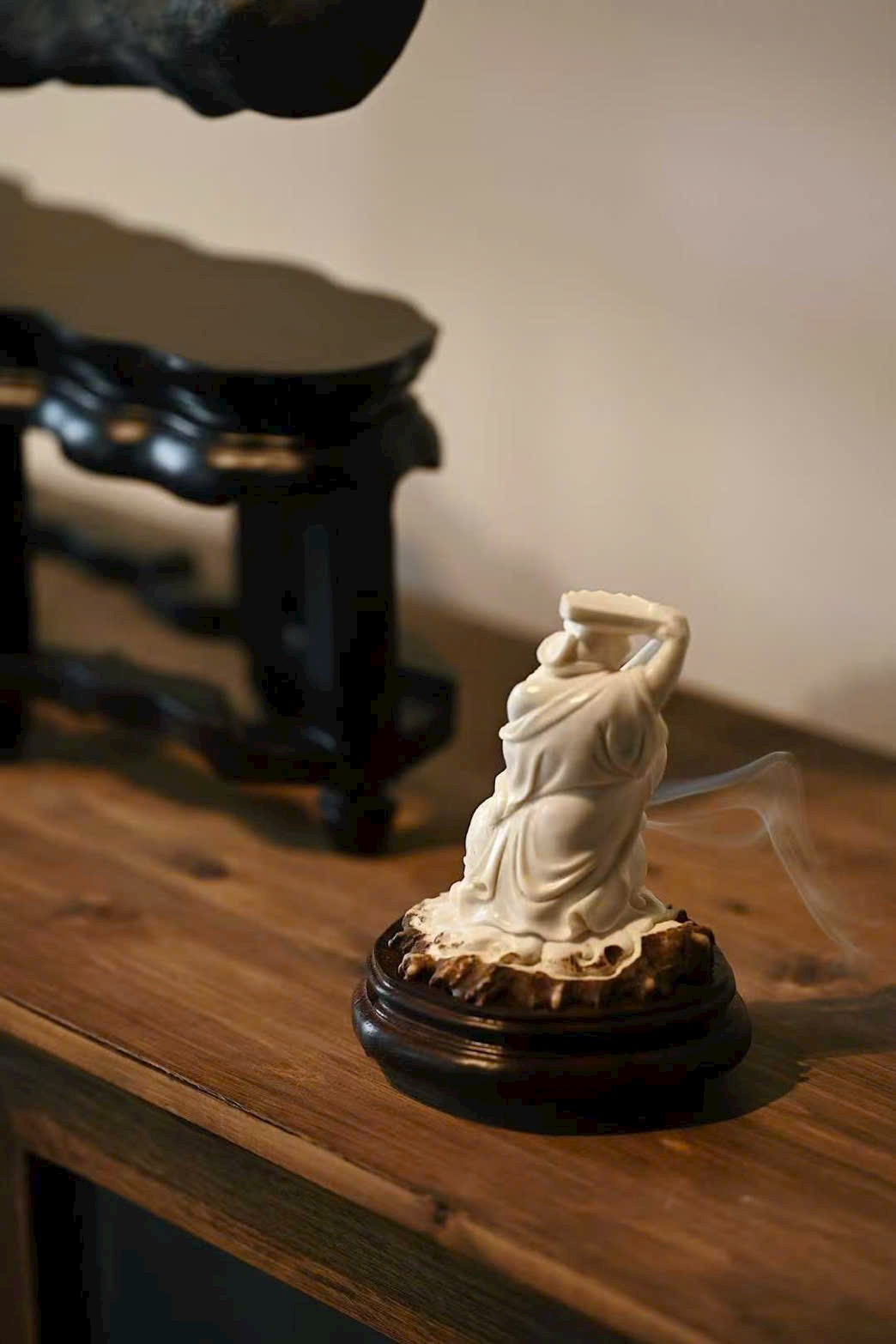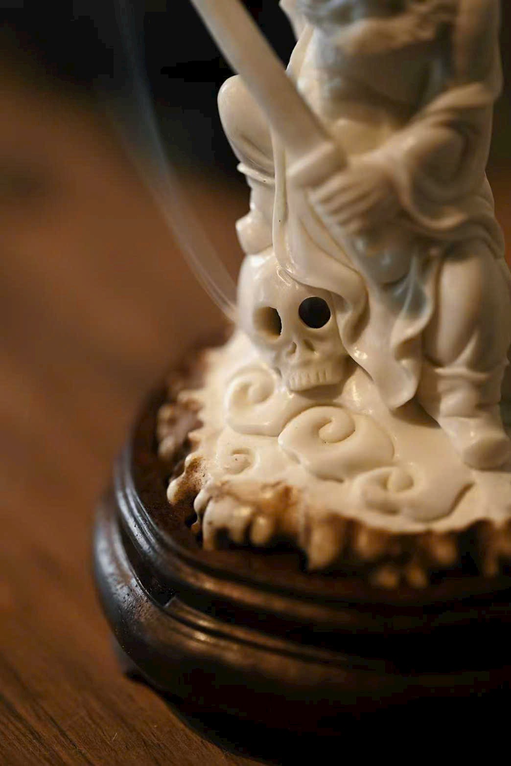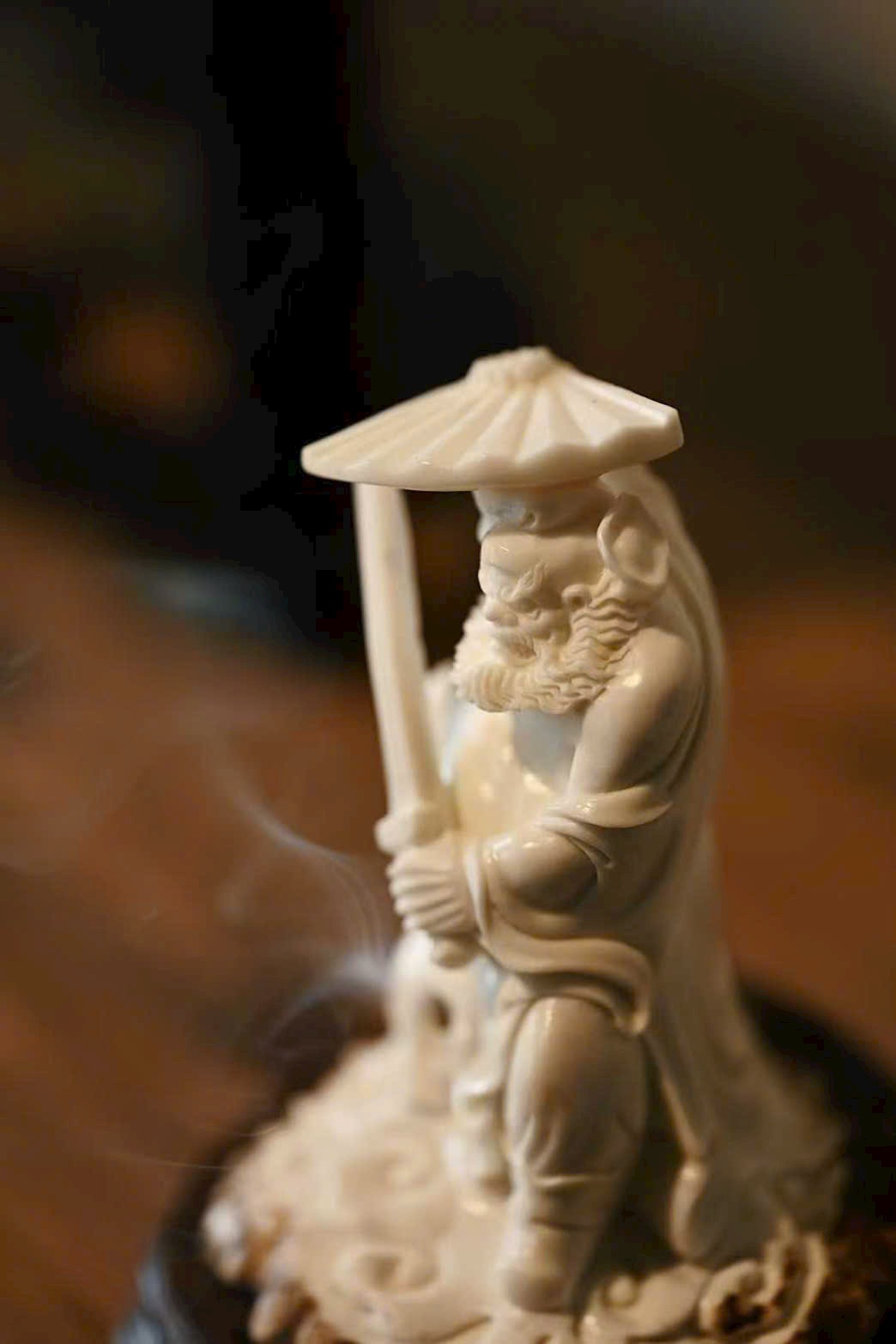 Chất liệu mịn màng, chạm khắc Chung Quỳ với bộ râu tung bay, thần thái và chi tiết khắc họa tinh tế. Tay cầm quạt gấp, toát lên phong thái đặc trưng của Chung Quỳ. Khi đốt hương, khói lan tỏa, độc đáo đầy ý vị.