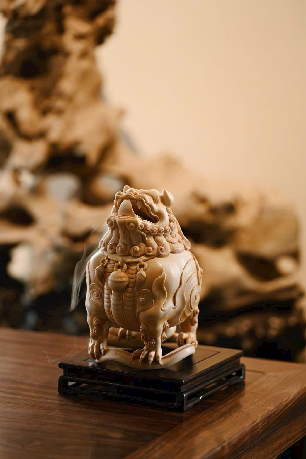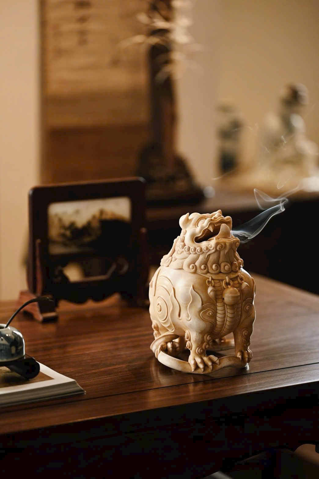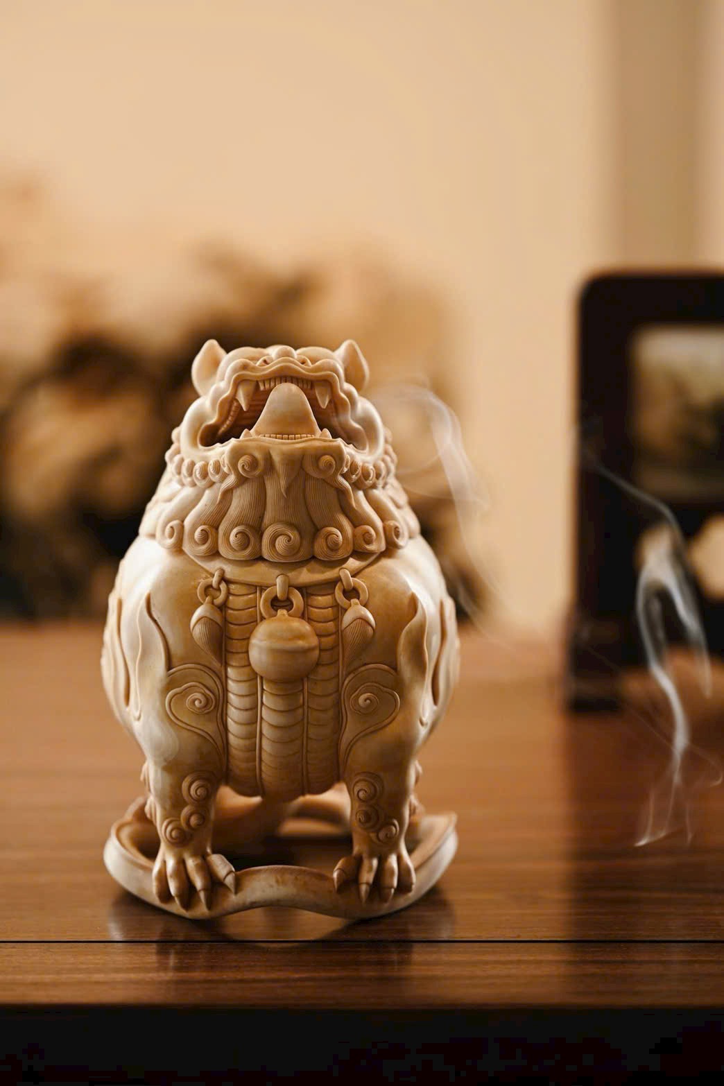 Phiên bản chính sơn, chế tác từ khối liệu nguyên, điêu khắc hình Lộc Đoan với dáng vẻ cường tráng oai nghi. Thân bốn chân vững chãi, giẫm linh xà dưới chân, đầu ngẩng cao đầy khí thế, đôi mắt sáng rực thần uy. Bụng rỗng có thể dùng làm lư hương đốt trầm, phong vận cổ nhã, là bảo khí tuyệt hảo cho thư phòng và nghệ sự hương đạo.