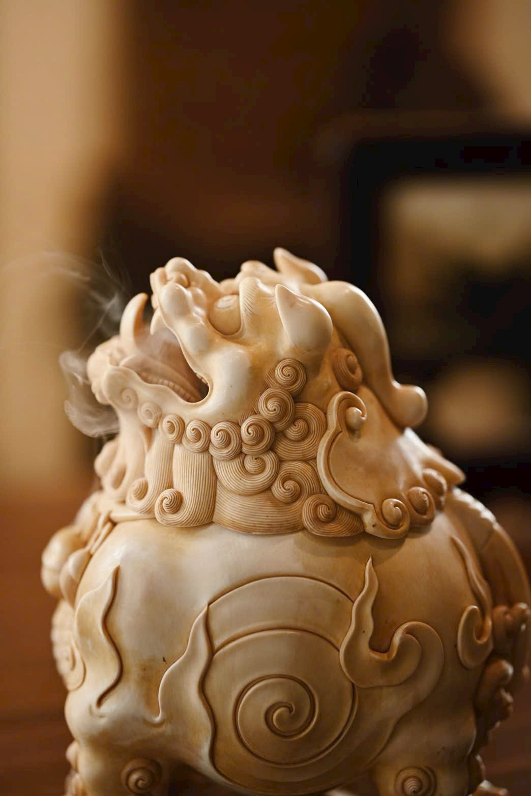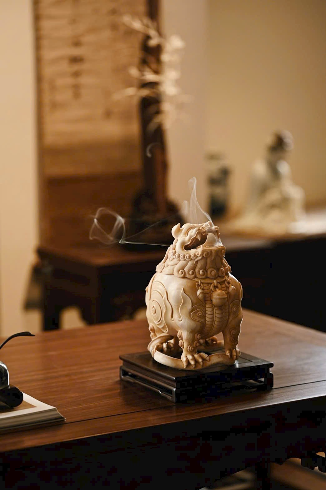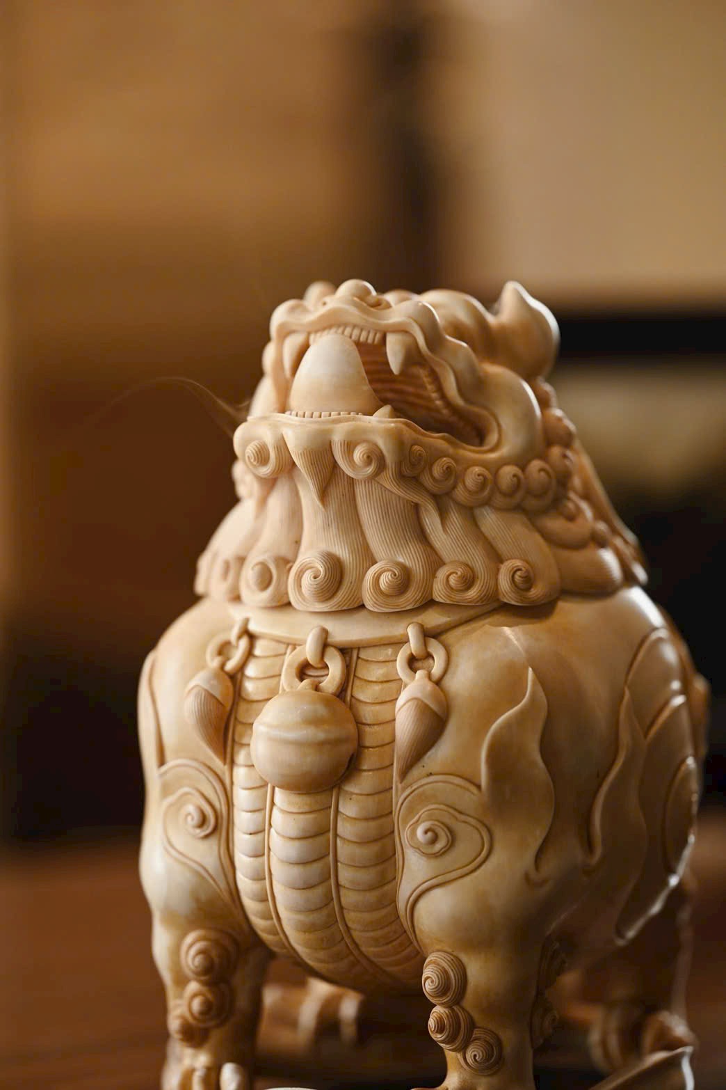 Phiên bản chính sơn, chế tác từ khối liệu nguyên, điêu khắc hình Lộc Đoan với dáng vẻ cường tráng oai nghi. Thân bốn chân vững chãi, giẫm linh xà dưới chân, đầu ngẩng cao đầy khí thế, đôi mắt sáng rực thần uy. Bụng rỗng có thể dùng làm lư hương đốt trầm, phong vận cổ nhã, là bảo khí tuyệt hảo cho thư phòng và nghệ sự hương đạo.