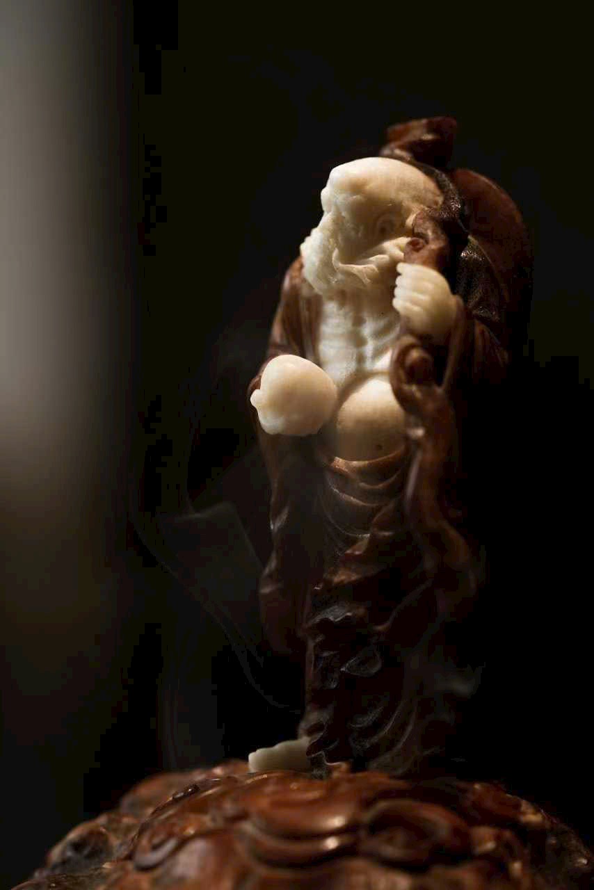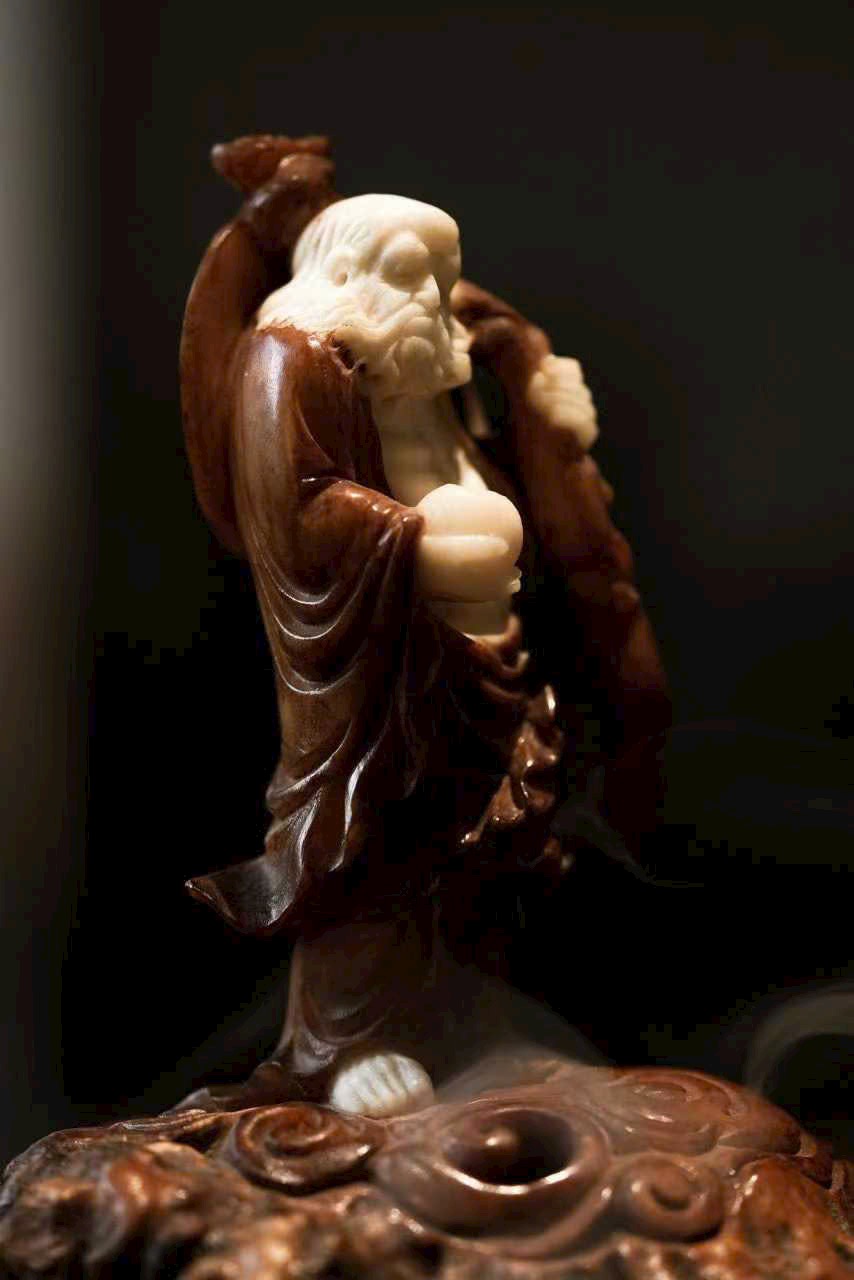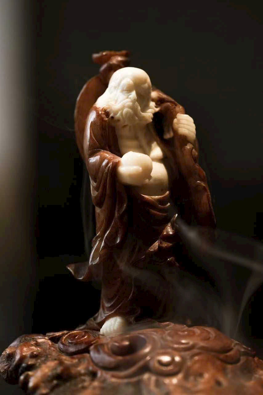 Tác phẩm thủ công toàn bộ, dùng một khối sừng hươu nguyên liệu để tạc thành, hình dáng cổ mộc độc đáo. Phong vận mang tinh thần hòa – tĩnh – thanh – tịch, như Đạt Ma an nhiên giữa núi đá và dòng suối, pháp duyên từ cảnh mà sinh.