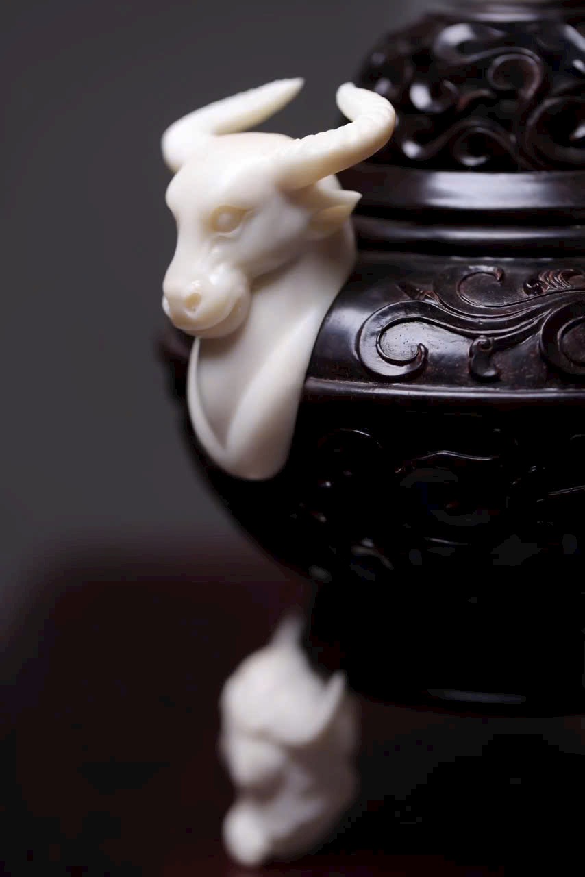 Lư hương được chế tác từ sừng hươu kết hợp gỗ tử đàn quý, tạo hình đầu trâu uy nghiêm với ba chân vững chãi. Vật phẩm mang ý nghĩa trừ tà hộ thân, chiêu tài giữ khí, thích hợp trưng bày thiền thất, thư phòng hay dùng dâng hương tịnh tâm