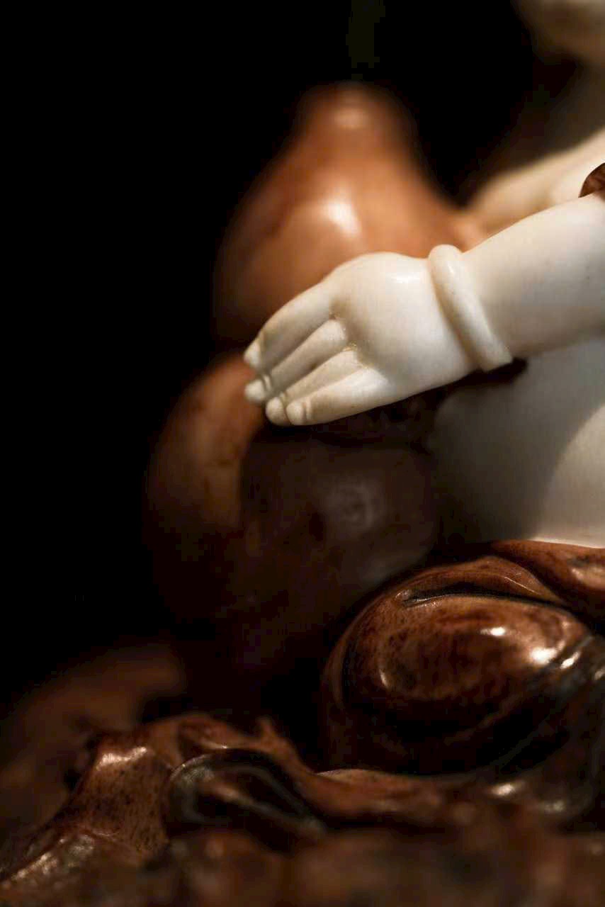 Tác phẩm thuần thủ công, tạo hình tròn đầy – viên mãn, dáng thế tự nhiên uyển chuyển. Tượng Di Lặc mộc mạc mà có thần, không cầu kỳ hoa văn nhưng thần thái sinh động, khuôn mặt tươi cười hiền hòa, đường nét nổi khối rõ ràng, toát lên vẻ phúc hậu – an nhiên. Khi đốt hương, làn khói quyện quanh như mây lành cúng Phật, mang lại cảm giác thanh tịnh, cát tường, hiếm có.