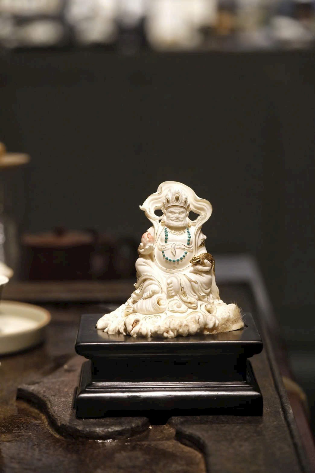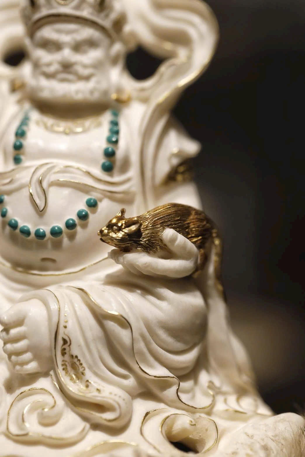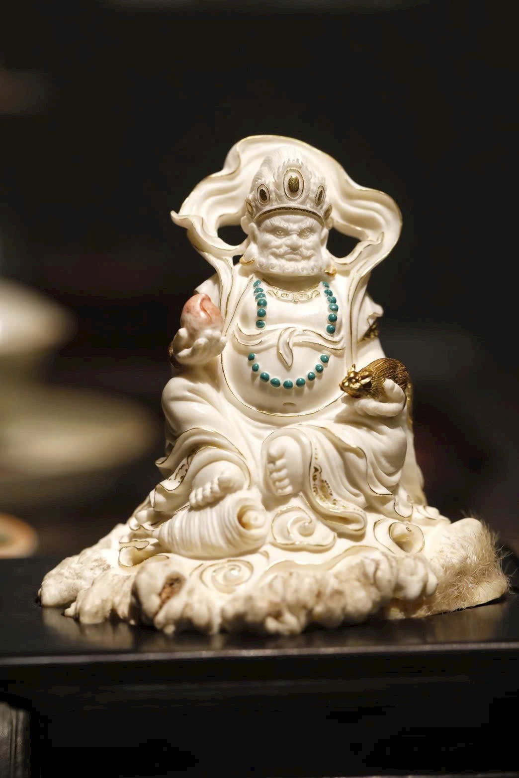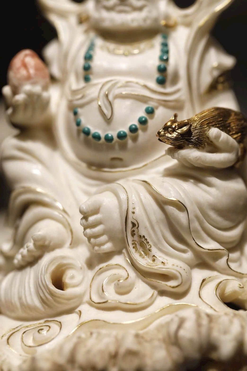 Hoàng Tài Thần đội bảo quan, đeo anh lạc điểm vàng; tay trái nâng chuột nhả châu báu, tay phải cầm bảo châu như ý. Đế lư hương được chế tác tùy hình, lỗ thoát khói ẩn trong nếp áo, khi đốt hương khói bay lên như ánh Phật quang tỏa rạng. Vừa mang ý nghĩa cúng dường, vừa là vật thưởng ngoạn trang nhã.
