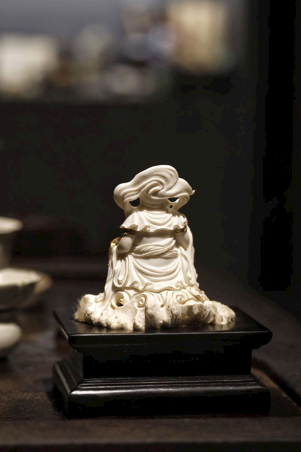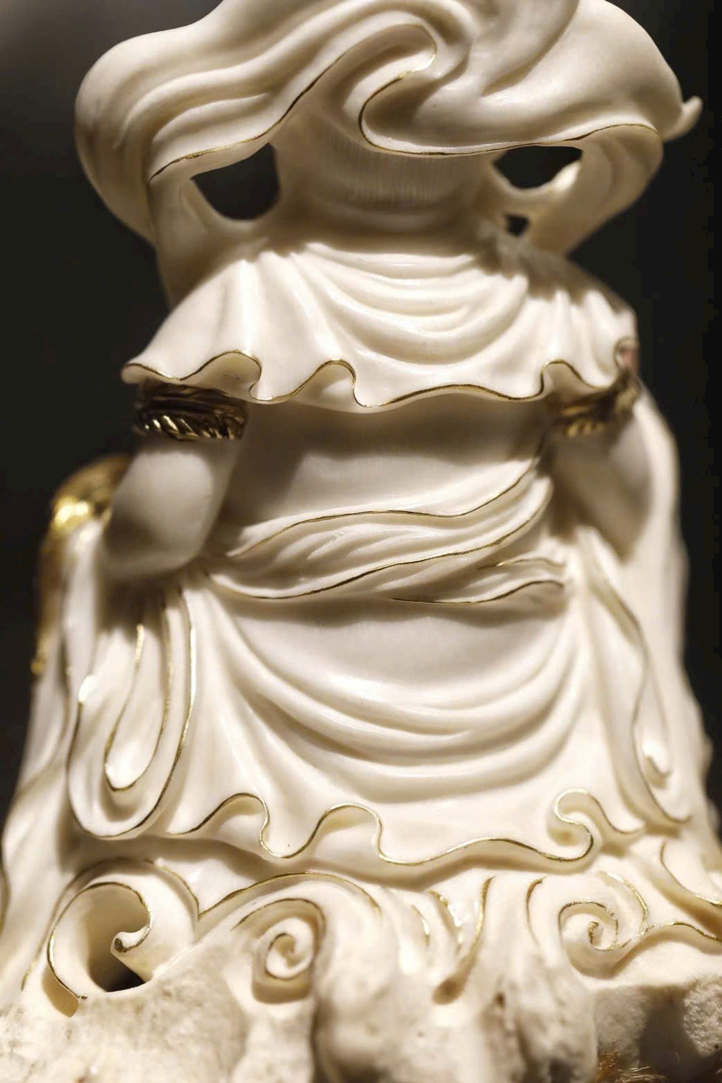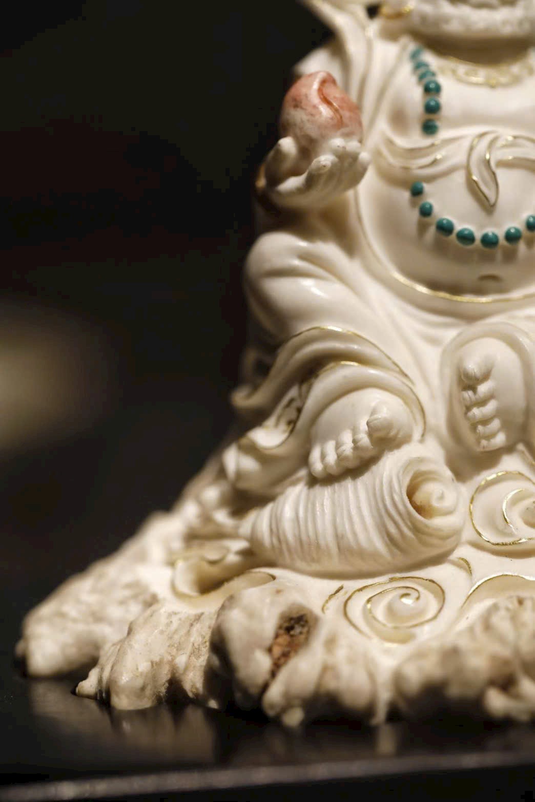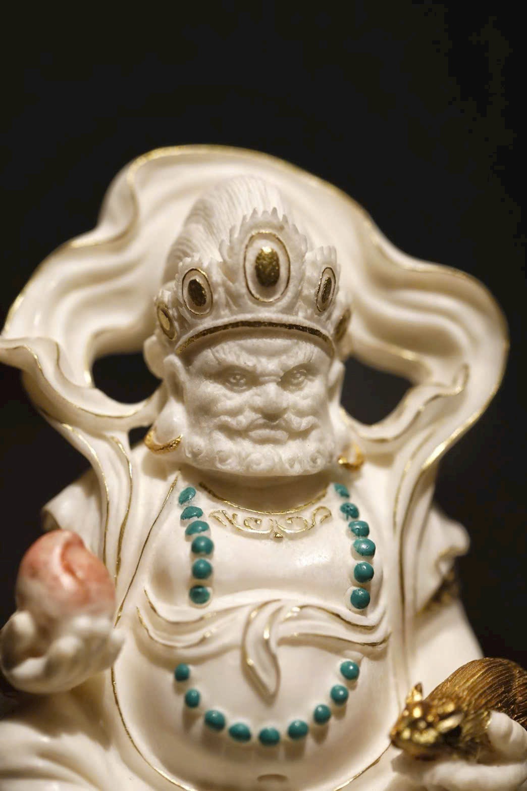 Hoàng Tài Thần đội bảo quan, đeo anh lạc điểm vàng; tay trái nâng chuột nhả châu báu, tay phải cầm bảo châu như ý. Đế lư hương được chế tác tùy hình, lỗ thoát khói ẩn trong nếp áo, khi đốt hương khói bay lên như ánh Phật quang tỏa rạng. Vừa mang ý nghĩa cúng dường, vừa là vật thưởng ngoạn trang nhã.