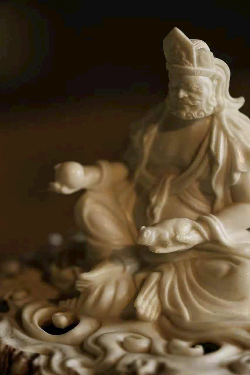 Toàn tác thủ công, thần thái khắc họa chuẩn xác, đôi mắt tròn mở, khí thế uy nghi, đường bệ. Một tay nhẹ nâng chuột nhả châu báu, một tay cầm đào. Thích hợp an trí trên án thờ, hương khói lượn quanh, chiêu tài tụ phúc.