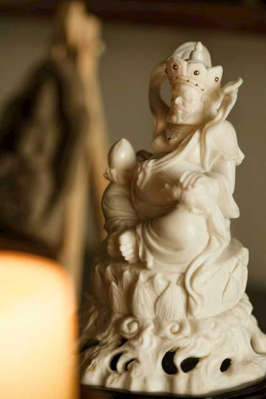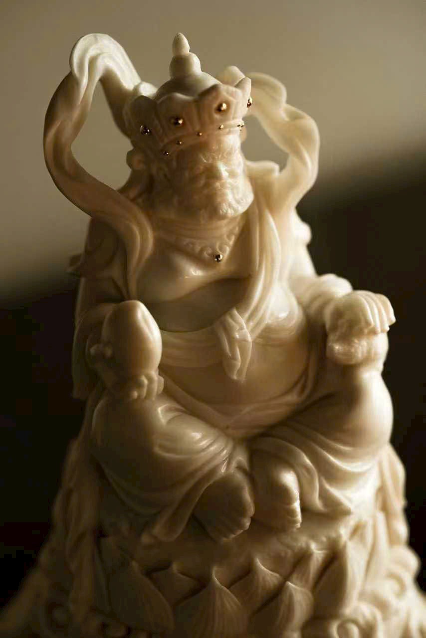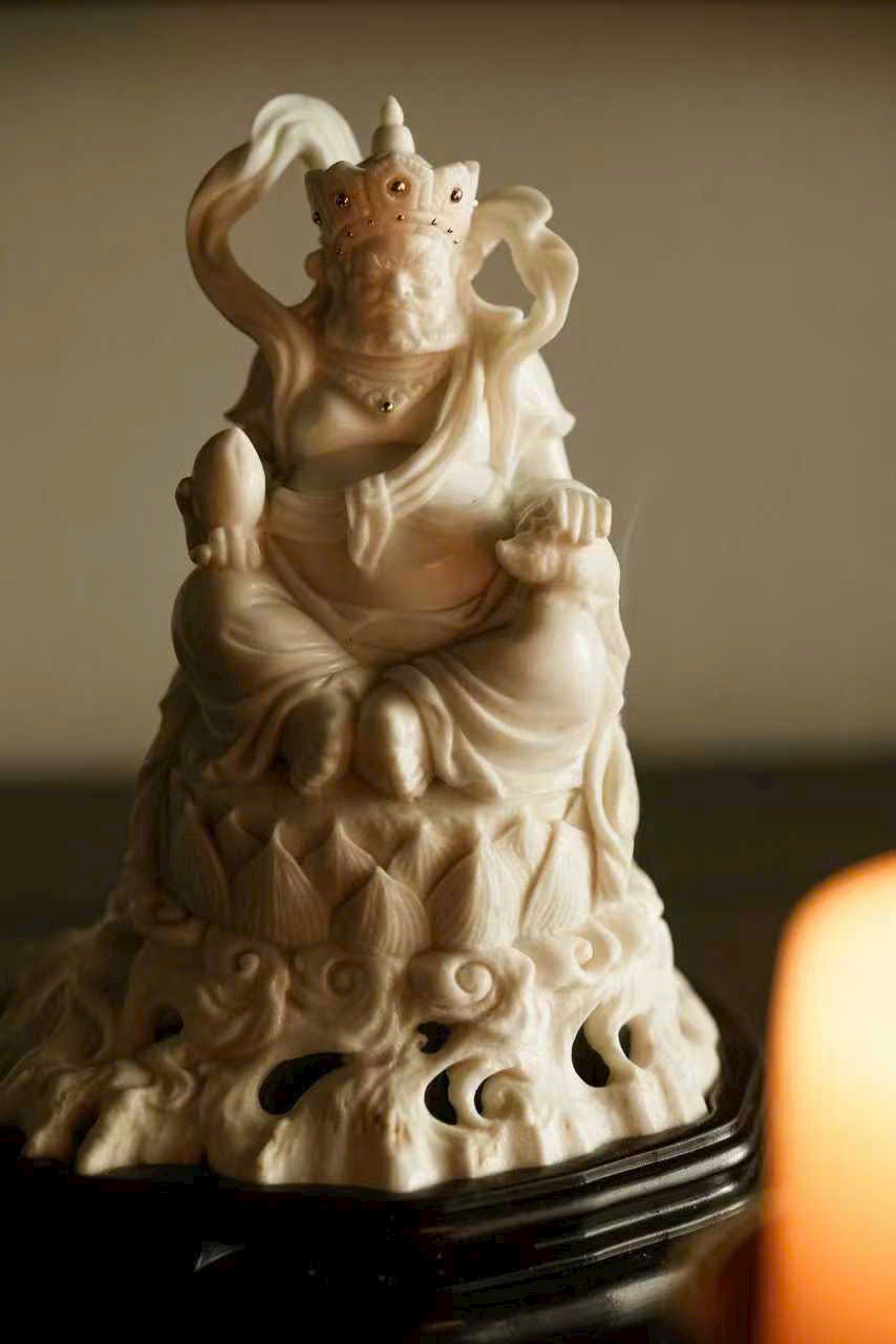 Tác phẩm toàn bộ chế tác thủ công, dáng hình sinh động, thần thái chuẩn xác. Đôi mắt mở tròn, uy nghi và quyền lực; một tay nâng Chuột Tài Lộc, tay kia cầm Đào, thể hiện sự từ bi và cát tường.