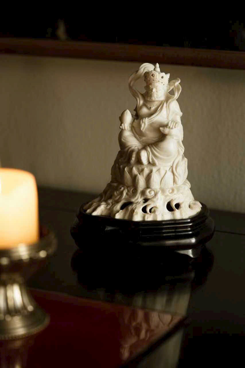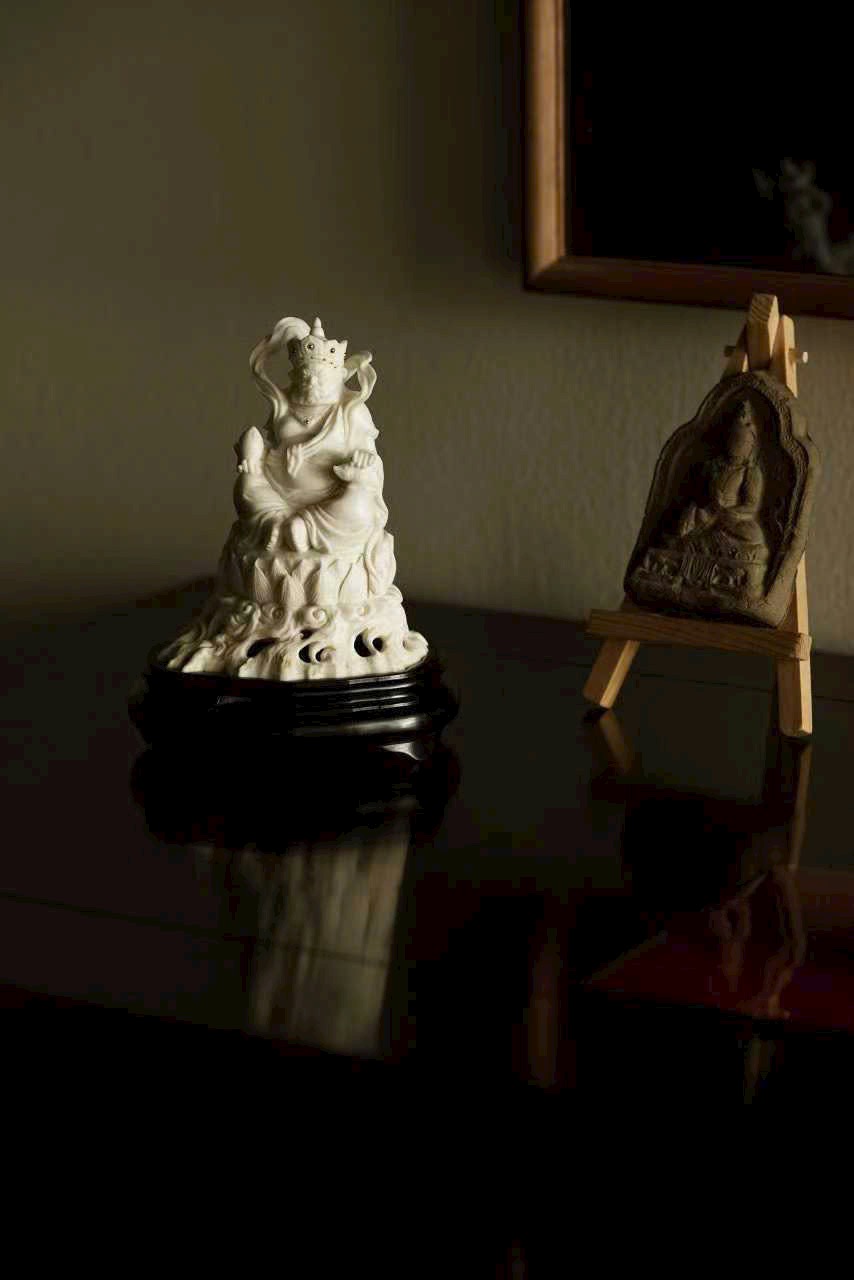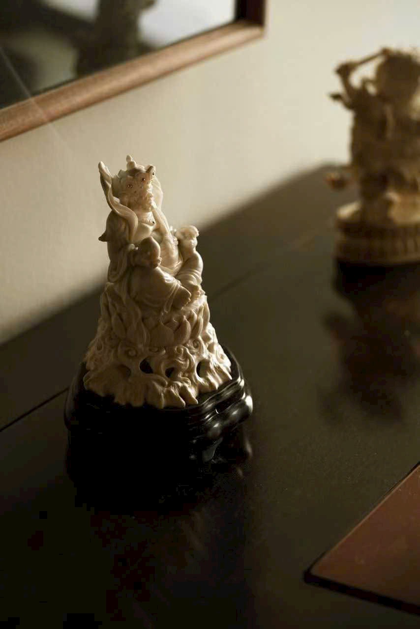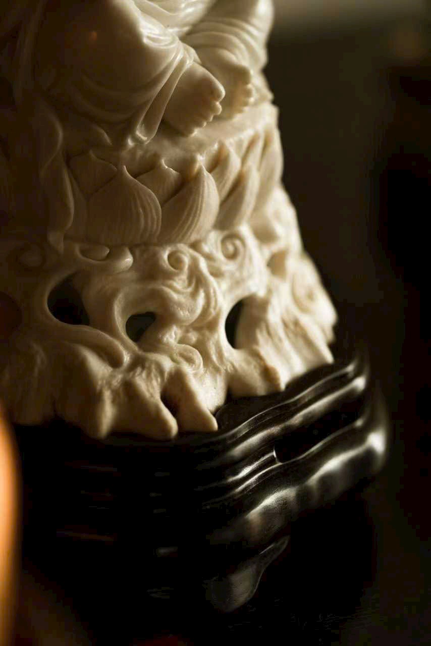 Tác phẩm toàn bộ chế tác thủ công, dáng hình sinh động, thần thái chuẩn xác. Đôi mắt mở tròn, uy nghi và quyền lực; một tay nâng Chuột Tài Lộc, tay kia cầm Đào, thể hiện sự từ bi và cát tường.