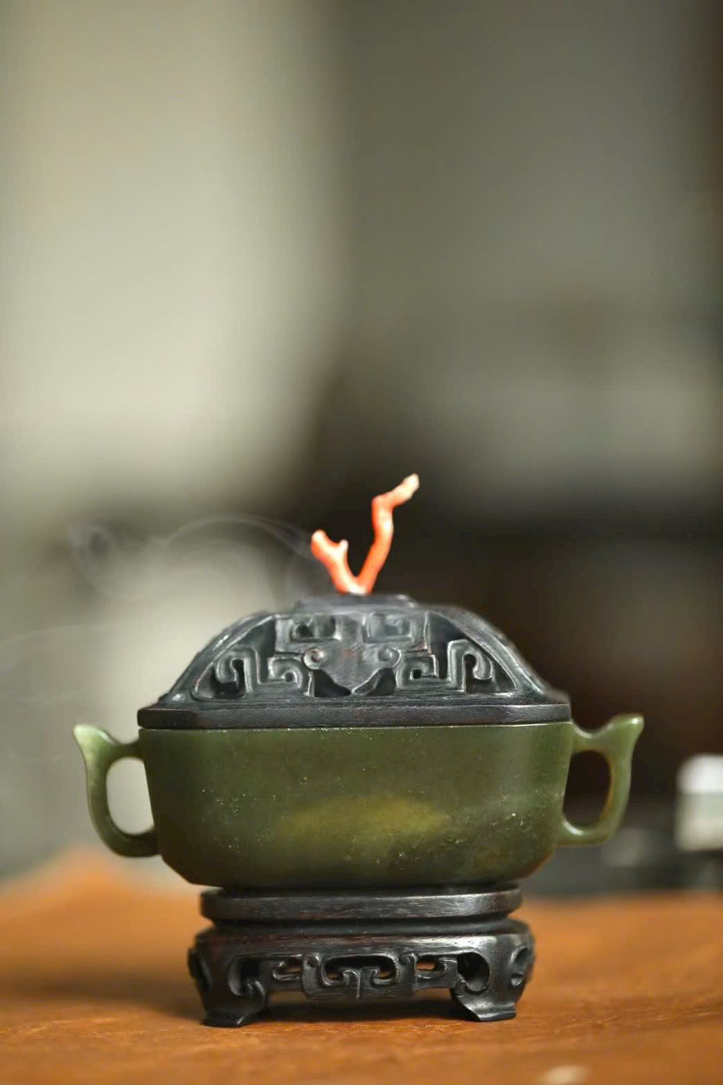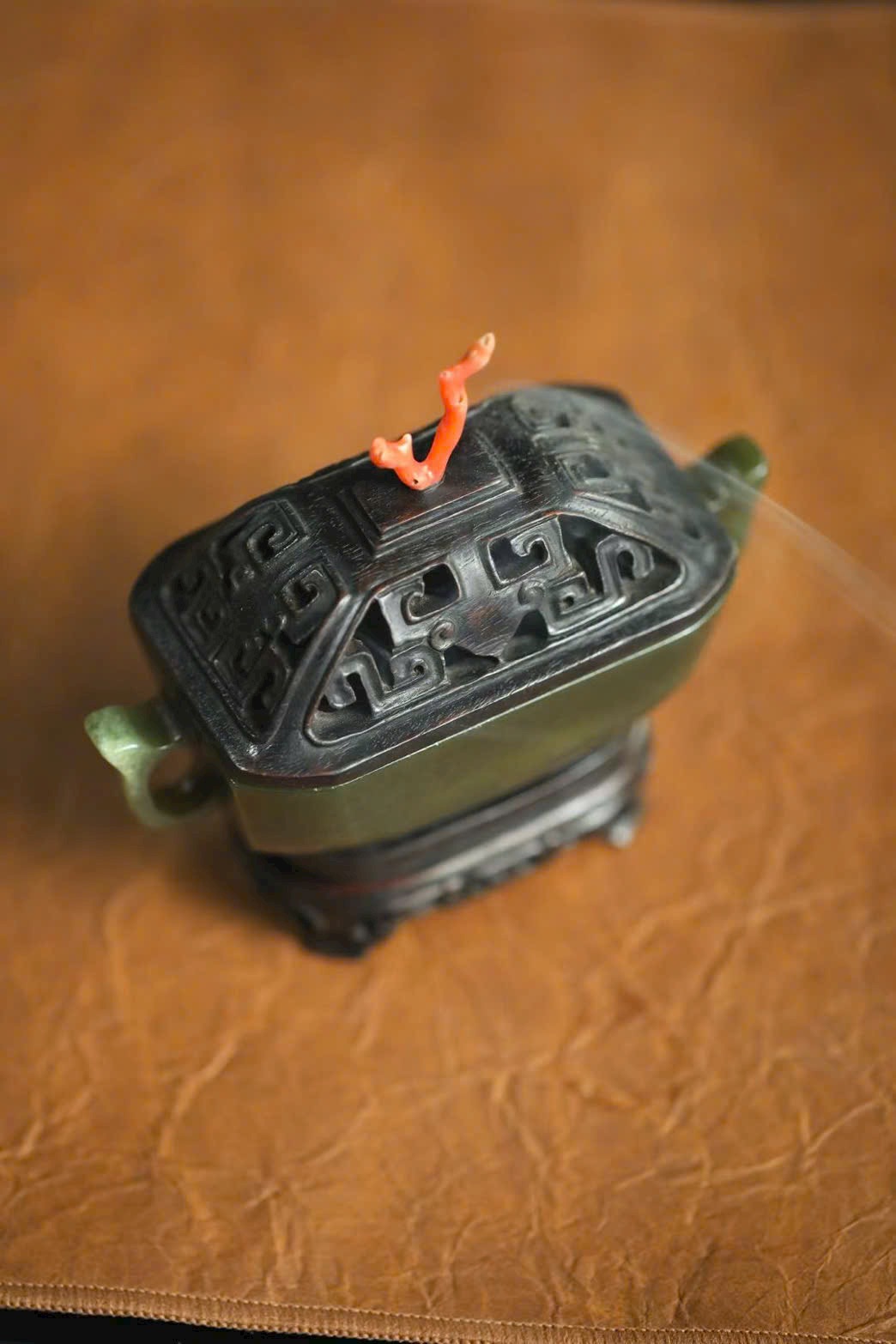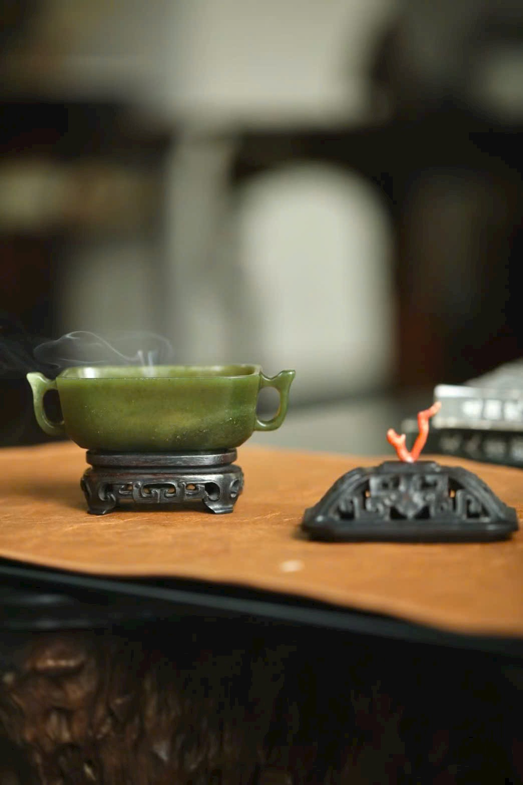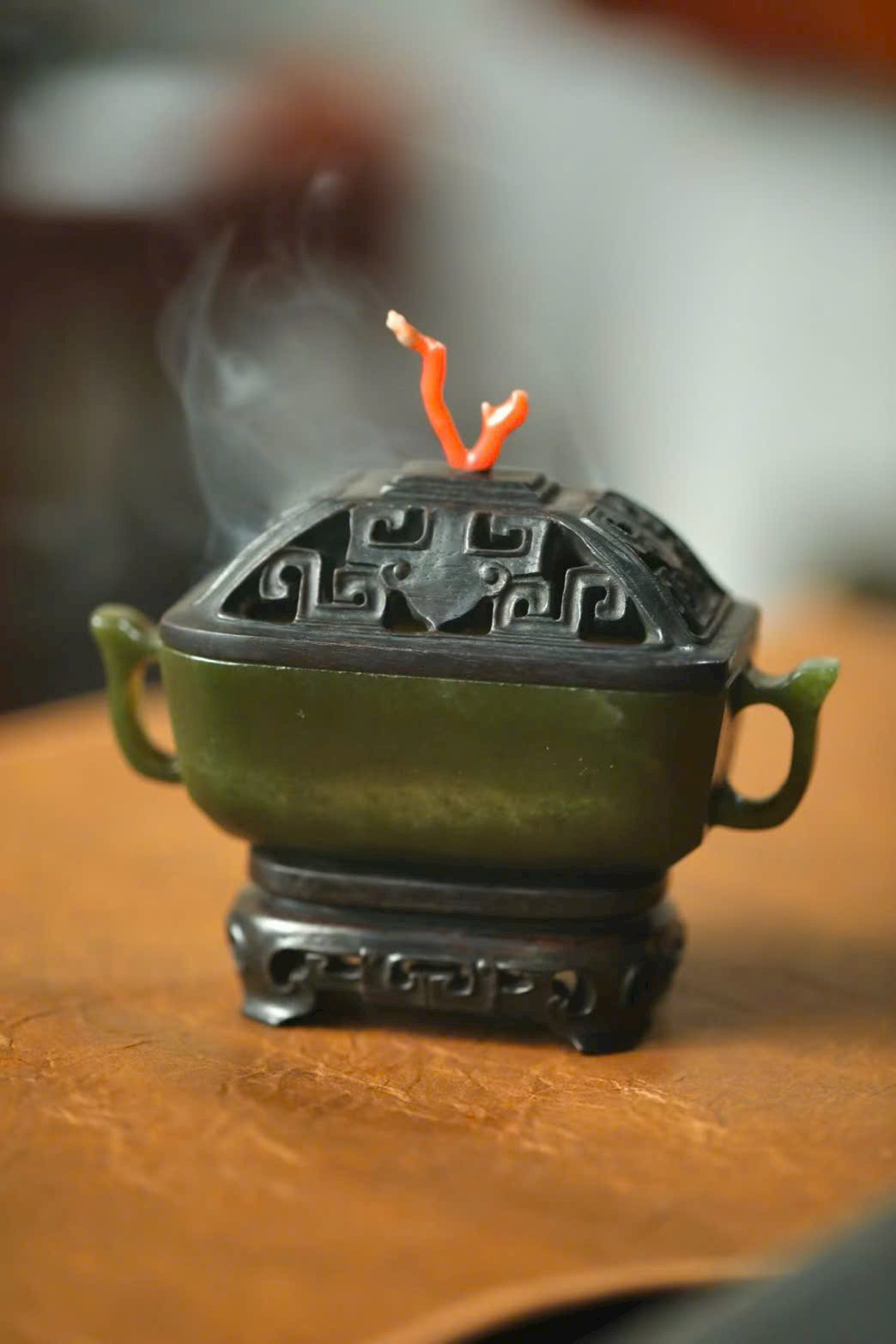 Lư hương làm từ ngọc Hoà Điền thanh thoát, kết hợp nắp và đế gỗ tinh xảo, mang đậm phong vị cổ xưa. Khi đốt hương, làn khói mỏng hòa quyện cùng vẻ thanh nhã của ngọc, tạo nên không gian tĩnh lặng, rất thích hợp cho thư phòng, thể hiện trọn vẹn tinh thần mỹ học phương Đông.