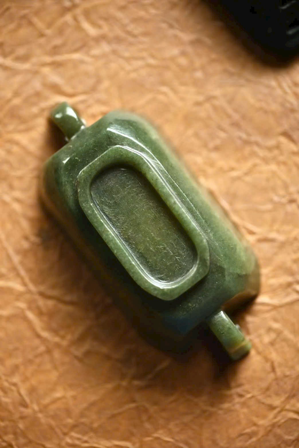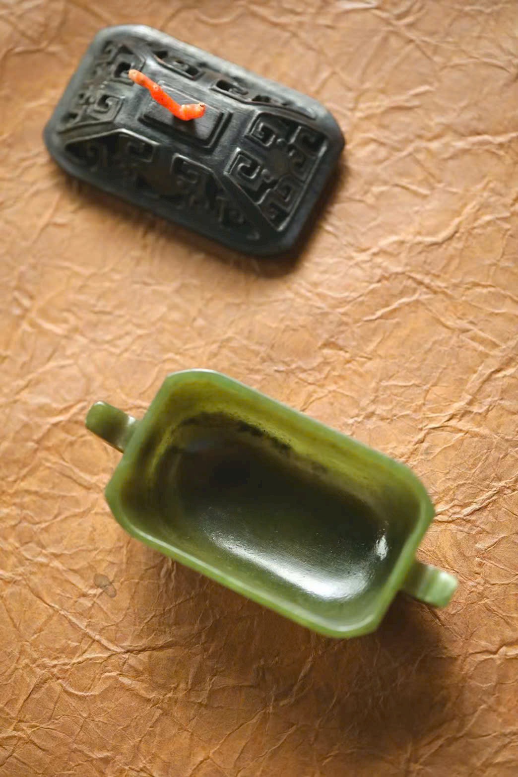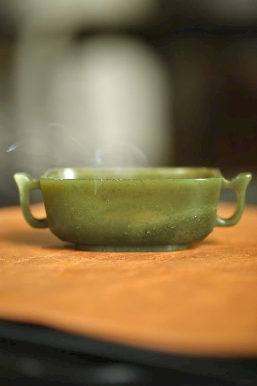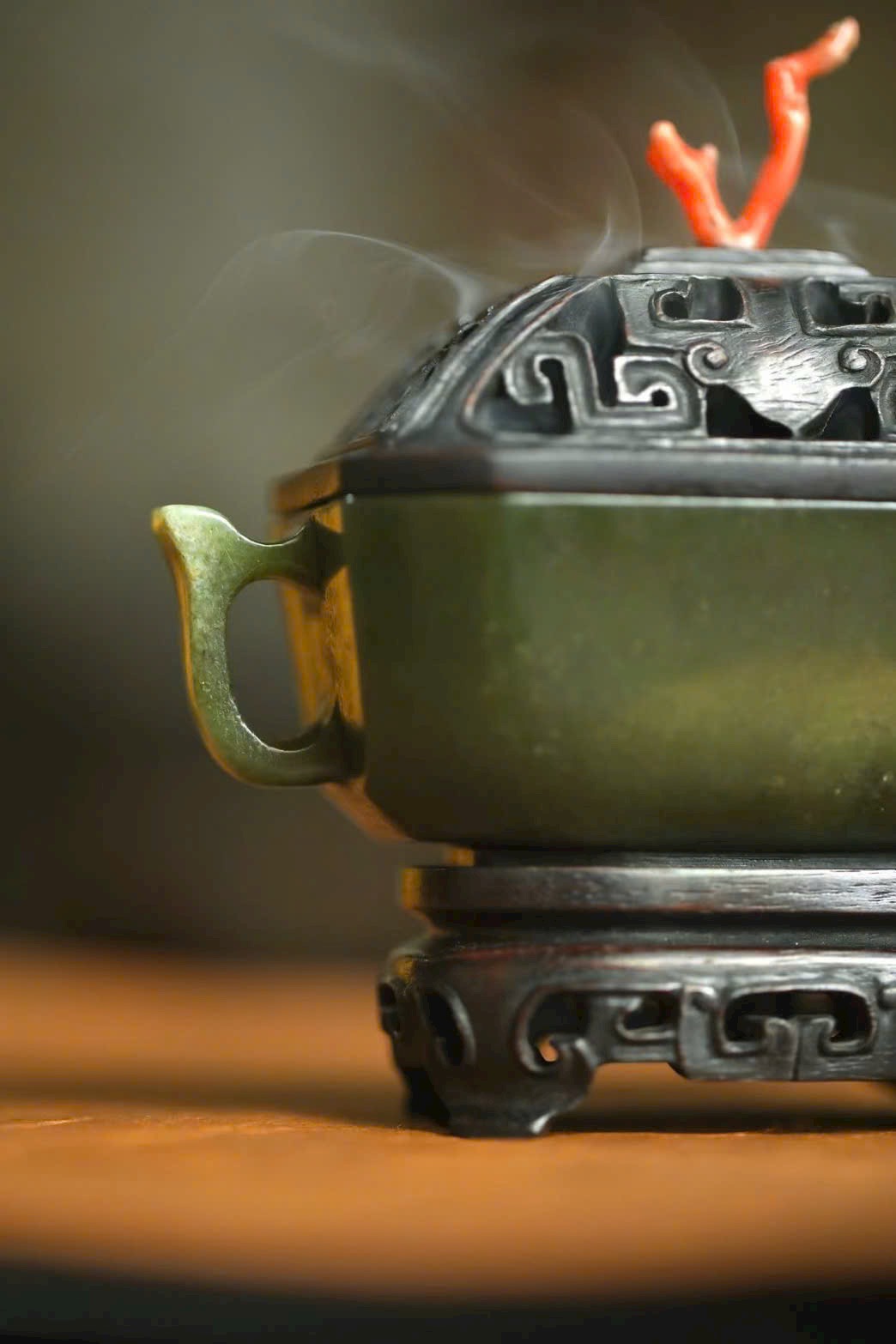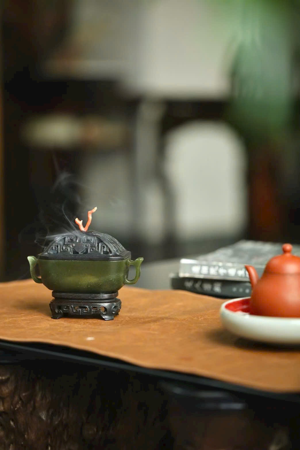 Lư hương làm từ ngọc Hoà Điền thanh thoát, kết hợp nắp và đế gỗ tinh xảo, mang đậm phong vị cổ xưa. Khi đốt hương, làn khói mỏng hòa quyện cùng vẻ thanh nhã của ngọc, tạo nên không gian tĩnh lặng, rất thích hợp cho thư phòng, thể hiện trọn vẹn tinh thần mỹ học phương Đông.