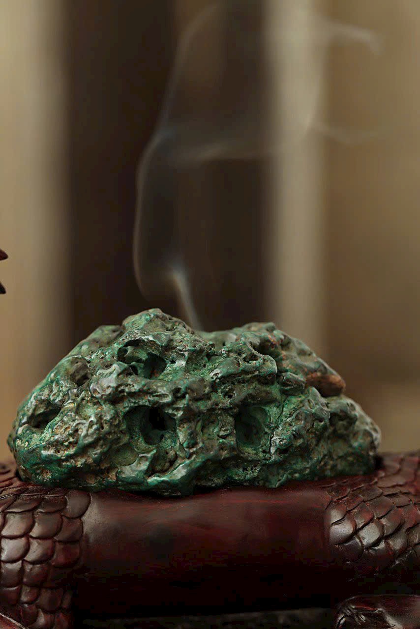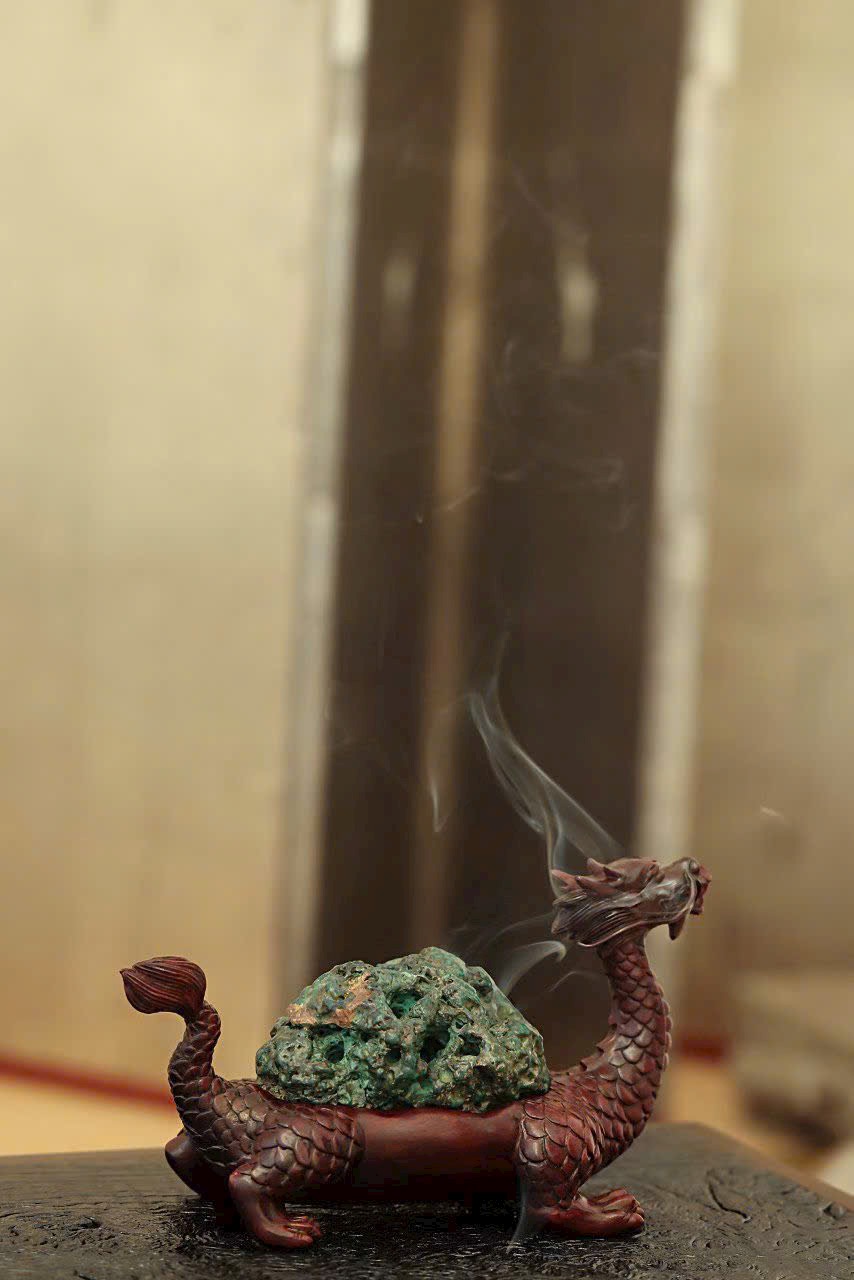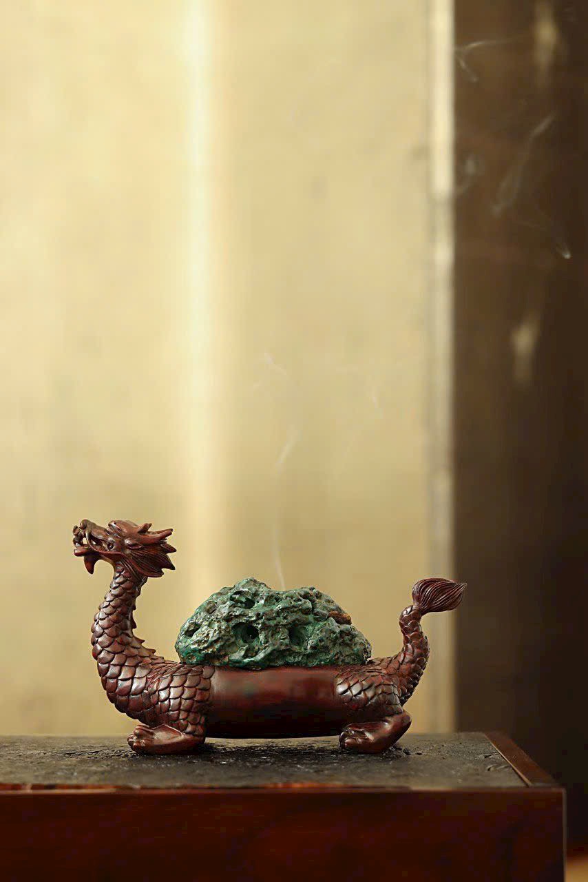 Lư hương Long Quy chạm khắc tinh xảo, vảy và móng hiện rõ, thần thái sống động. Khảm malachite tự nhiên sắc xanh trầm cổ kính, giữa làn khói hương bảng lảng ẩn chứa điềm lành cát tường.