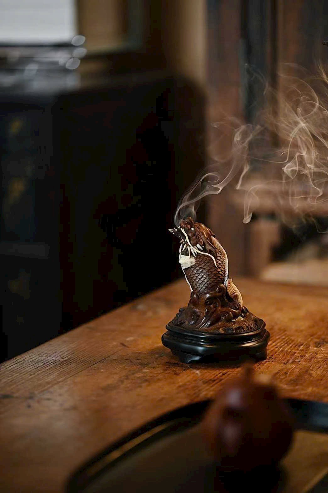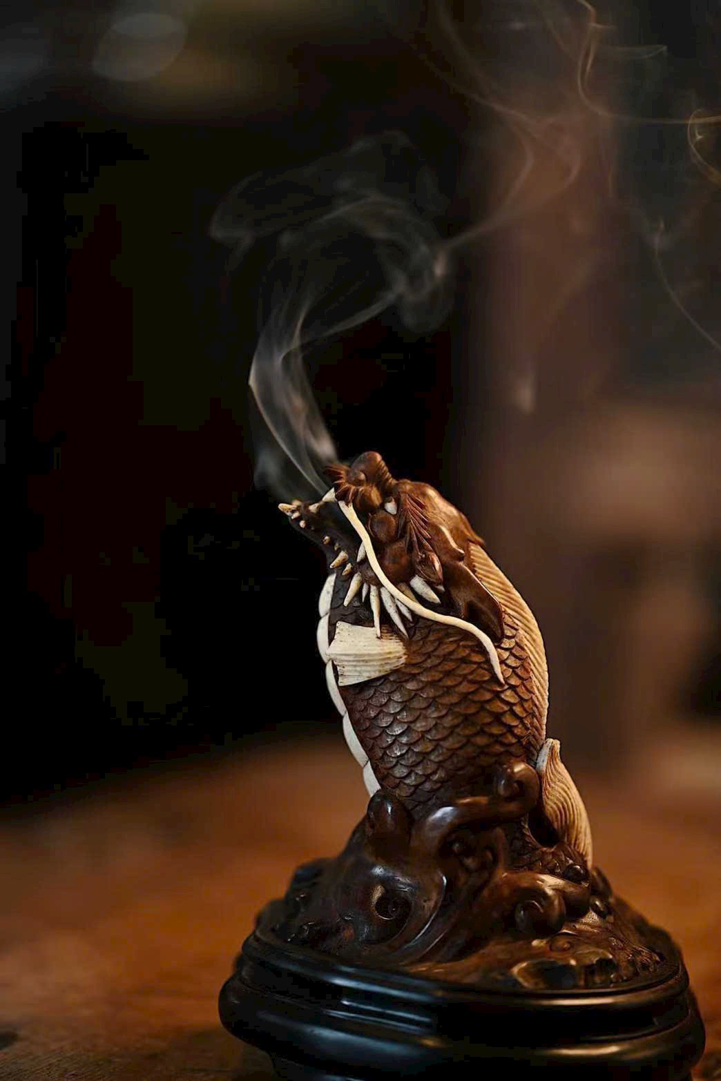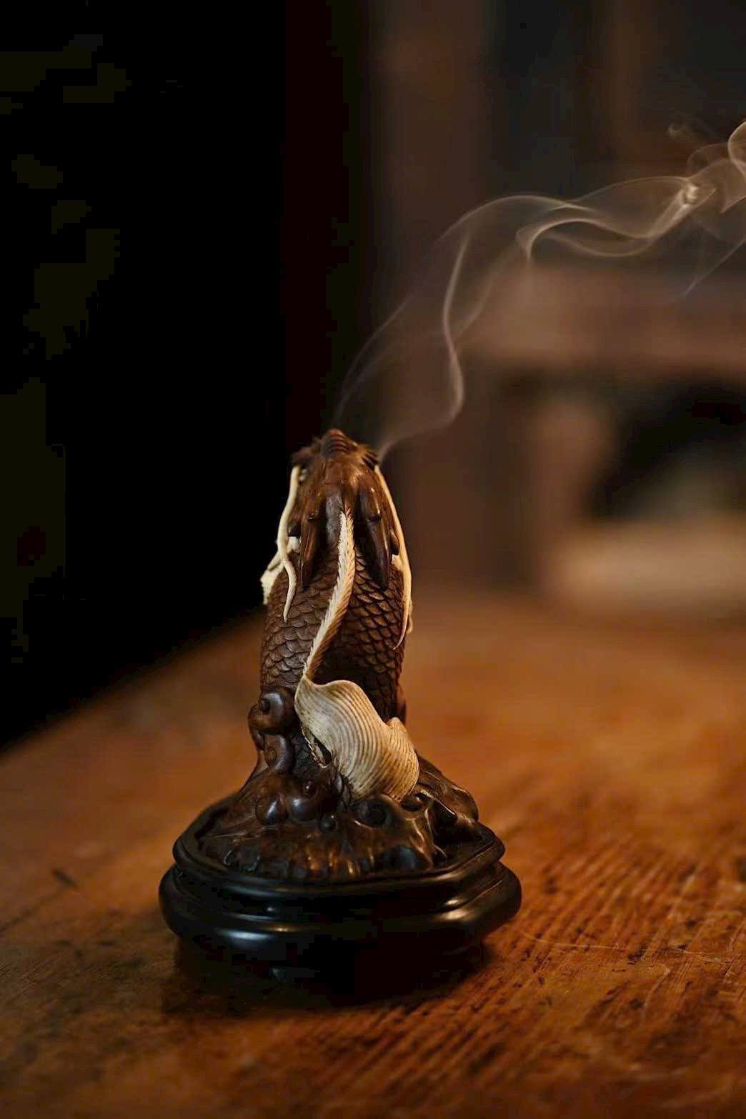 🌿 Lư hương Ngao Ngư dáng cổ – đầu rồng thân cá, vảy nổi, vây xoè như cánh, khói hương tỏa ra sống động. Biểu tượng “Cá hóa rồng” – mang ý nghĩa đỗ đạt, độc chiếm vị trí cao nhất.