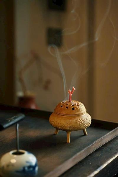 Chất liệu thanh nhã, đặt trên ba chân, hoa văn khắc chạm giản dị mà hàm ý sâu xa. Khi khói hương nhẹ bay, lượn lờ xoắn vươn lên, sương khói như mây sóng quấn quanh không dứt, hư ảo mà chân thực, dư vị càng thêm thâm thúy.