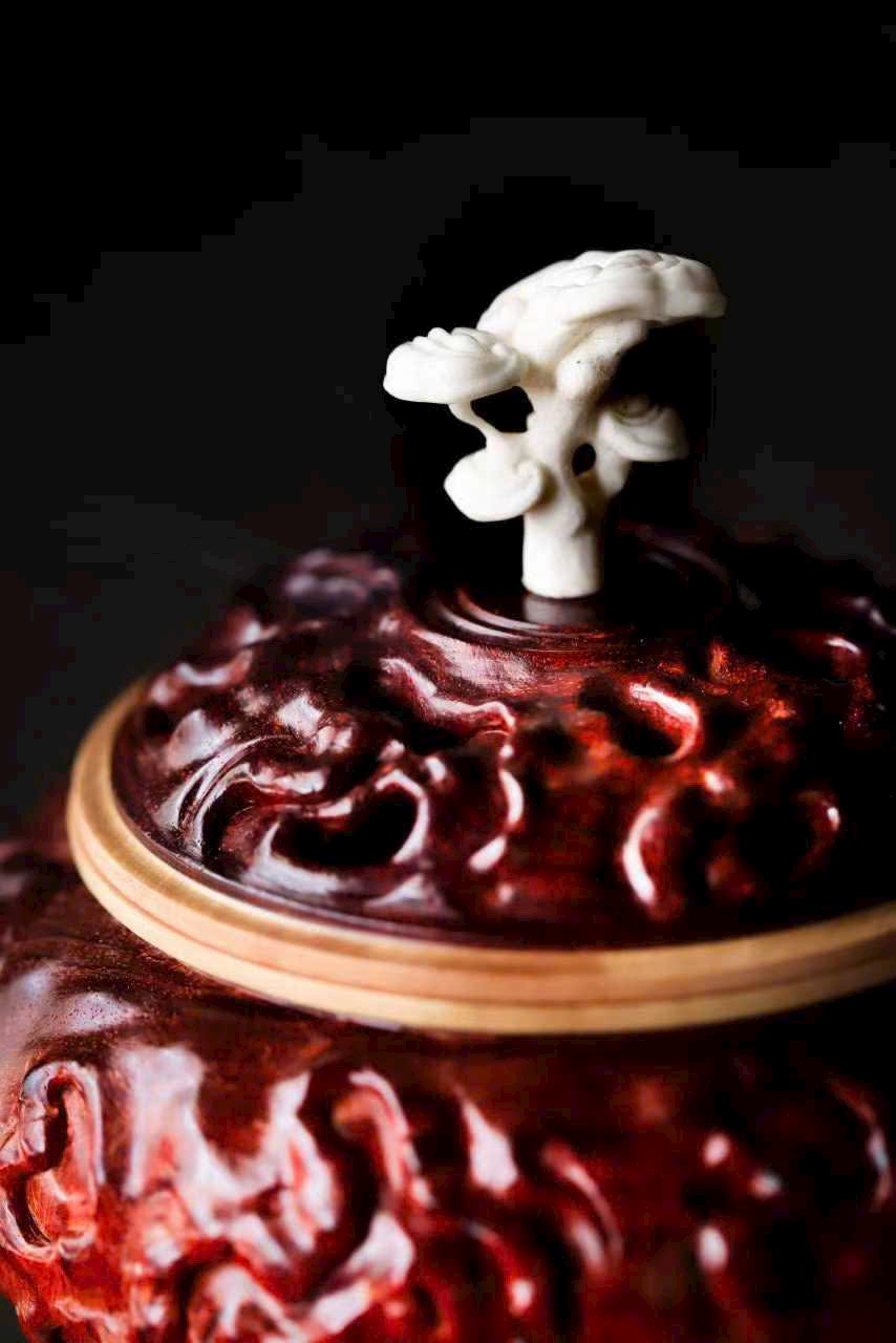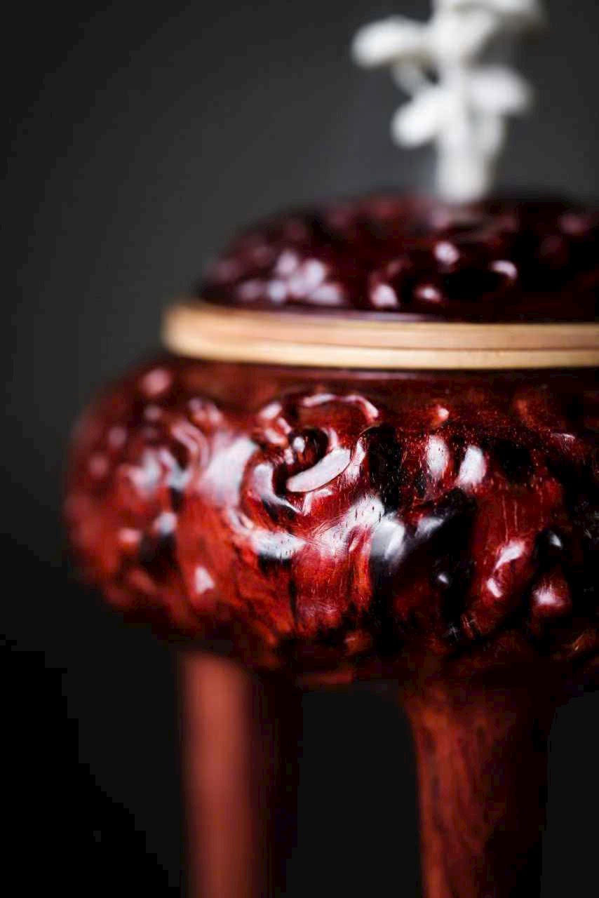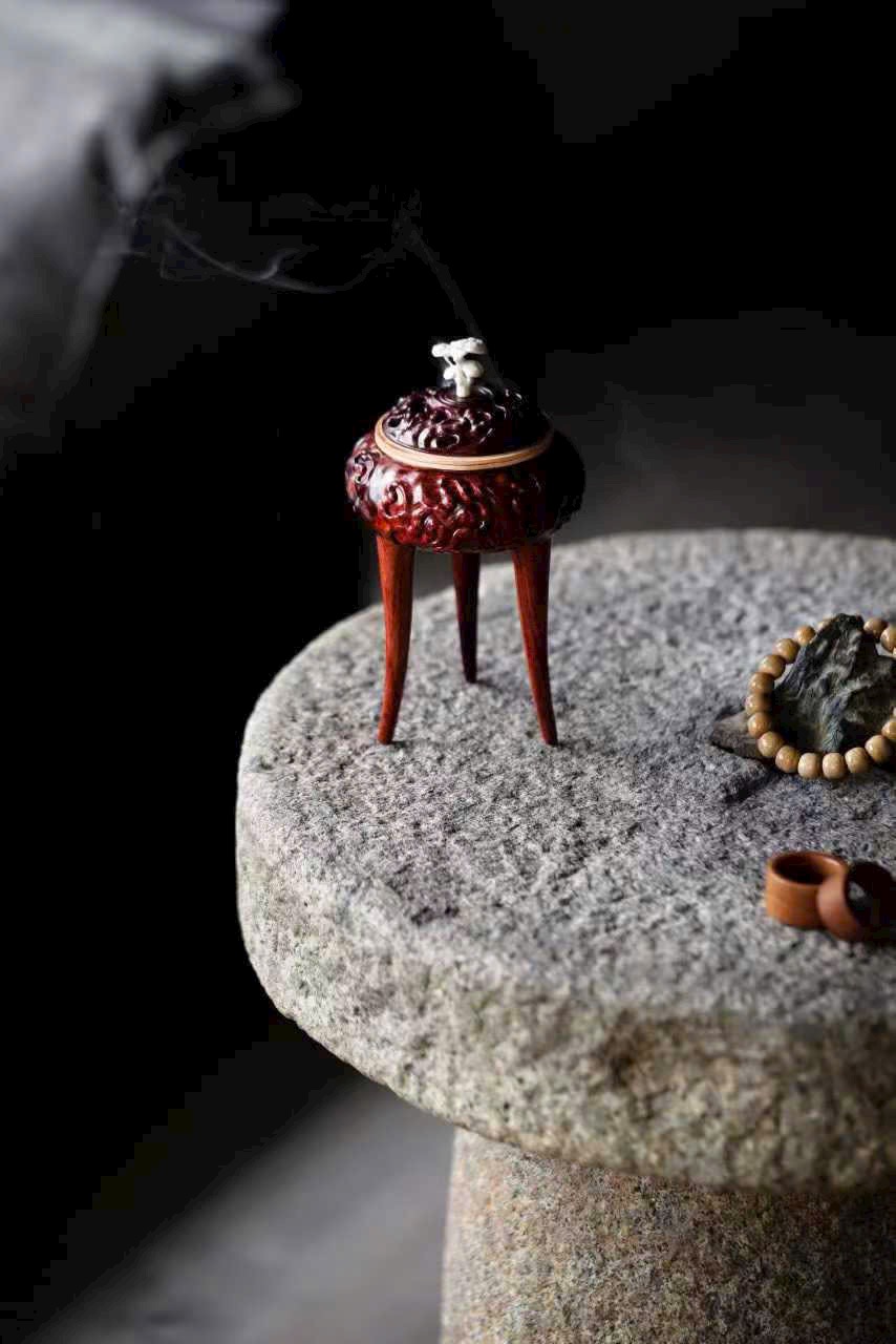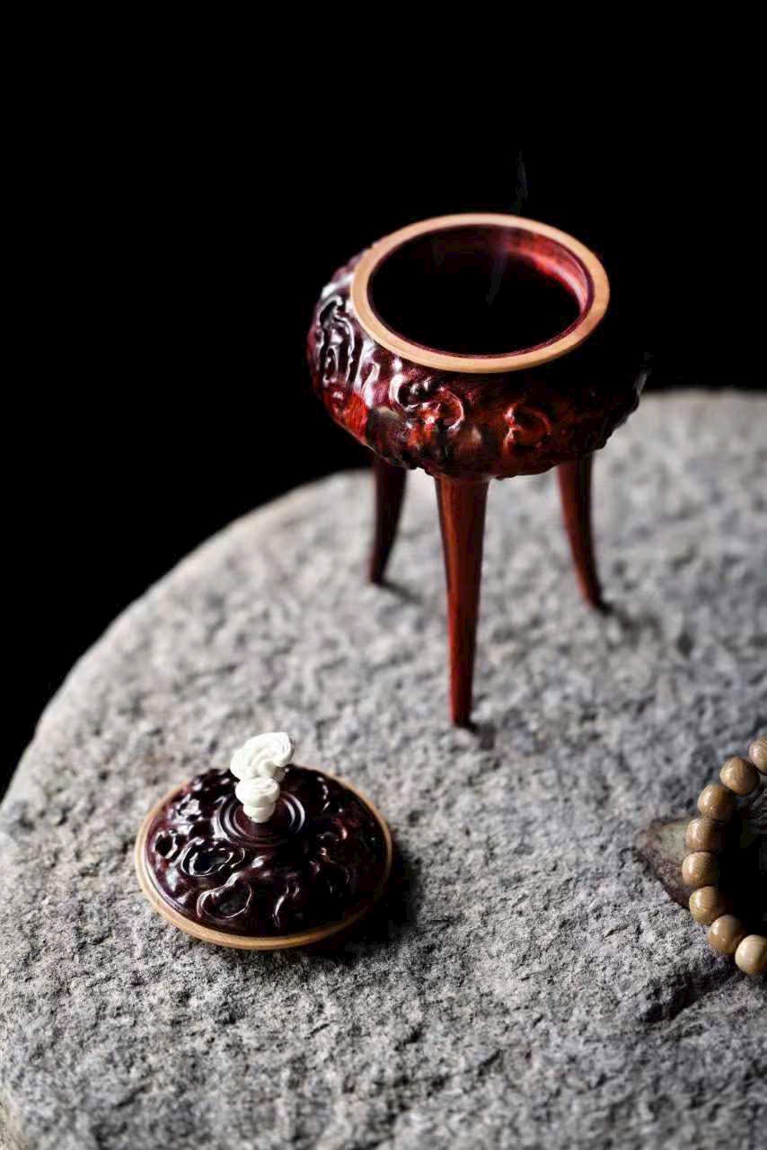 Tử đàn trầm tĩnh, sắc gỗ như ngọc đặc. Thân lư khắc vân lưu vân uốn lượn tinh tế. Nút linh chi như mọc ra linh khí cát tường, ba chân vững chãi phảng phất phong vận Tần Hán. Hương khói lượn qua mây, tựa tiên nhân cưỡi khí phiêu du chốn thái hư.