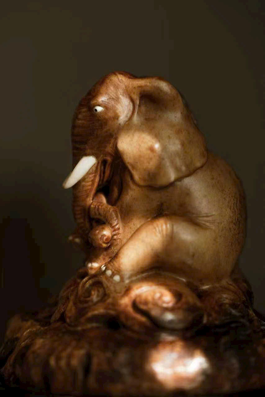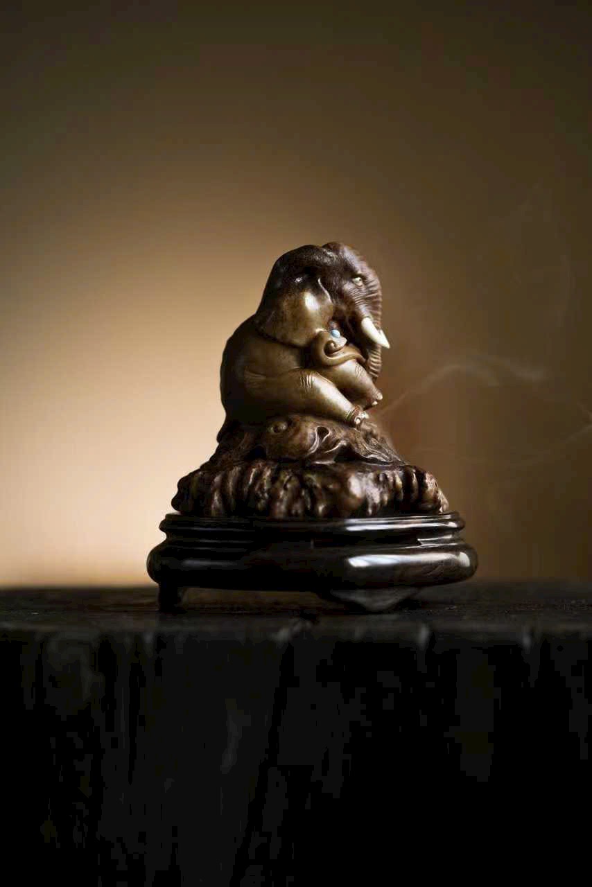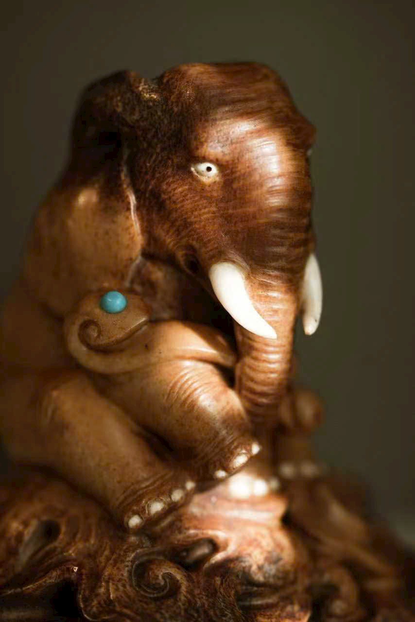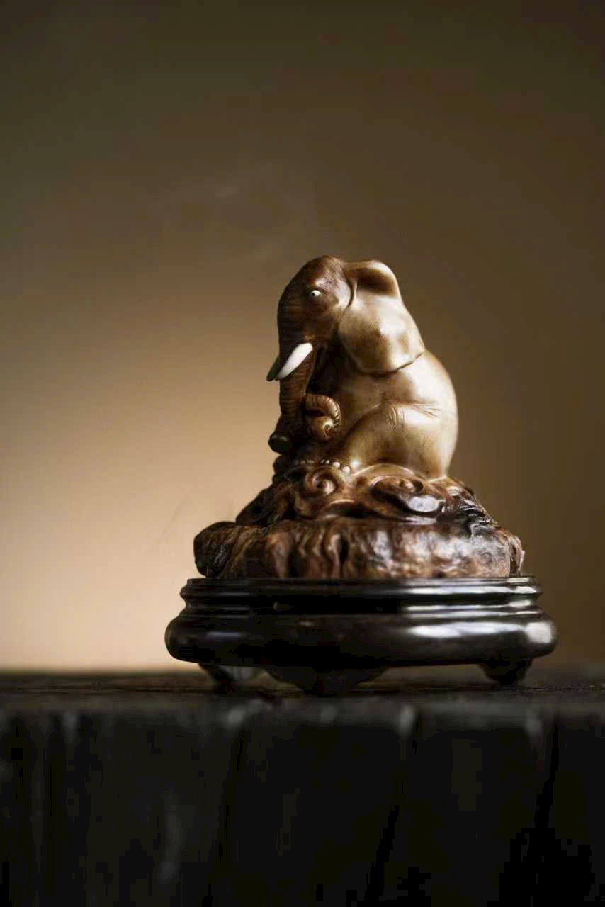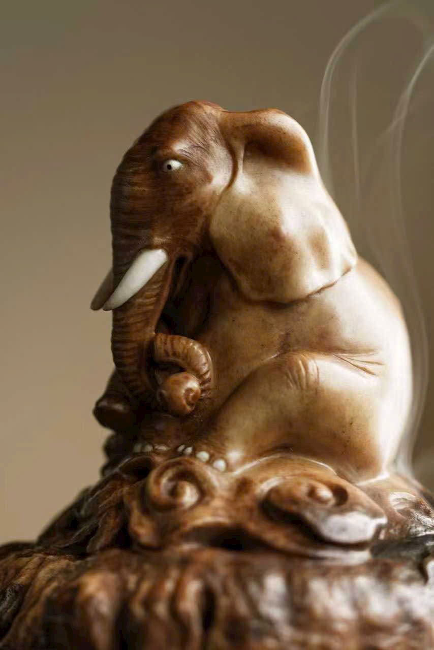 Hình tượng voi mang ý nghĩa trí tuệ, chiêu tài, phá trừ chướng ngại. Chạm khắc tả thực, voi ngẩng vòi hướng trời, thần thái hiền hòa, dáng đứng vững chắc đầy sức mạnh, hình thần đều đủ, tác phẩm thuộc hàng thượng phẩm. Khi đốt hương, khói sương vấn vương, bày nơi án thư thưởng ngoạn, dư vị vô cùng.