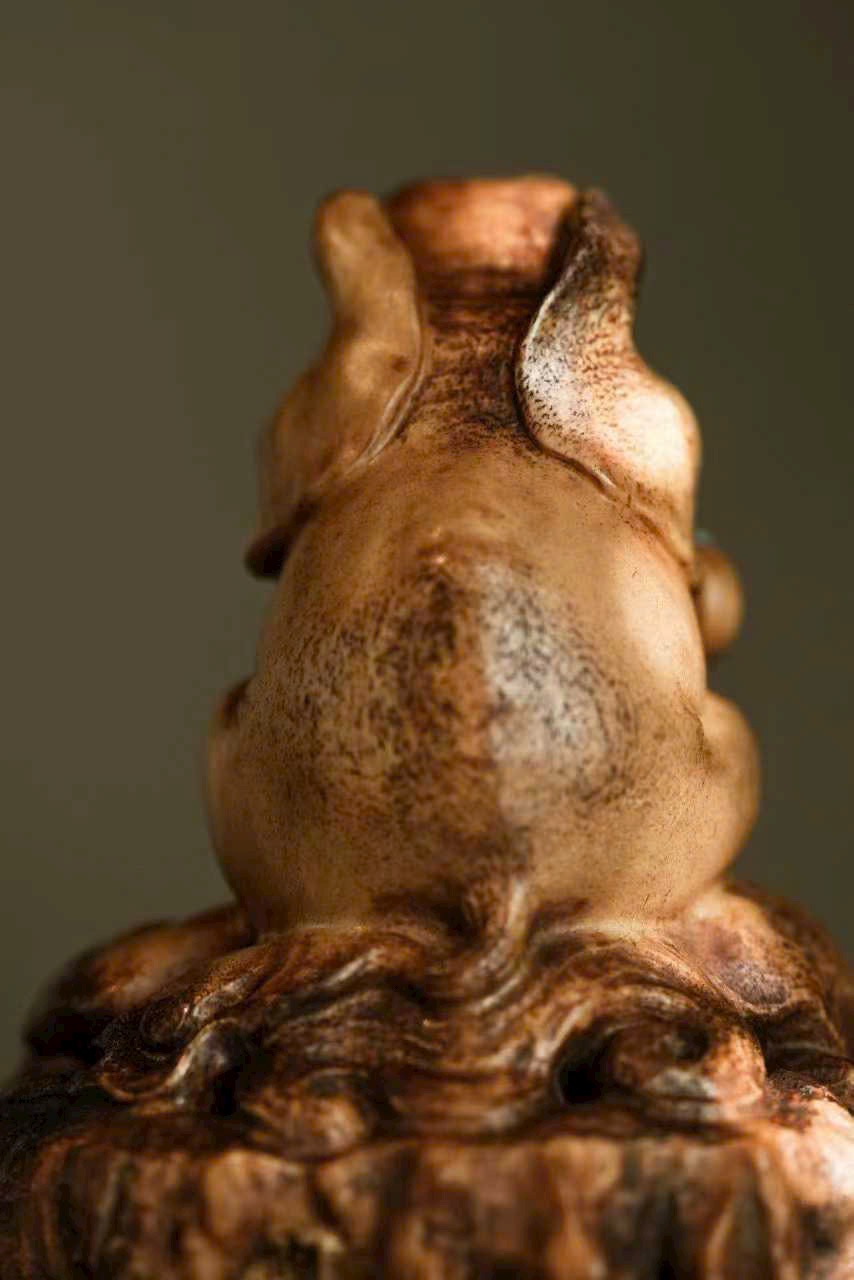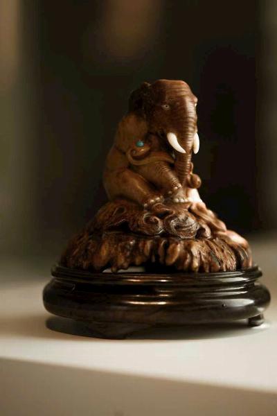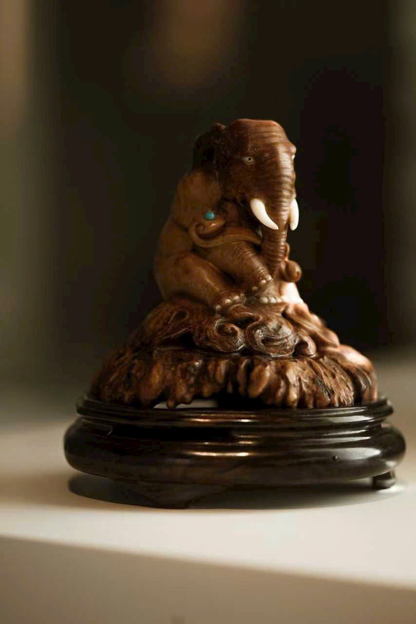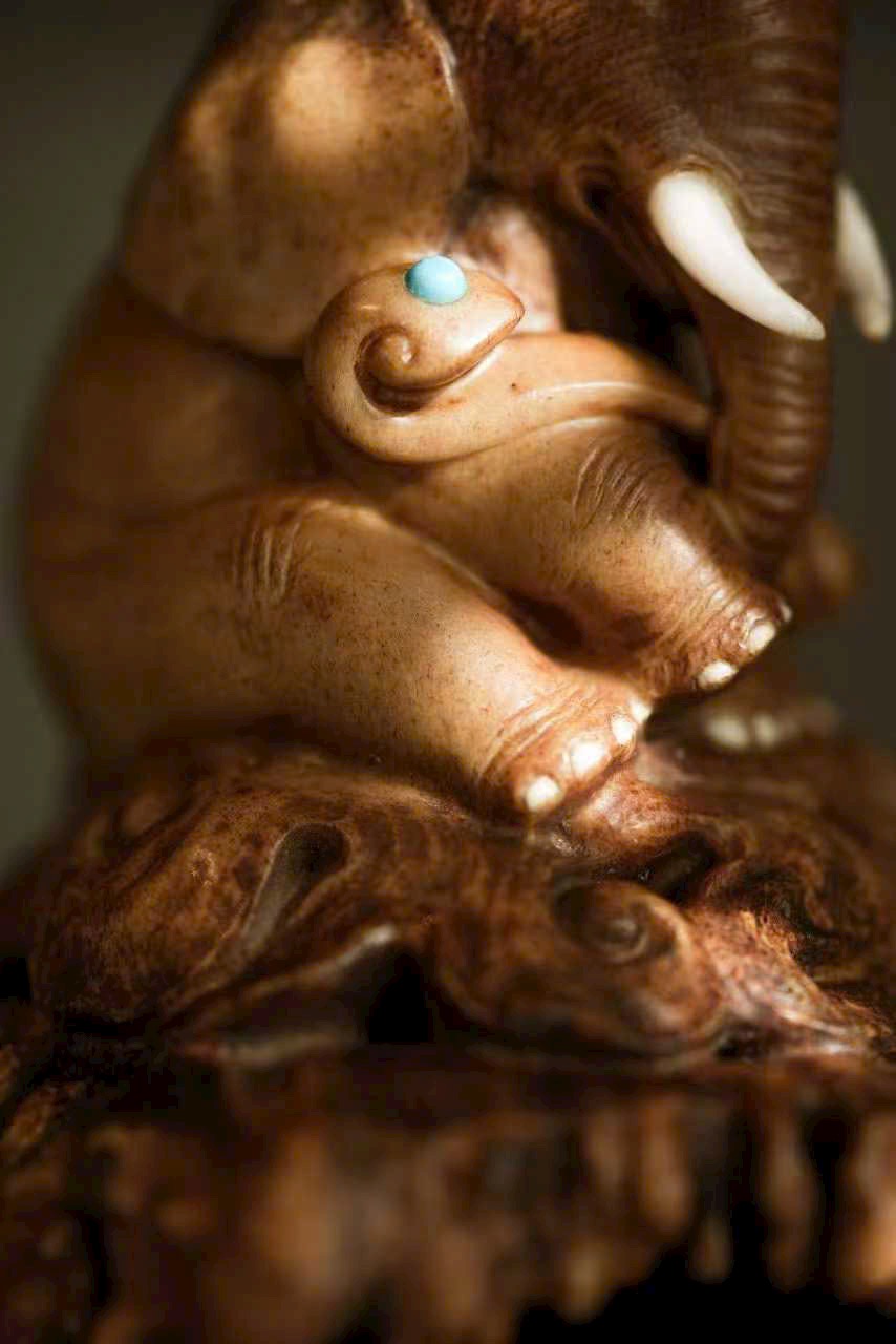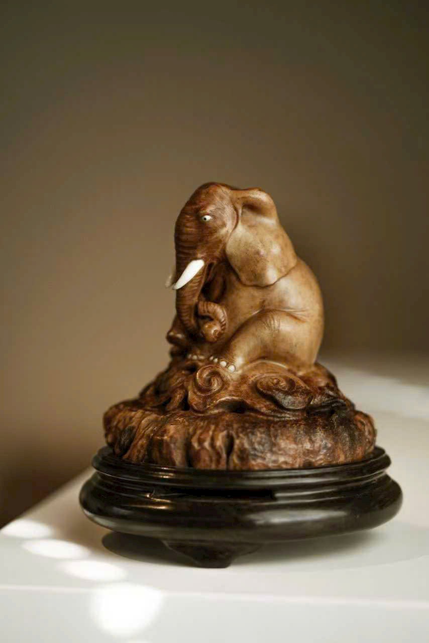 Hình tượng voi mang ý nghĩa trí tuệ, chiêu tài, phá trừ chướng ngại. Chạm khắc tả thực, voi ngẩng vòi hướng trời, thần thái hiền hòa, dáng đứng vững chắc đầy sức mạnh, hình thần đều đủ, tác phẩm thuộc hàng thượng phẩm. Khi đốt hương, khói sương vấn vương, bày nơi án thư thưởng ngoạn, dư vị vô cùng.