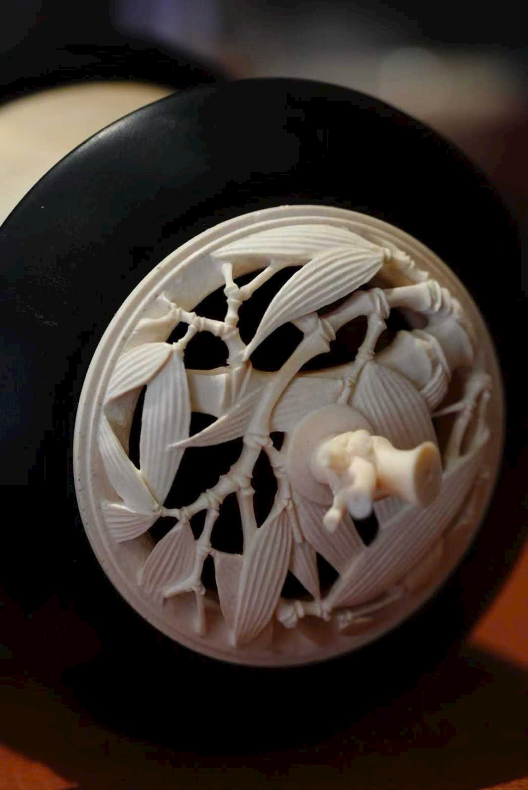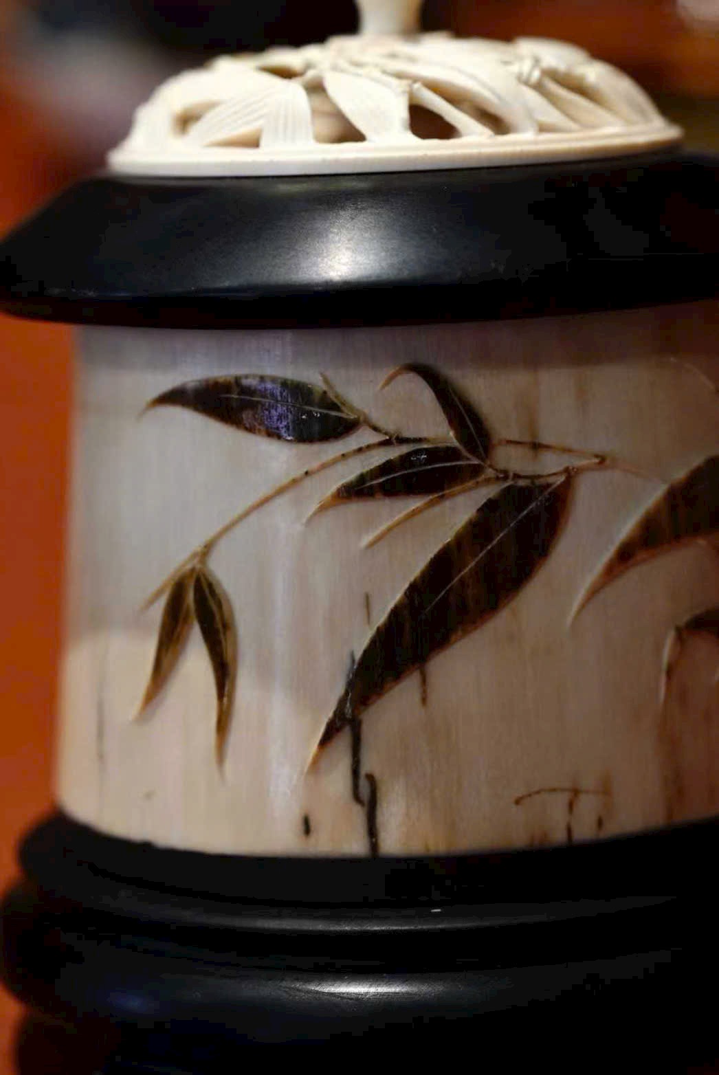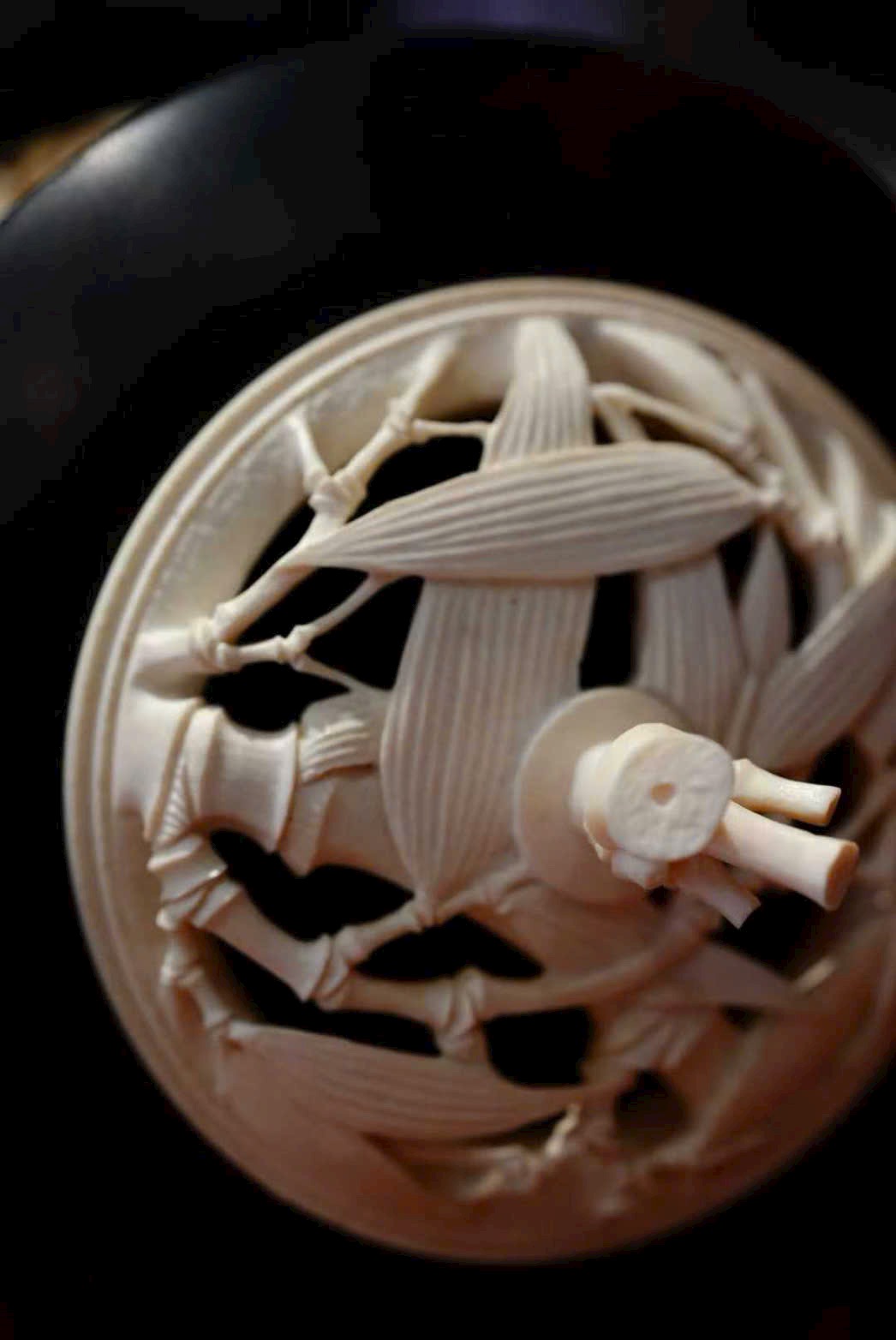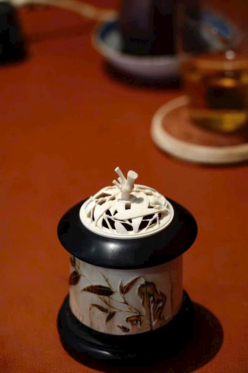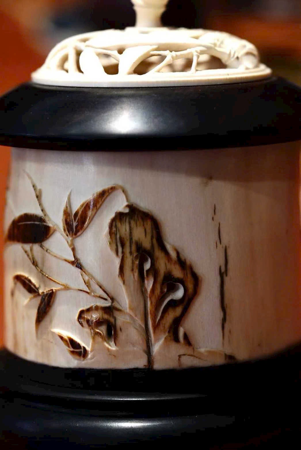Lư hương chế tác từ ng.à voi ma mút, khéo léo giữ lớp da tự nhiên, chạm khắc cành trúc cùng đá Thái Hồ. Bóng trúc thanh thoát, dáng đá gầy thanh, toát lên vẻ nhã nhặn tự nhiên. Phần đế nắp dùng gỗ tử quang đàn làm nền, vững chãi nâng đỡ. Trên đỉnh nắp gắn n.gà voi ma mút chạm trúc xuyên thấu, tầng lớp đan xen, tinh xảo thông thoáng. Khi làn khói hương mảnh mai vươn lên, như thấy trúc lay trong gió, đá tĩnh rêu sinh, thiền ý phương Đông hòa quyện cùng tâm ý khéo léo của nghệ nhân.