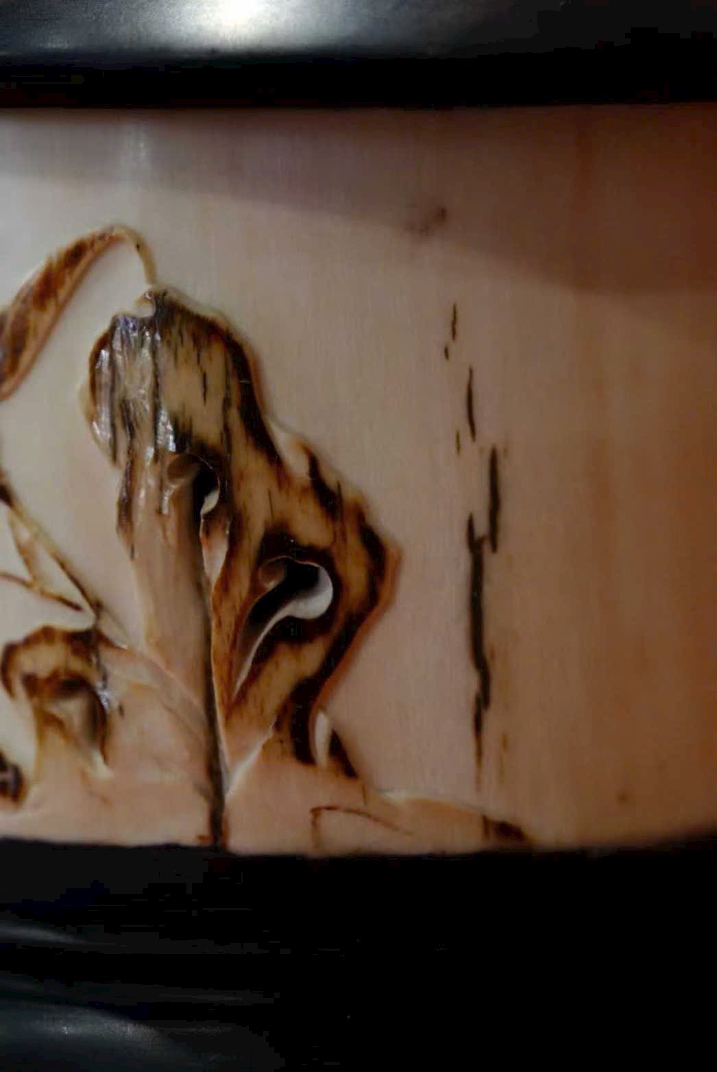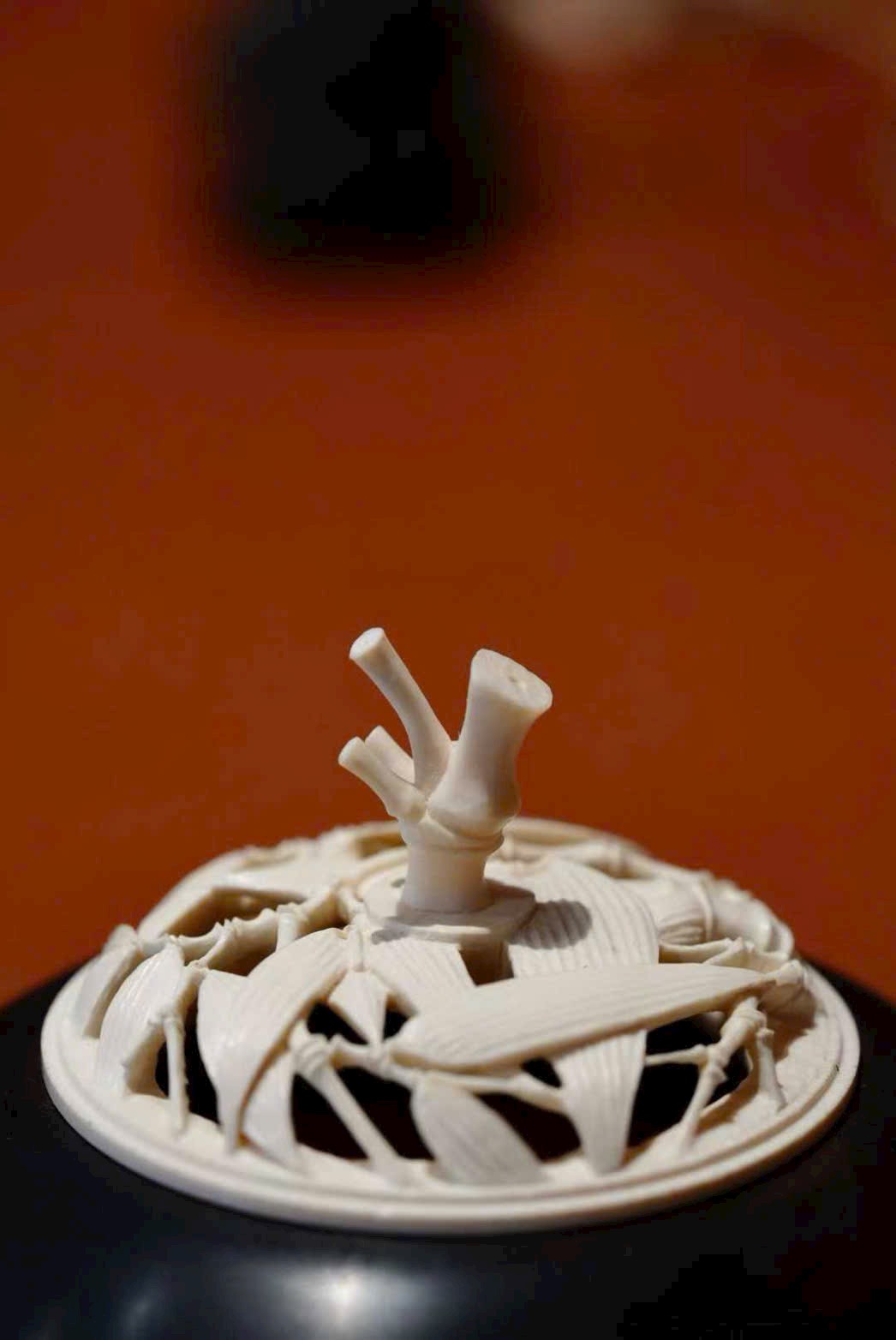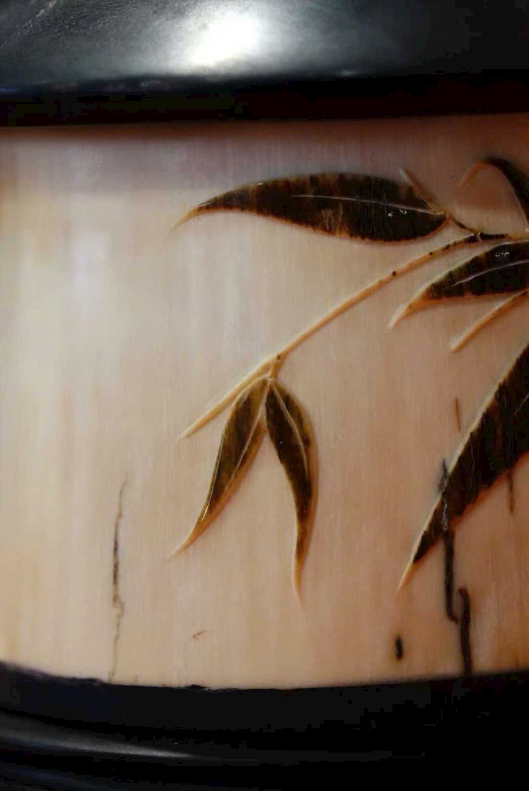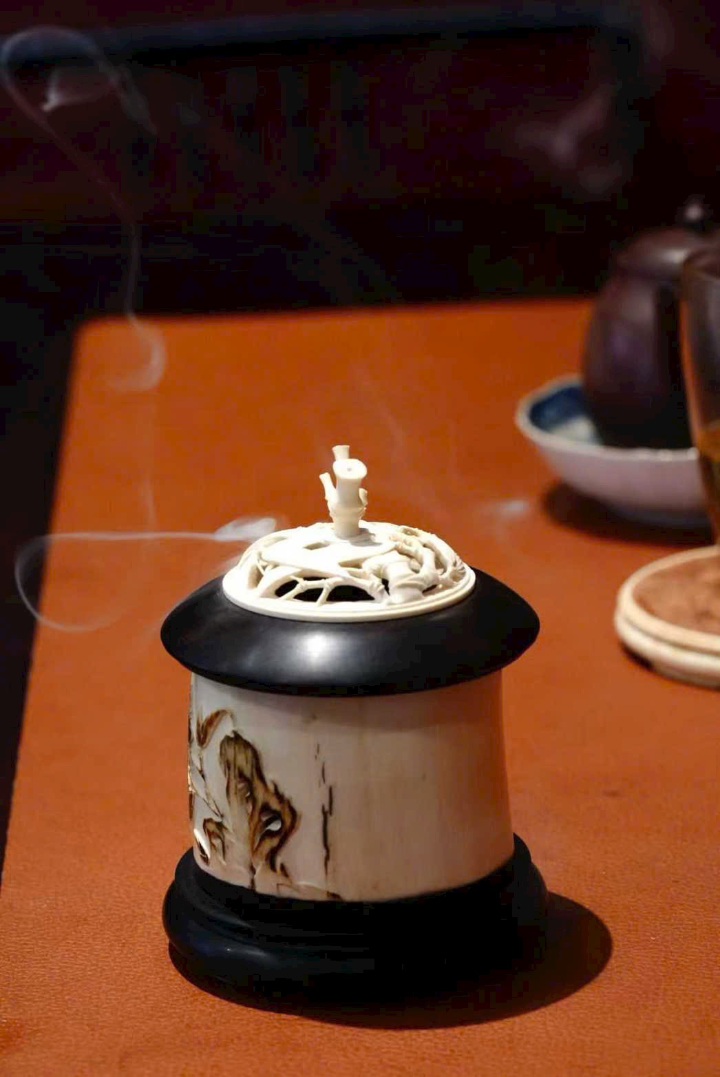 Lư hương chế tác từ ng.à voi ma mút, khéo léo giữ lớp da tự nhiên, chạm khắc cành trúc cùng đá Thái Hồ. Bóng trúc thanh thoát, dáng đá gầy thanh, toát lên vẻ nhã nhặn tự nhiên. Phần đế nắp dùng gỗ tử quang đàn làm nền, vững chãi nâng đỡ. Trên đỉnh nắp gắn n.gà voi ma mút chạm trúc xuyên thấu, tầng lớp đan xen, tinh xảo thông thoáng. Khi làn khói hương mảnh mai vươn lên, như thấy trúc lay trong gió, đá tĩnh rêu sinh, thiền ý phương Đông hòa quyện cùng tâm ý khéo léo của nghệ nhân.