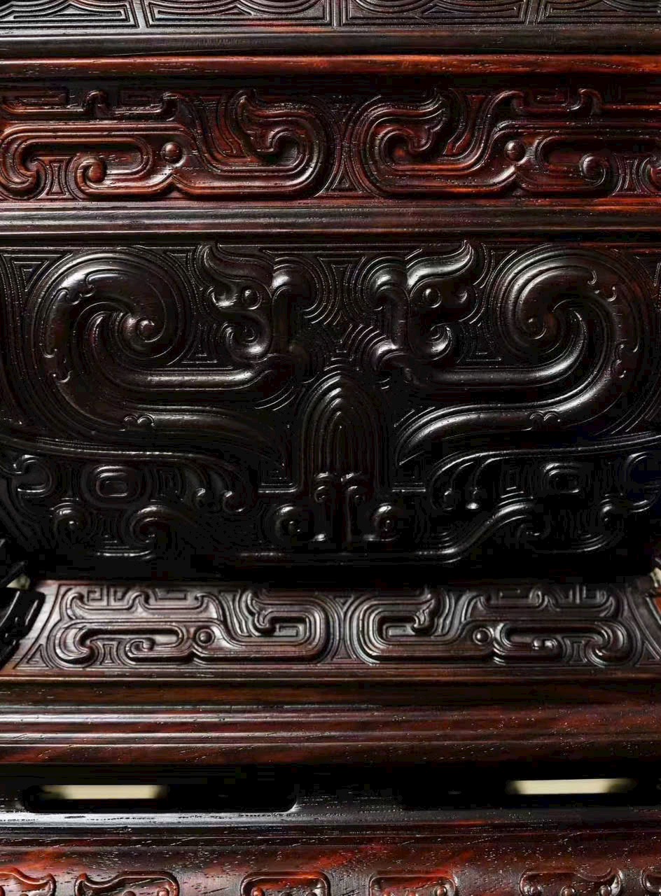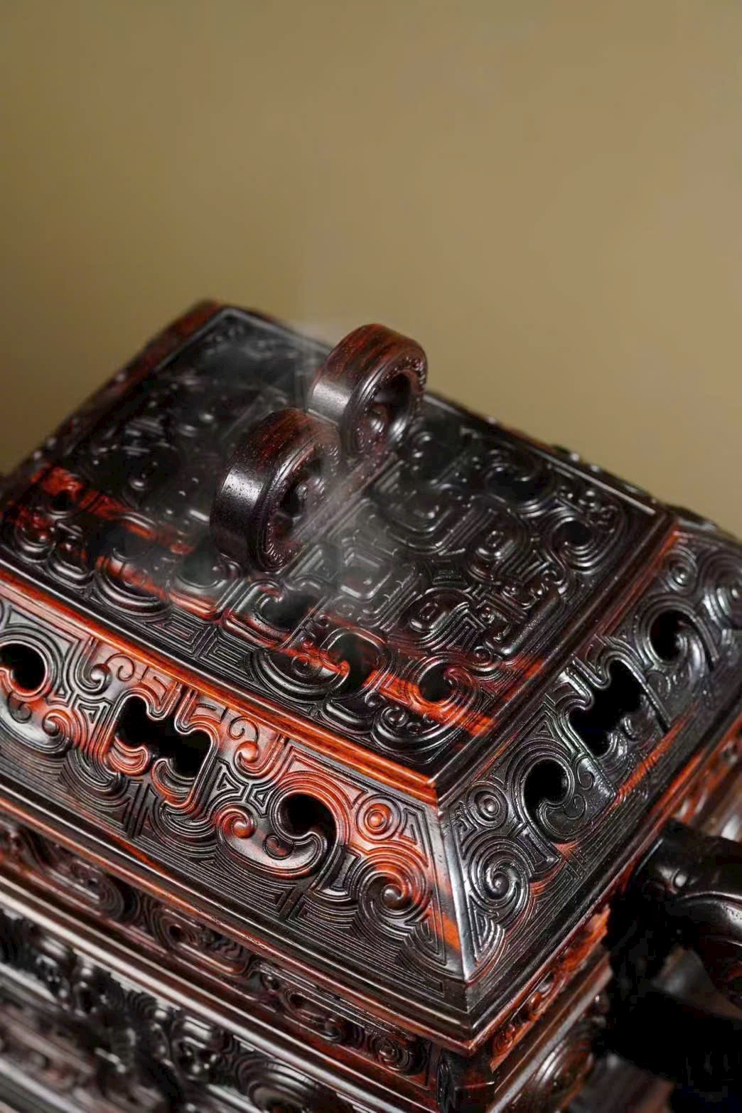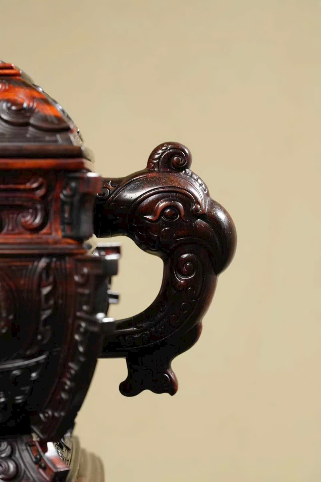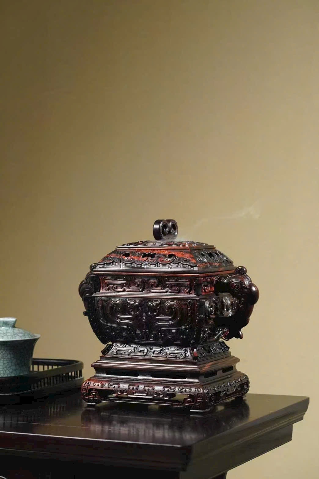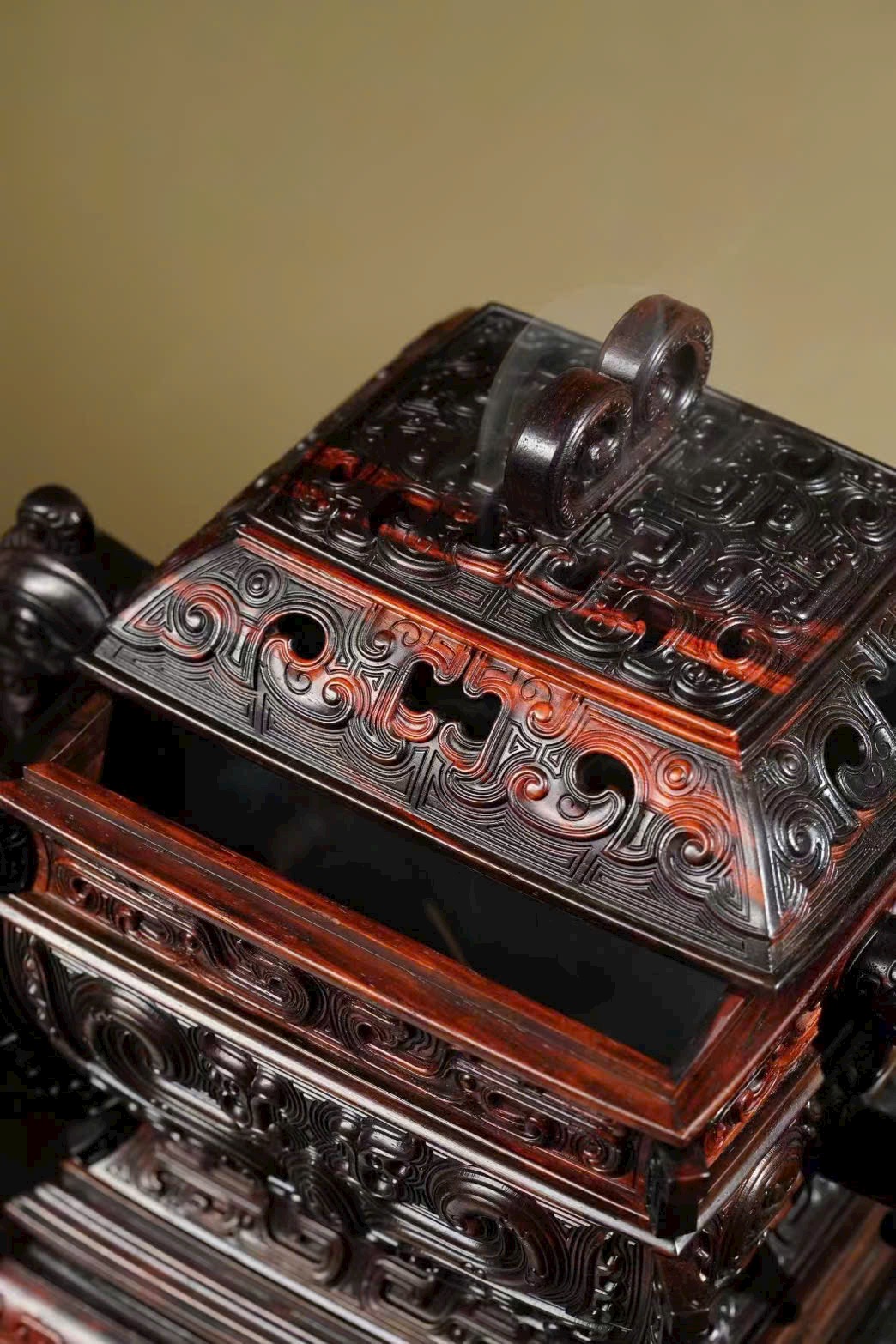 Tác phẩm được chế tác từ gỗ trắc lâu năm, áp dụng kỹ nghệ mộng ghép và chạm lọng tinh xảo, tái hiện hình dáng cổ của đồ đồng xưa. Toàn thân phủ đầy họa tiết thú văn nổi, đường nét uyển chuyển, khắc họa sống động, mặt nào nhìn cũng tinh mỹ và linh động.
