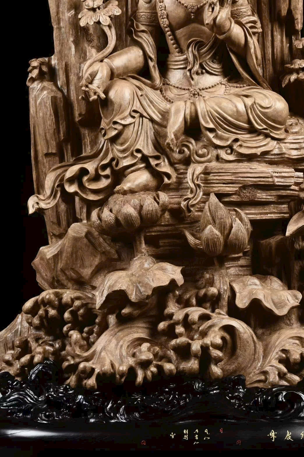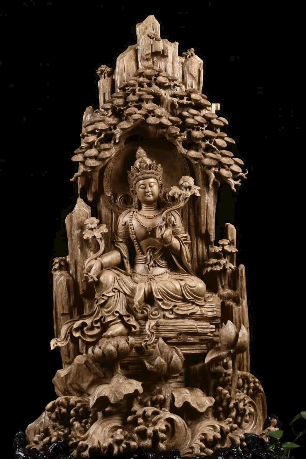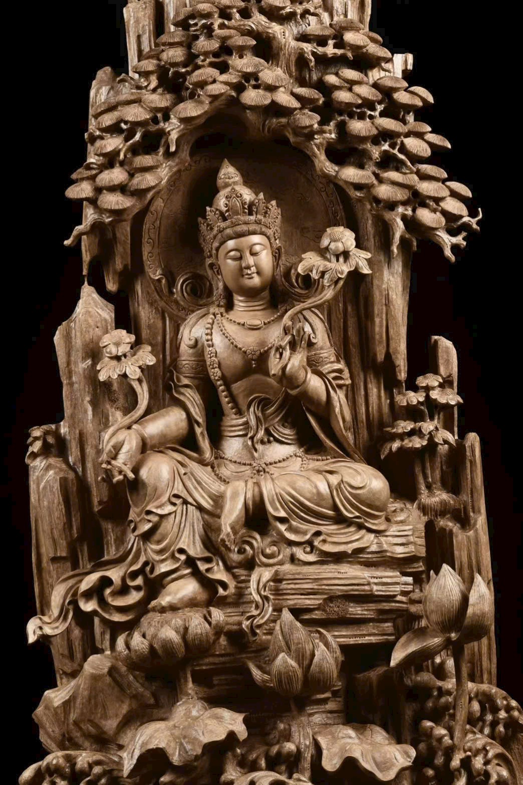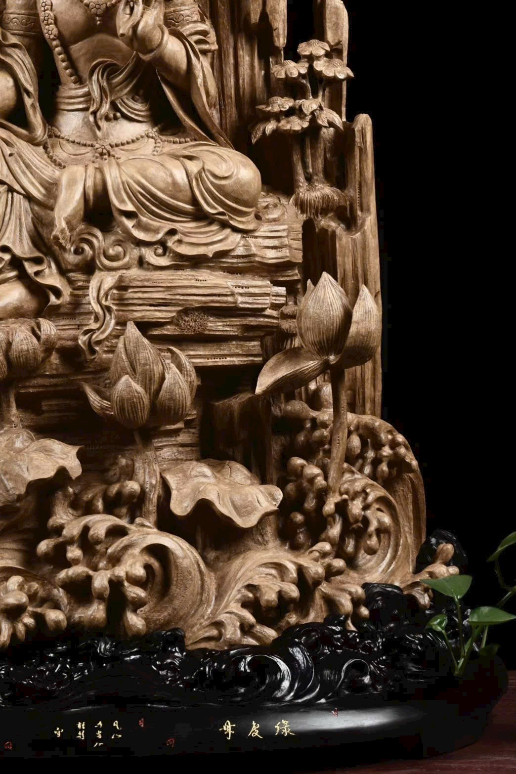 Toàn bộ tượng được chạm khắc thủ công tinh xảo, đường nét mềm mại, thần thái trang nghiêm.