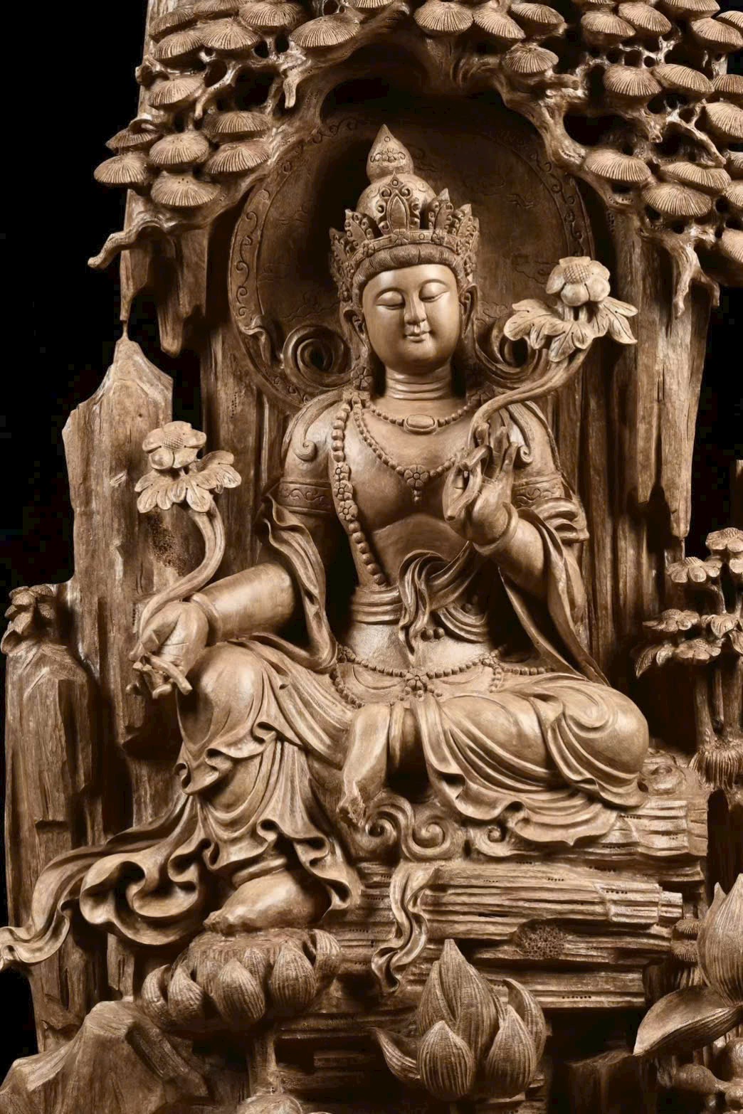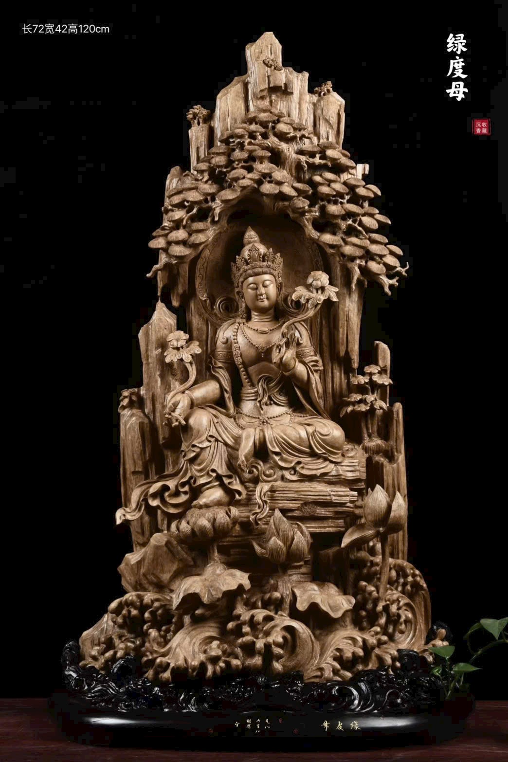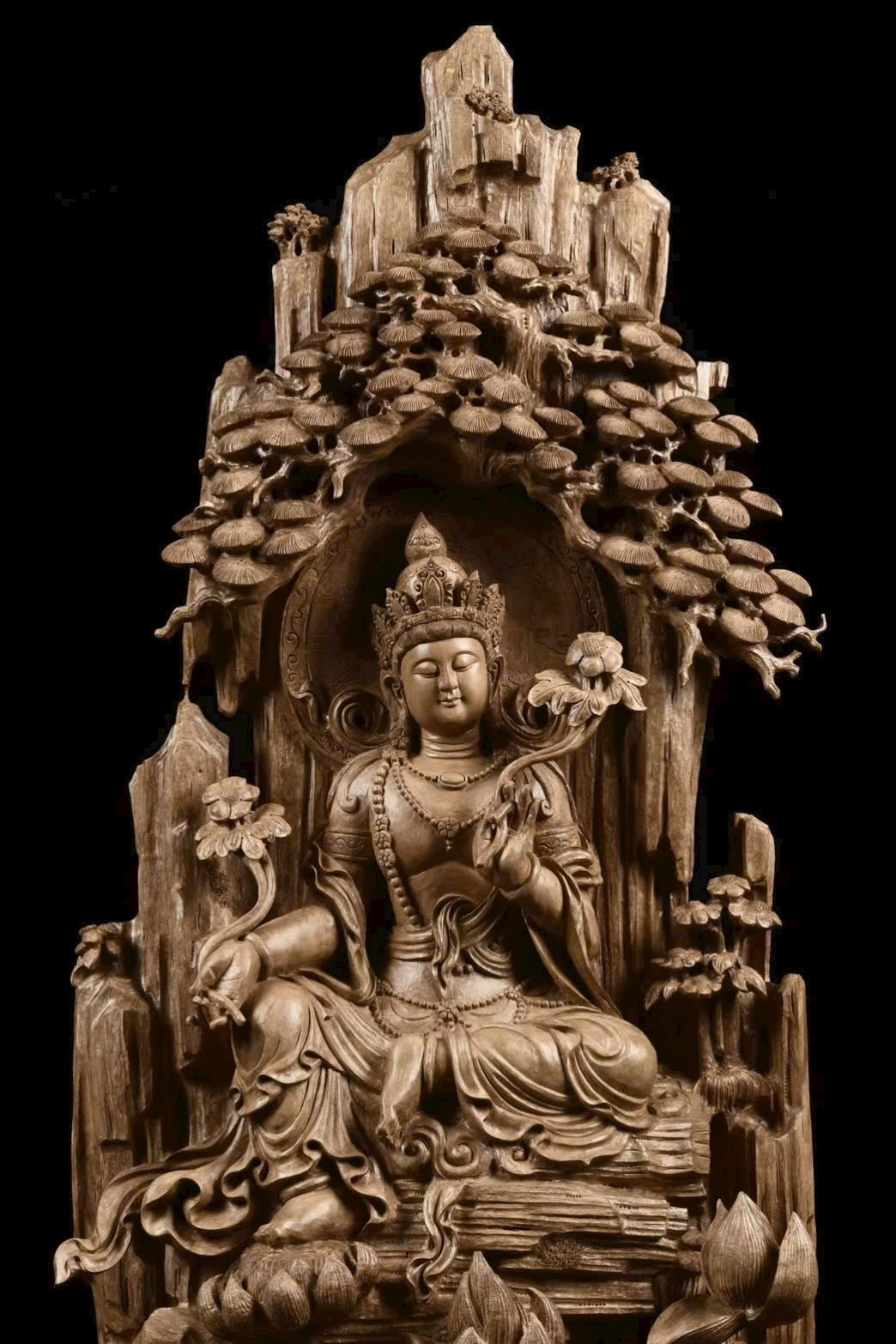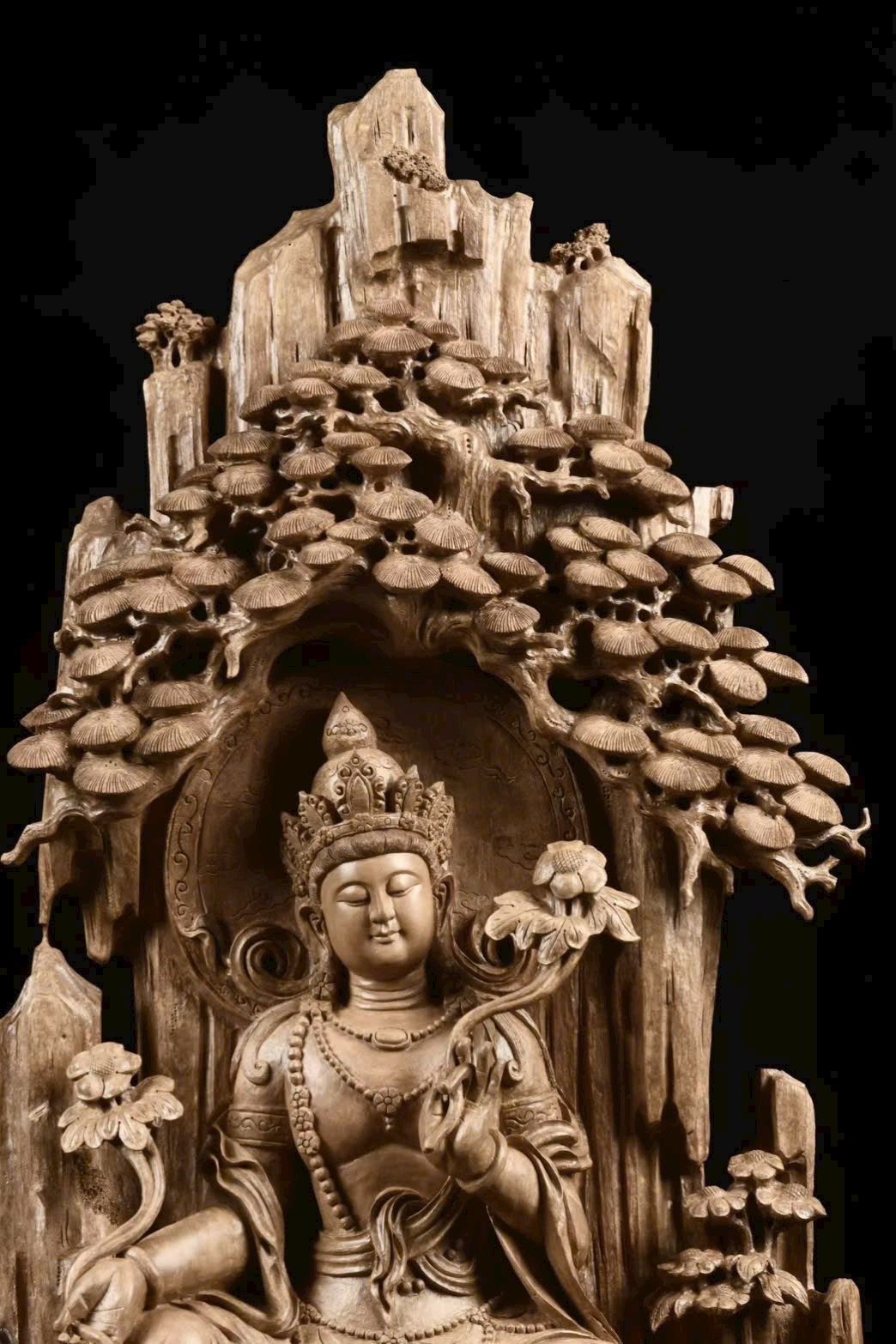 Toàn bộ tượng được chạm khắc thủ công tinh xảo, đường nét mềm mại, thần thái trang nghiêm.