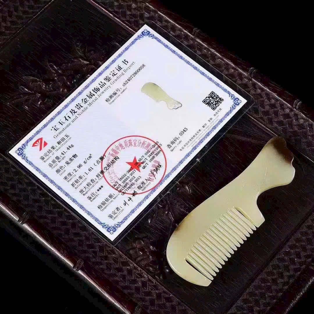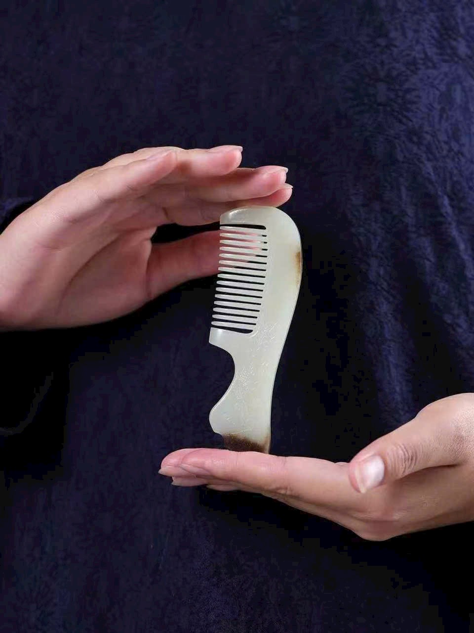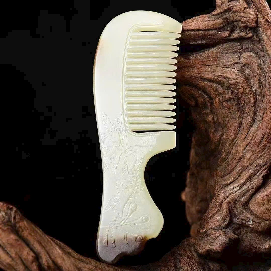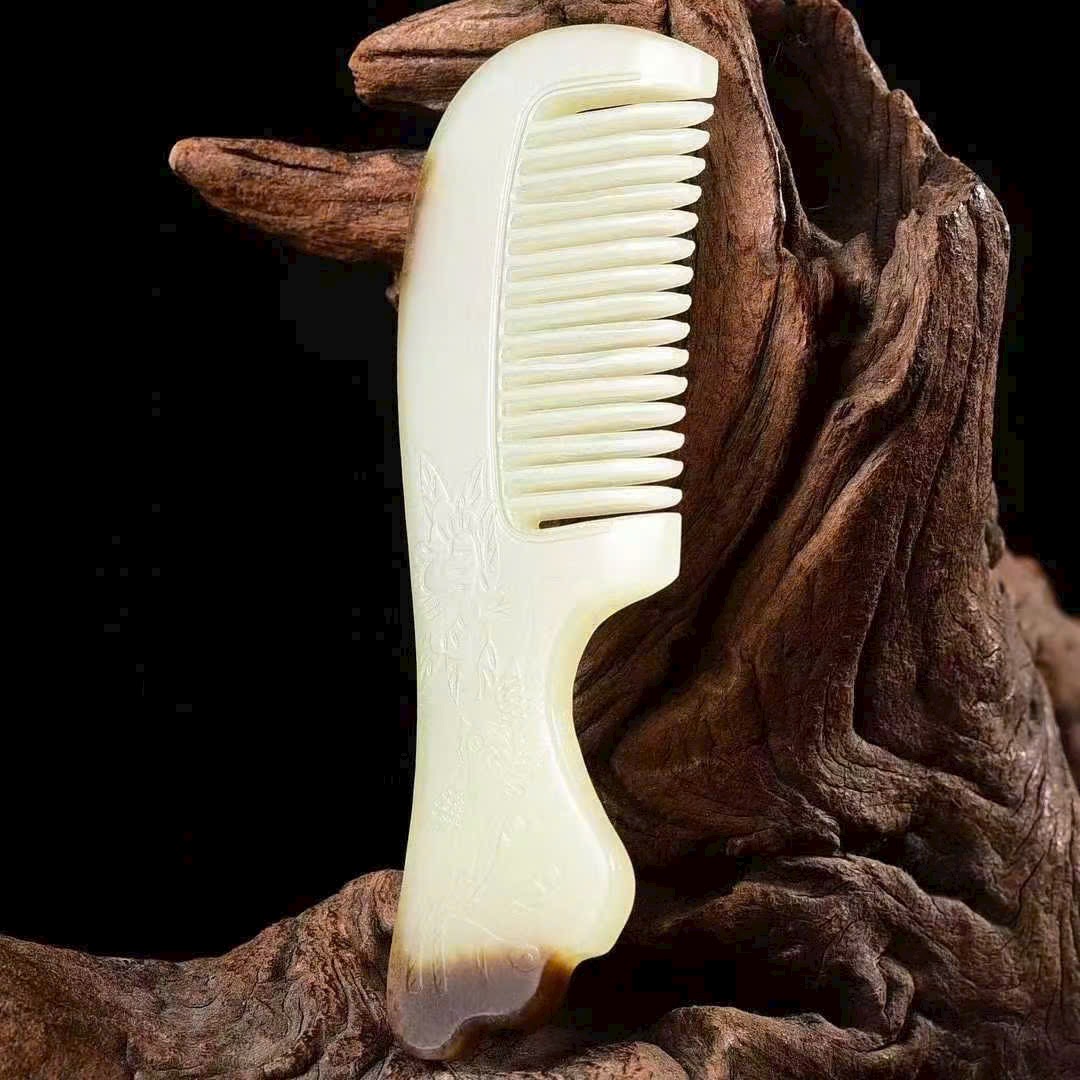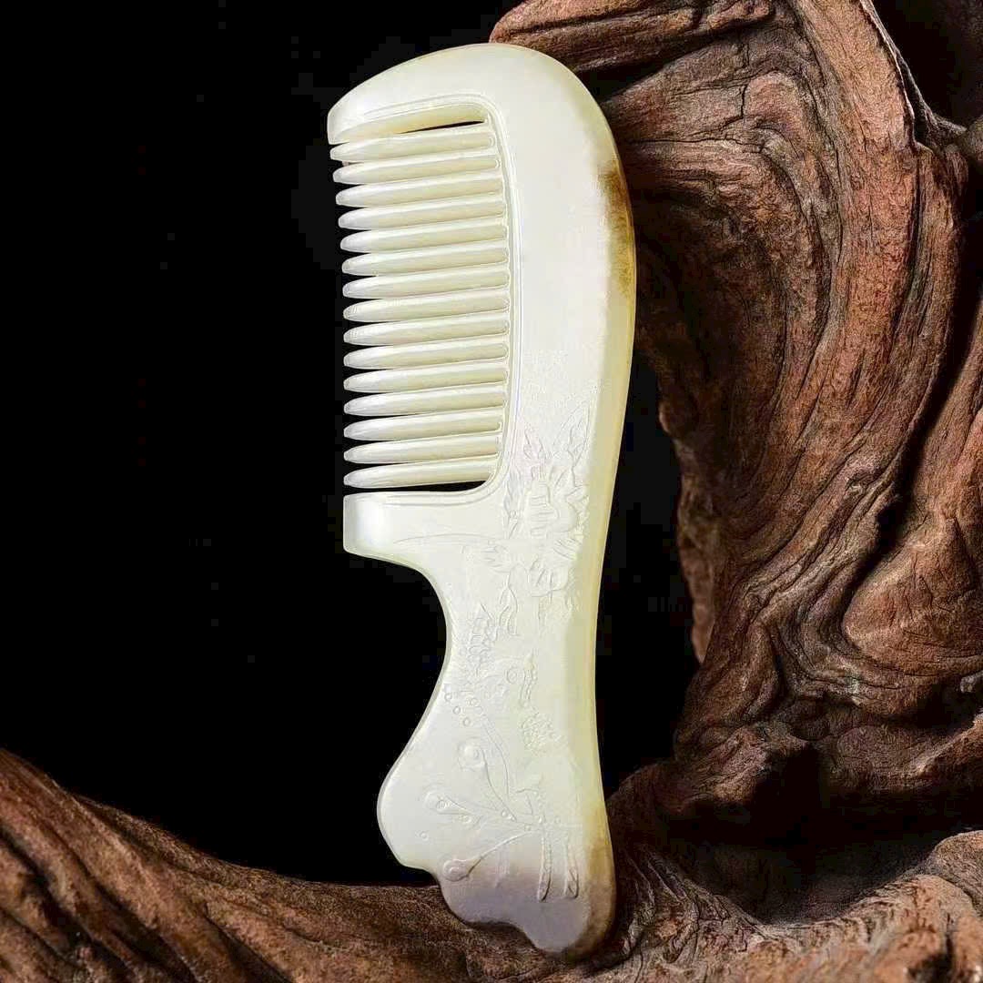 Lược ngọc Hòa Điền tự nhiên Tân Cương, sắc đường tự nhiên, chạm khắc tinh xảo họa tiết “Hỷ thượng mi sao” & hoa mẫu đơn.