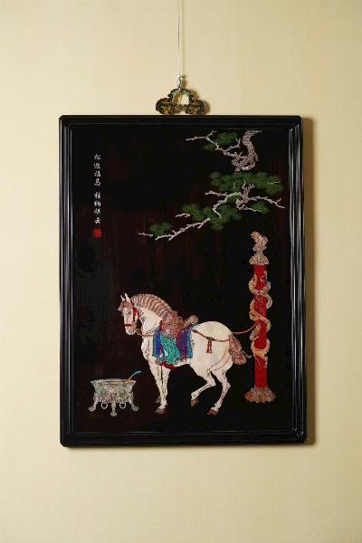 Ốc xà cừ tạo nên thần thái linh động của ngựa, trong cành tùng và cột hoa biểu ẩn chứa điềm lành. Khi dừng mắt ngắm bức treo này, như thể rước phúc khí vào trong cuộc sống! Trong ánh sáng lấp lánh của vỏ trai còn ẩn ý cát tường “tùng nghênh phúc mã, trụ nạp tường vân”. Một nét lãng mạn phong vị Trung Hoa, vĩnh viễn làm người ta rung động~