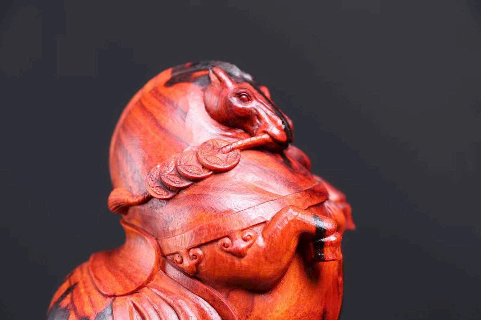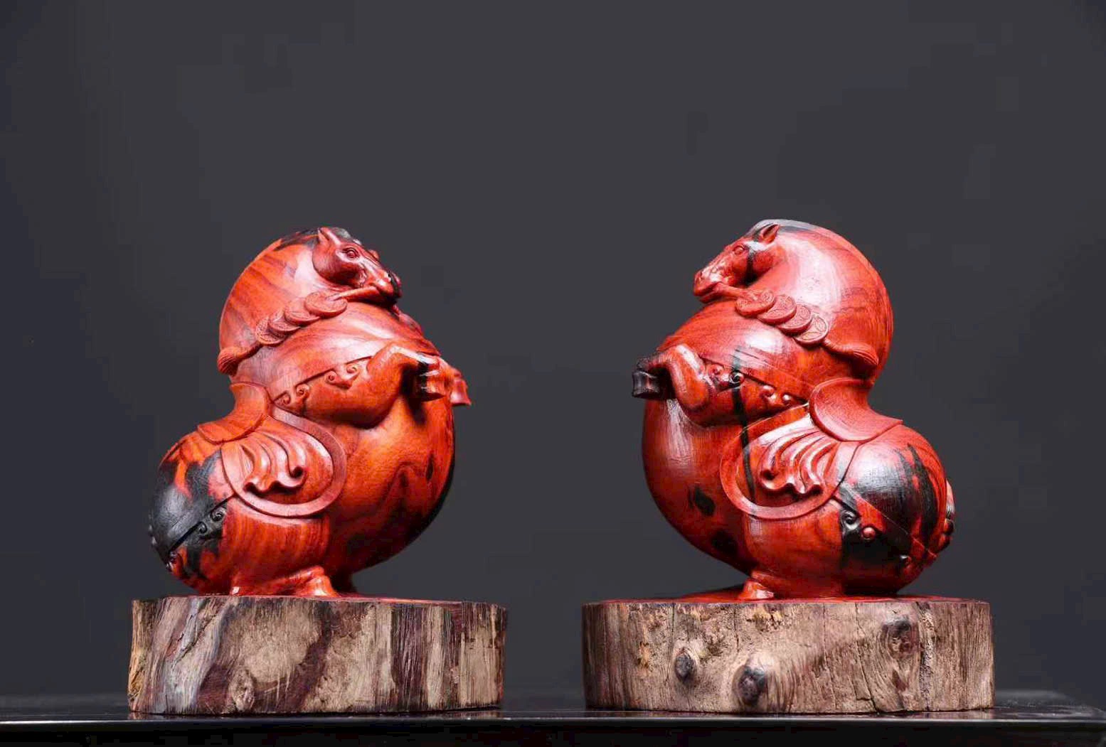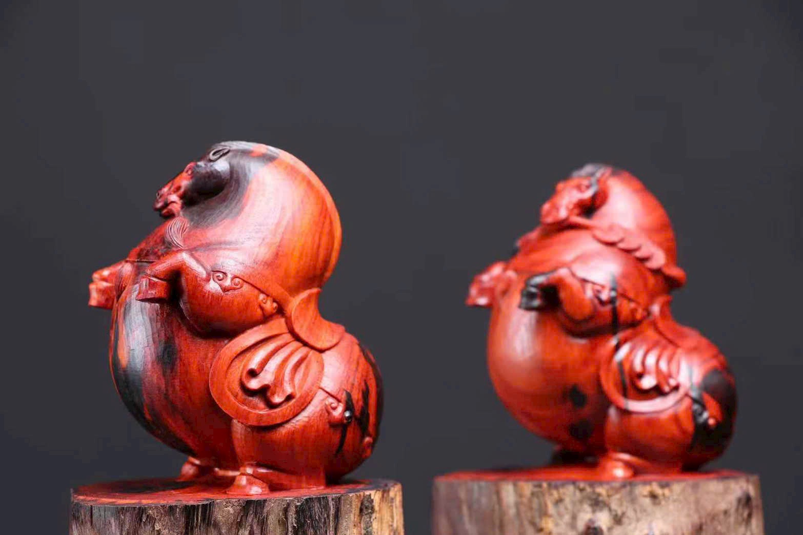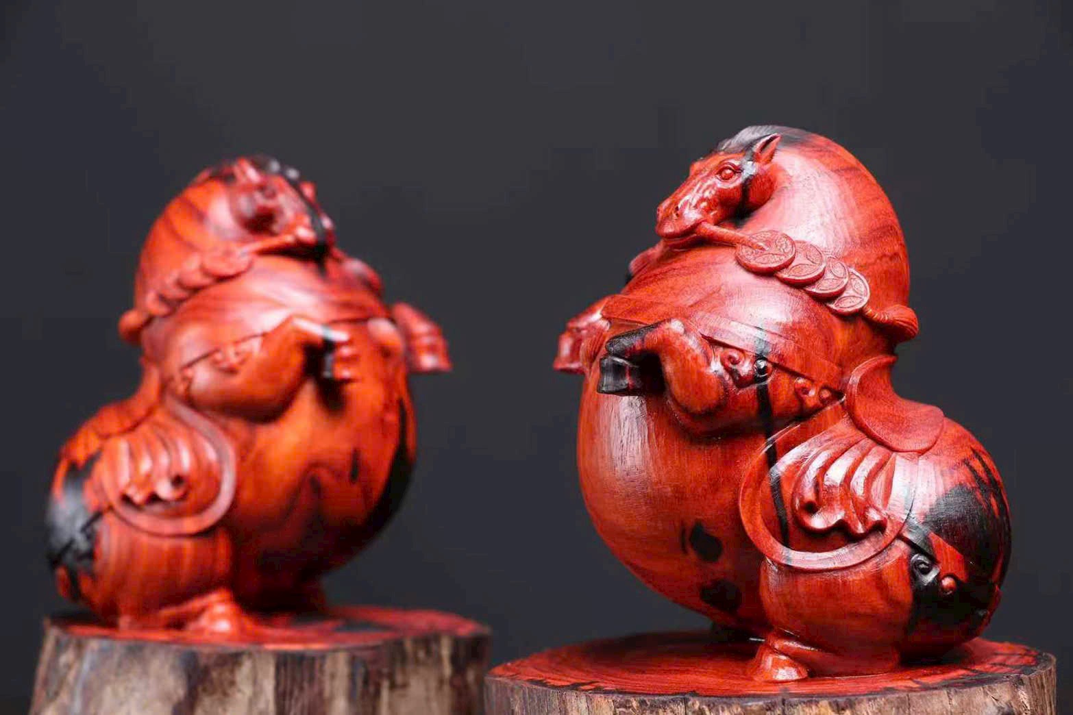 Chế tác từ gỗ tử đàn lá nhỏ Ấn Độ – gỗ tháo nhà lão liệu. Tạo hình ngựa vui mắt, mang ý nghĩa “mã đáo tài lai – tiền đến liền”, rất hợp bày bàn làm việc, quầy thu ngân hoặc phòng khách để chiêu tài.
