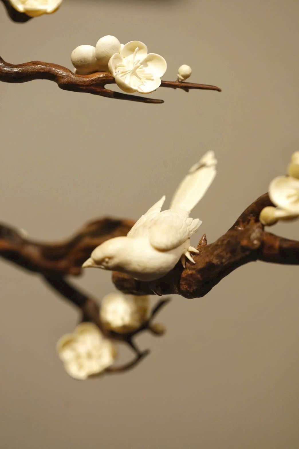Gỗ Sưa Hải Nam màu sắc trang nhã, tạo dáng cành mai uốn lượn tự nhiên. Hoa mai và chim sẻ được chạm từ ngà mammoth, tinh xảo đến từng chi tiết. Tác phẩm vừa mang giá trị nghệ thuật cao, vừa thích hợp trưng bày tại thư phòng, thể hiện phong vị tao nhã và khí chất thanh cao.