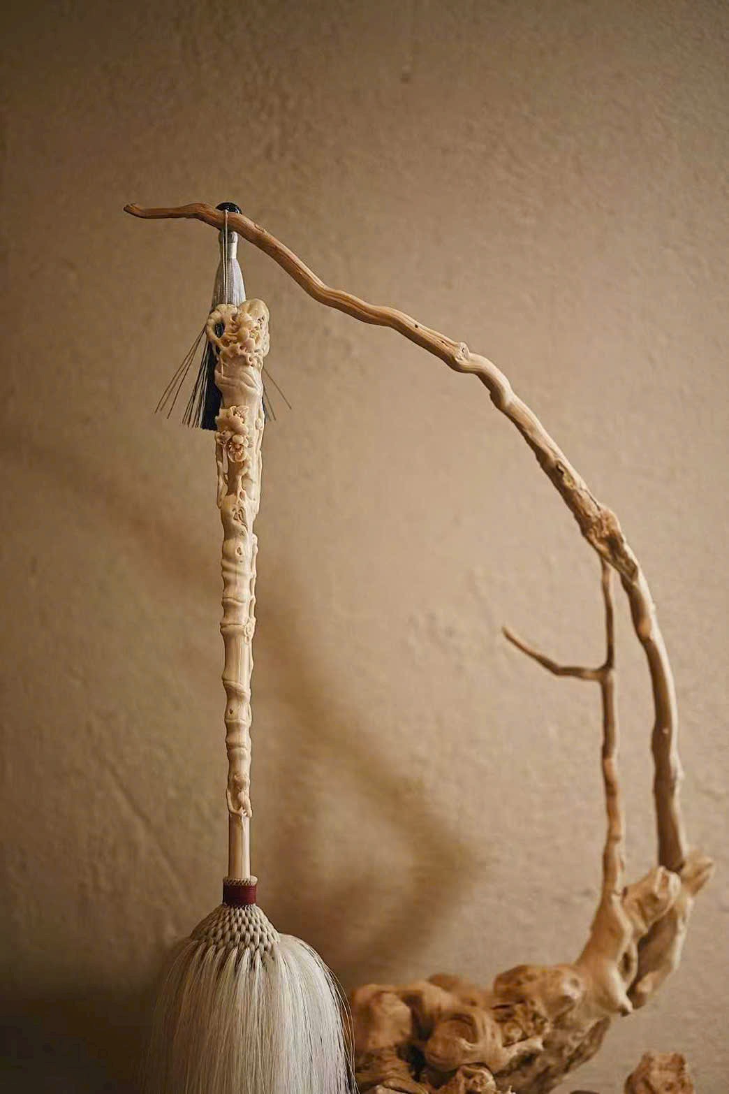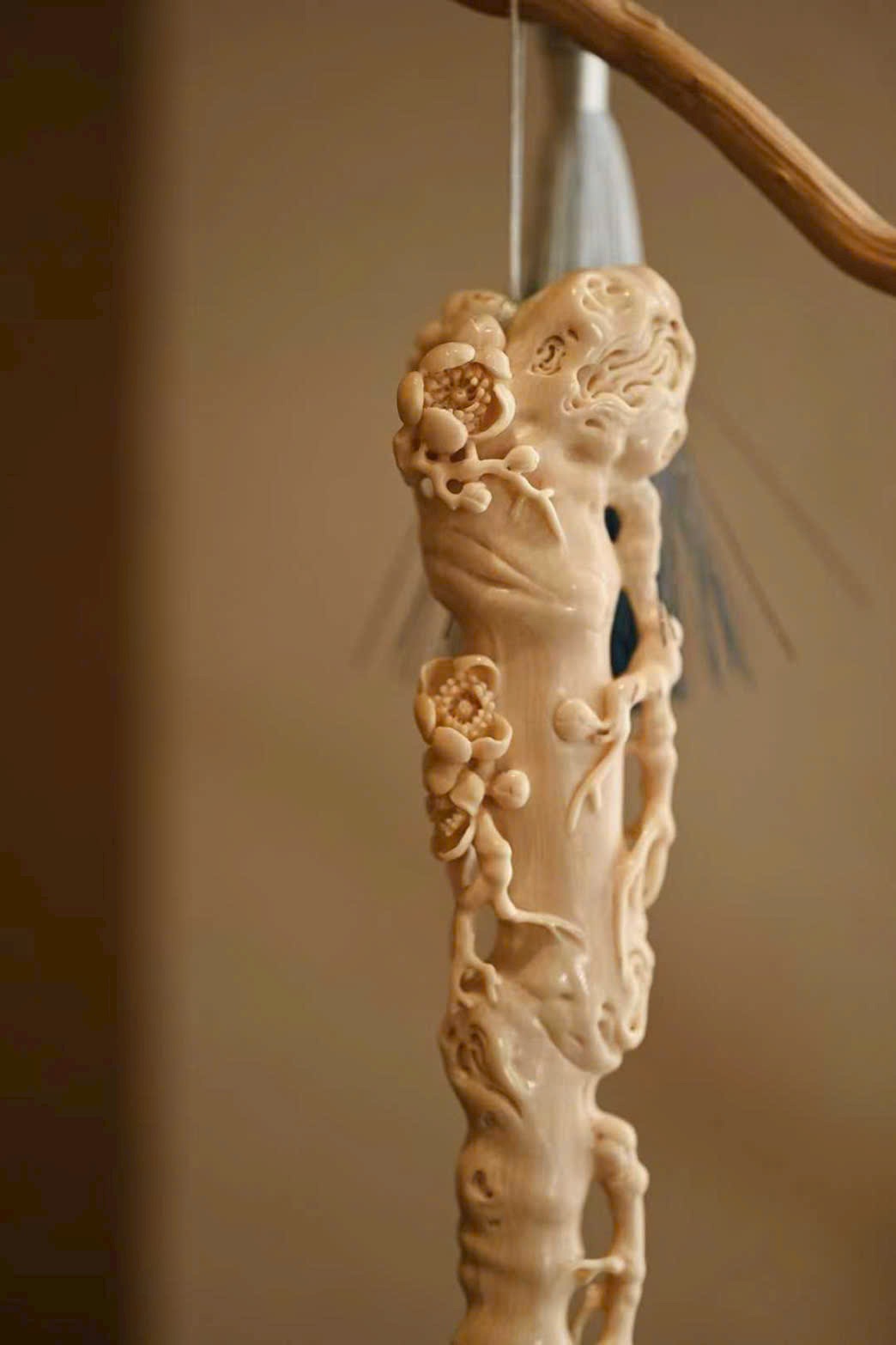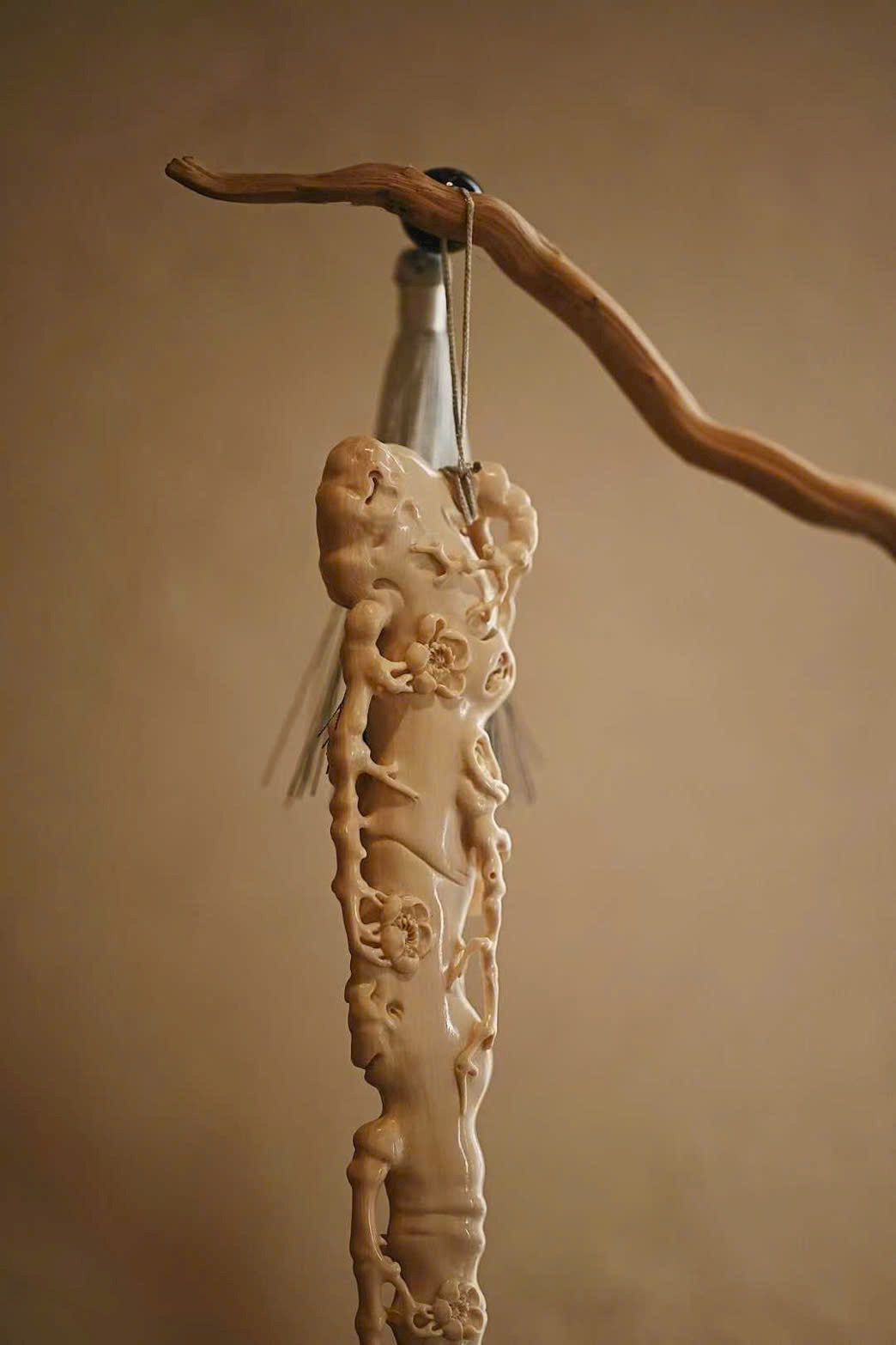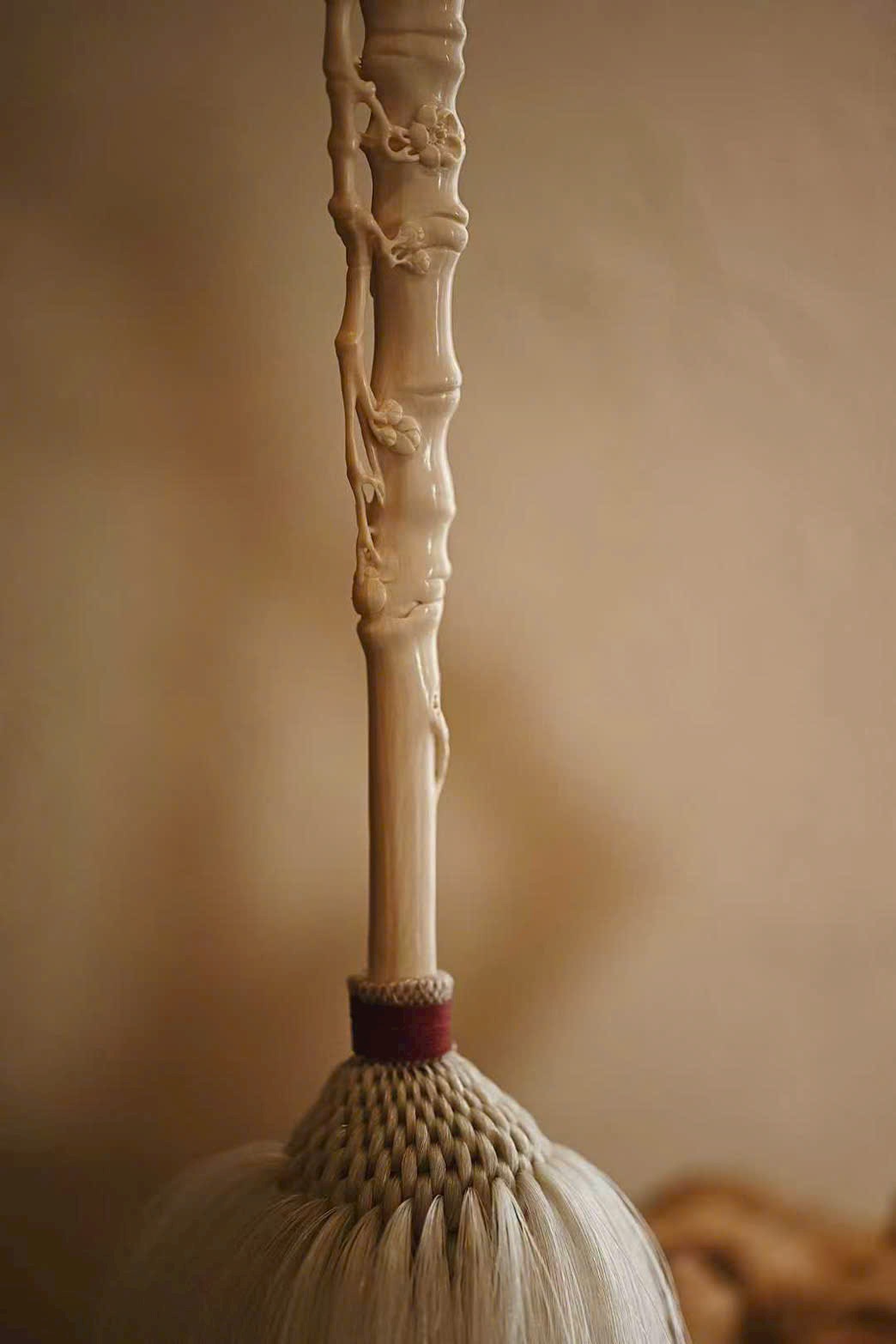 Cán phất trần được điêu khắc từ ng.à ma mút, cành mai uốn lượn, hoa nở sinh động tinh tế. Đầu phất trần làm bằng đuôi bờm ngựa buông tự nhiên, toát lên khí tức linh động. Trong văn phòng, phất trần cũng thường được bày trí như biểu tượng của sự tao nhã, cao quý.