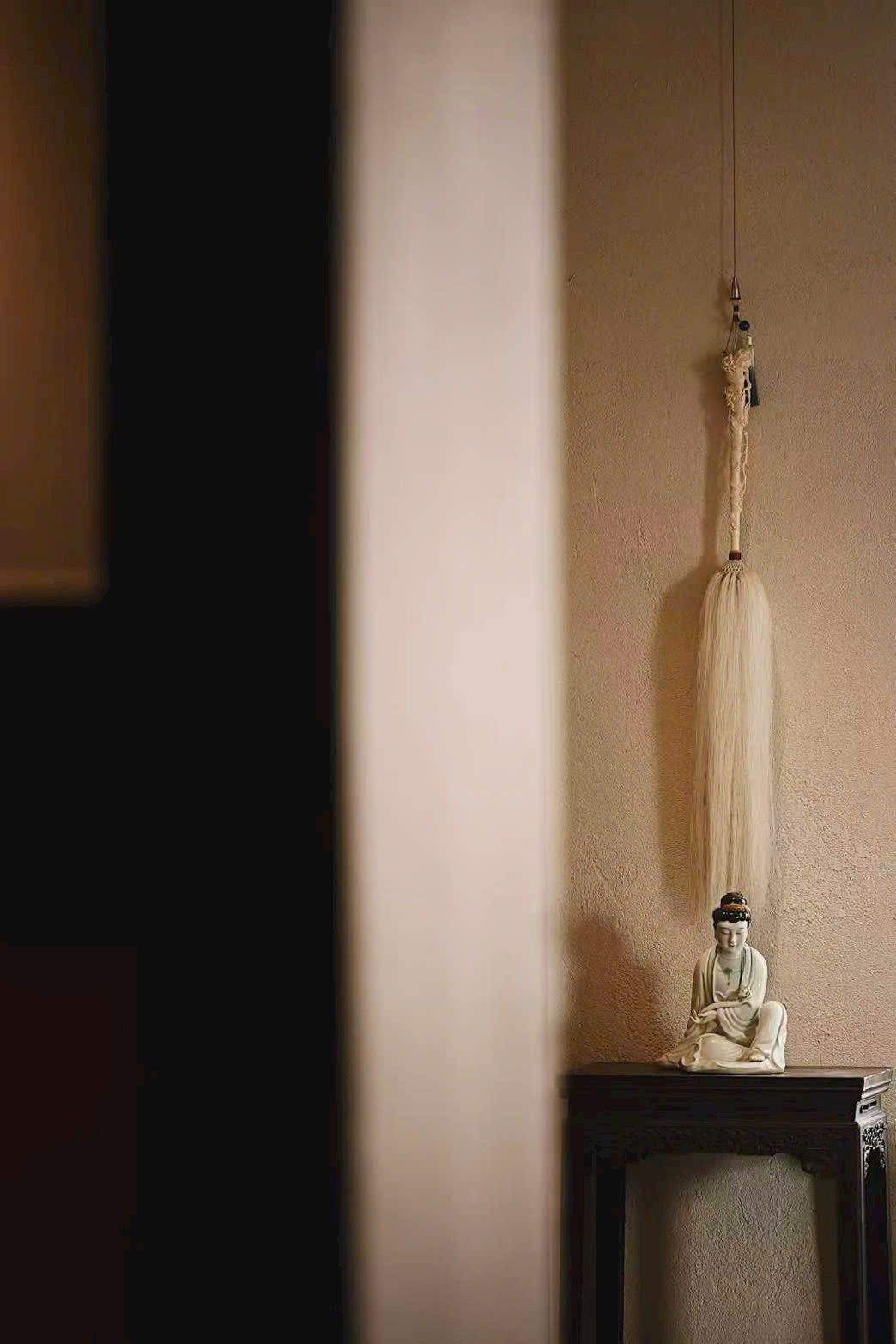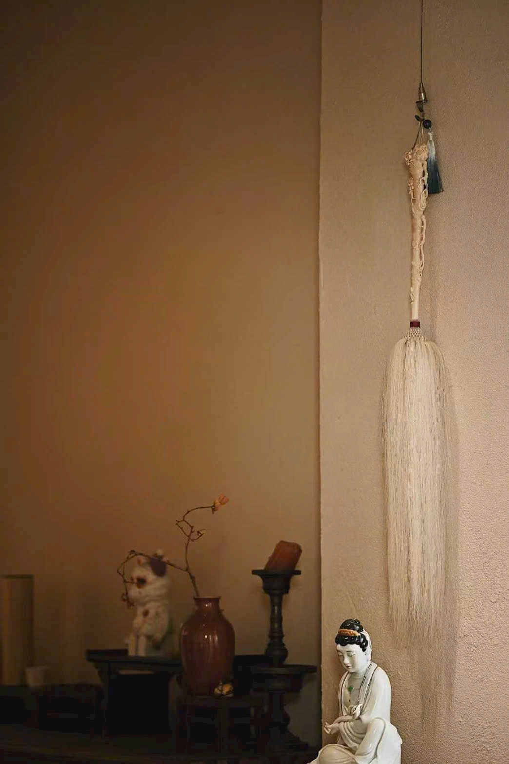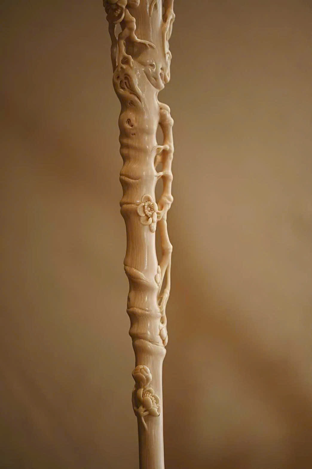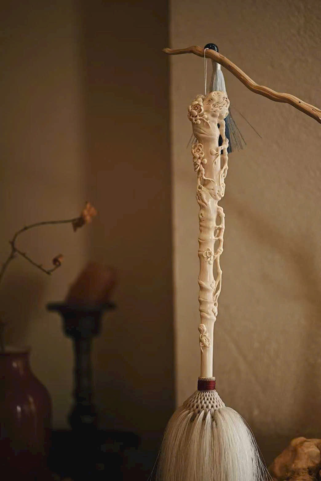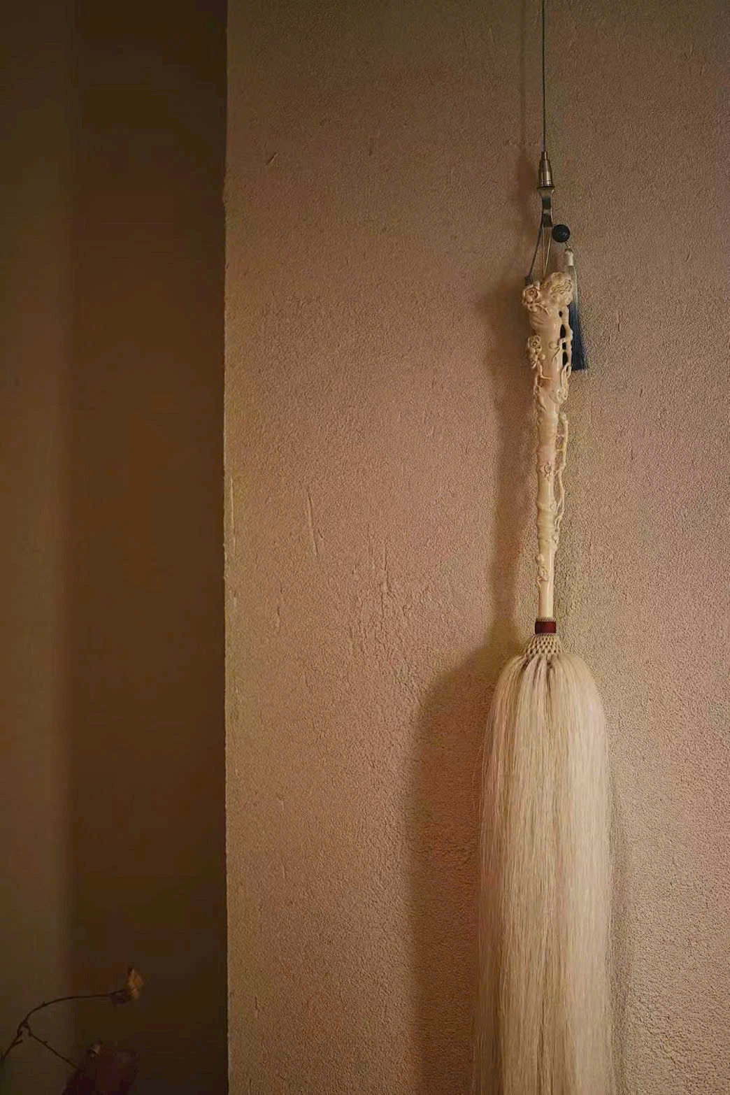 Cán phất trần được điêu khắc từ ng.à ma mút, cành mai uốn lượn, hoa nở sinh động tinh tế. Đầu phất trần làm bằng đuôi bờm ngựa buông tự nhiên, toát lên khí tức linh động. Trong văn phòng, phất trần cũng thường được bày trí như biểu tượng của sự tao nhã, cao quý.