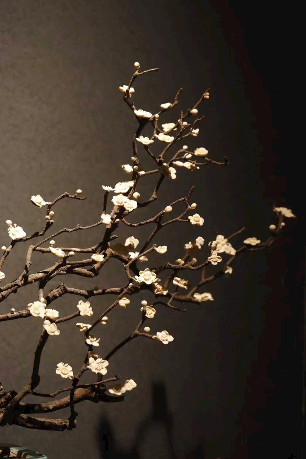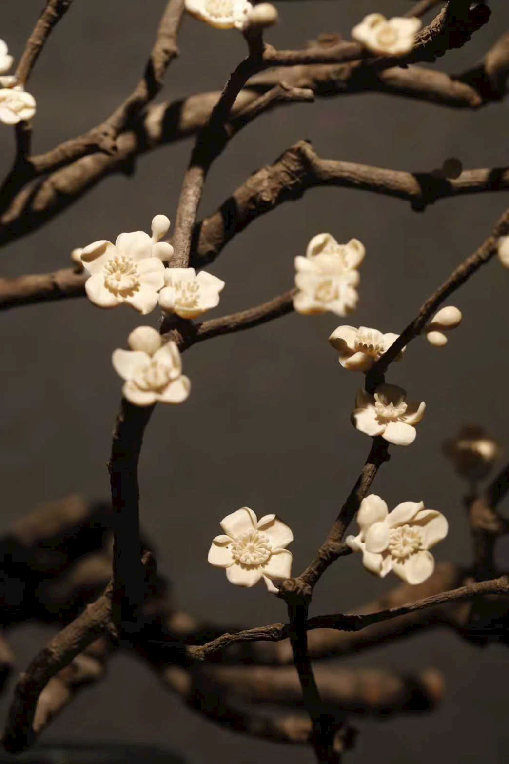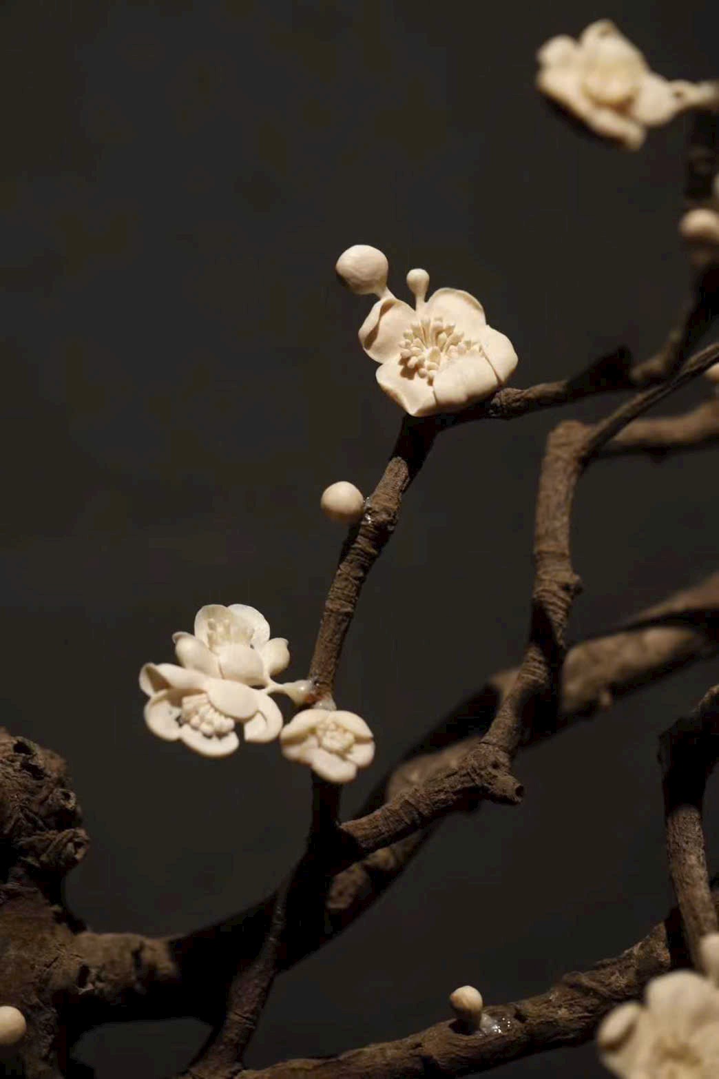 Lấy khúc mộc khô tự nhiên làm thân, khảm hoa mai ngà voi ma mút tinh tế.