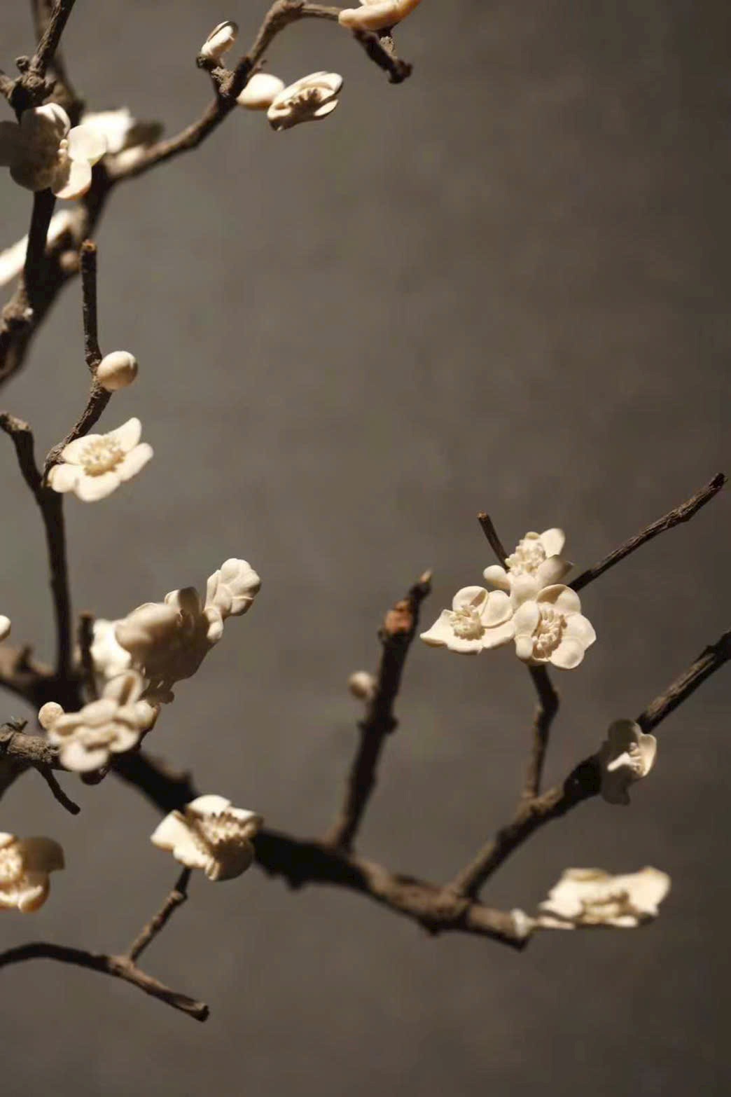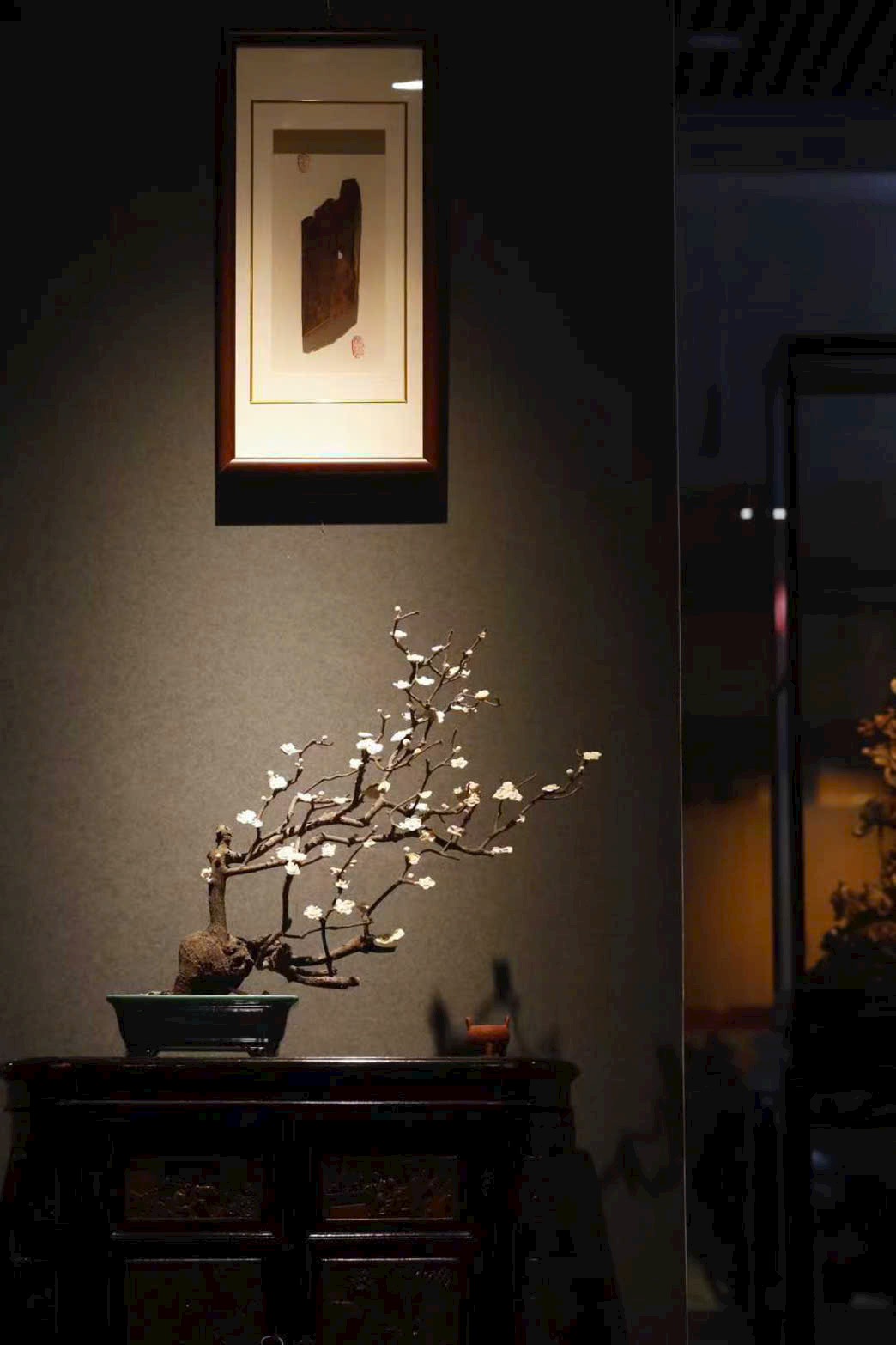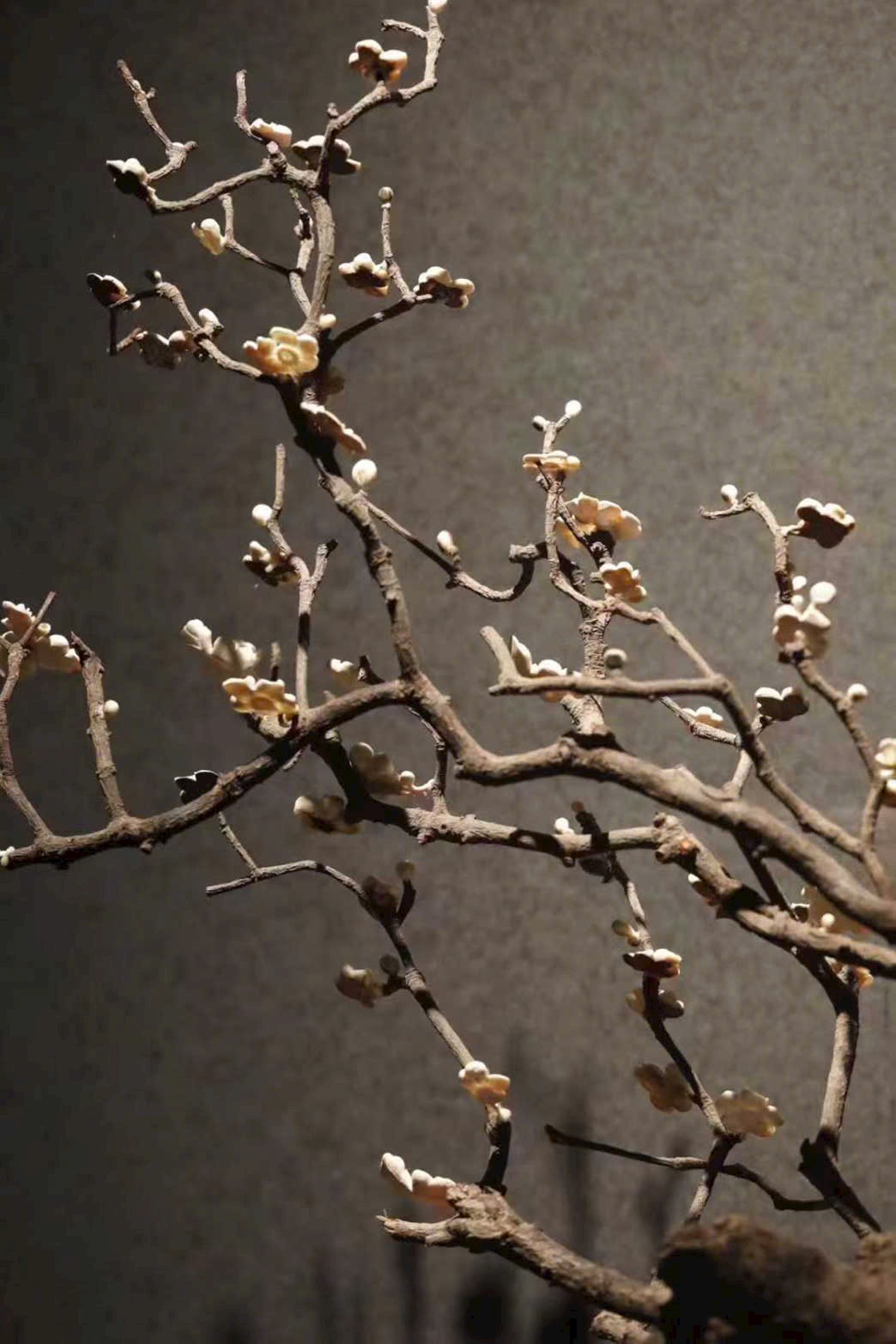Lấy khúc mộc khô tự nhiên làm thân, khảm hoa mai ngà voi ma mút tinh tế.