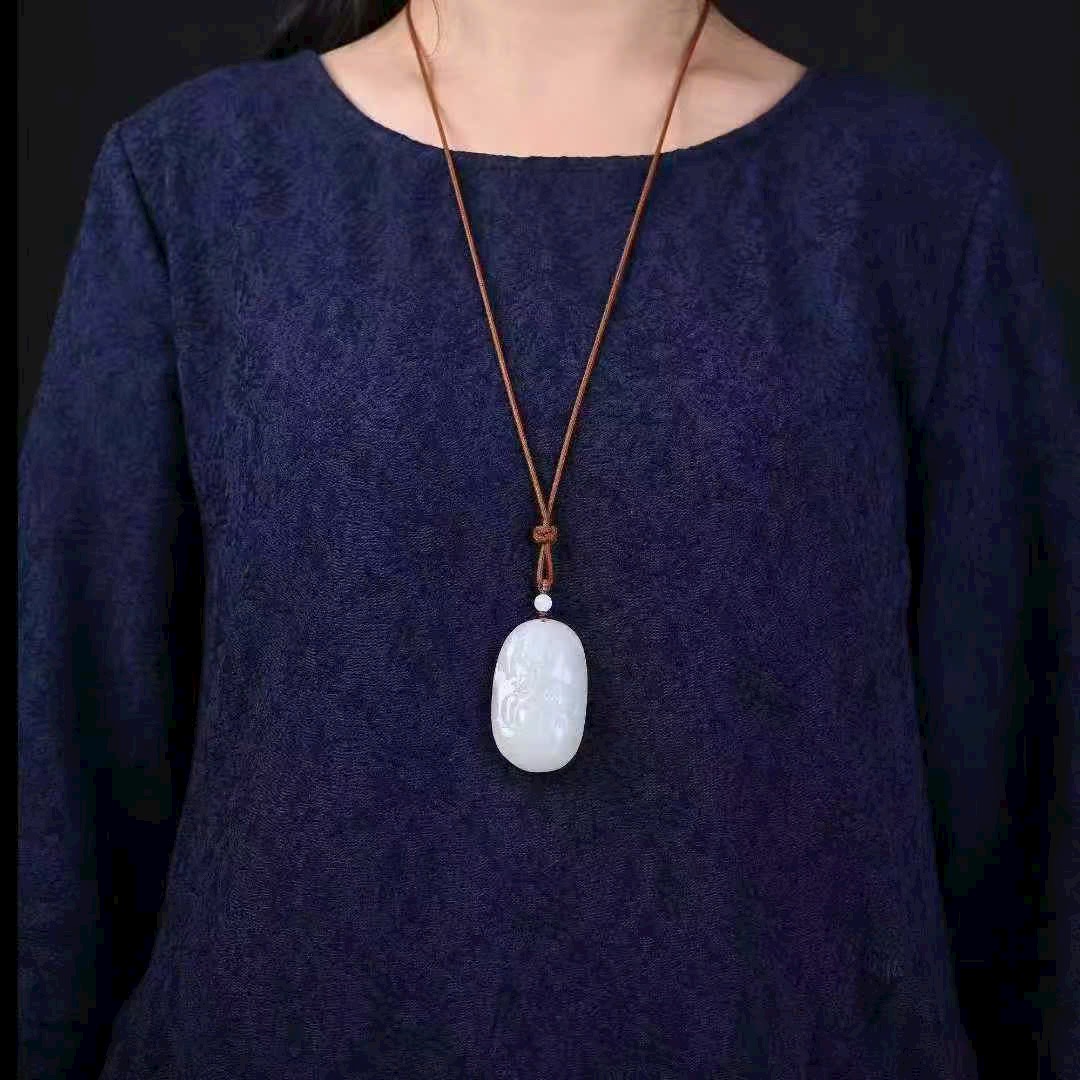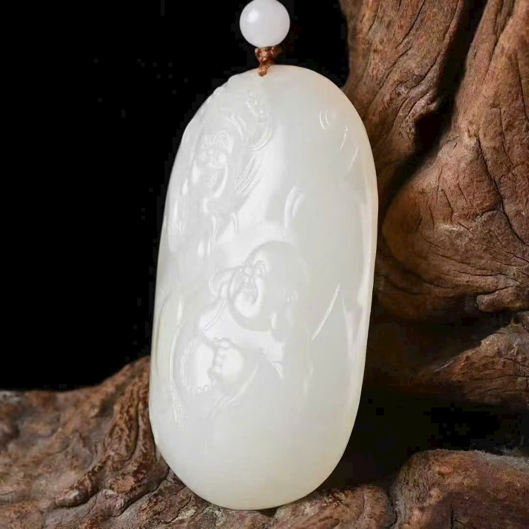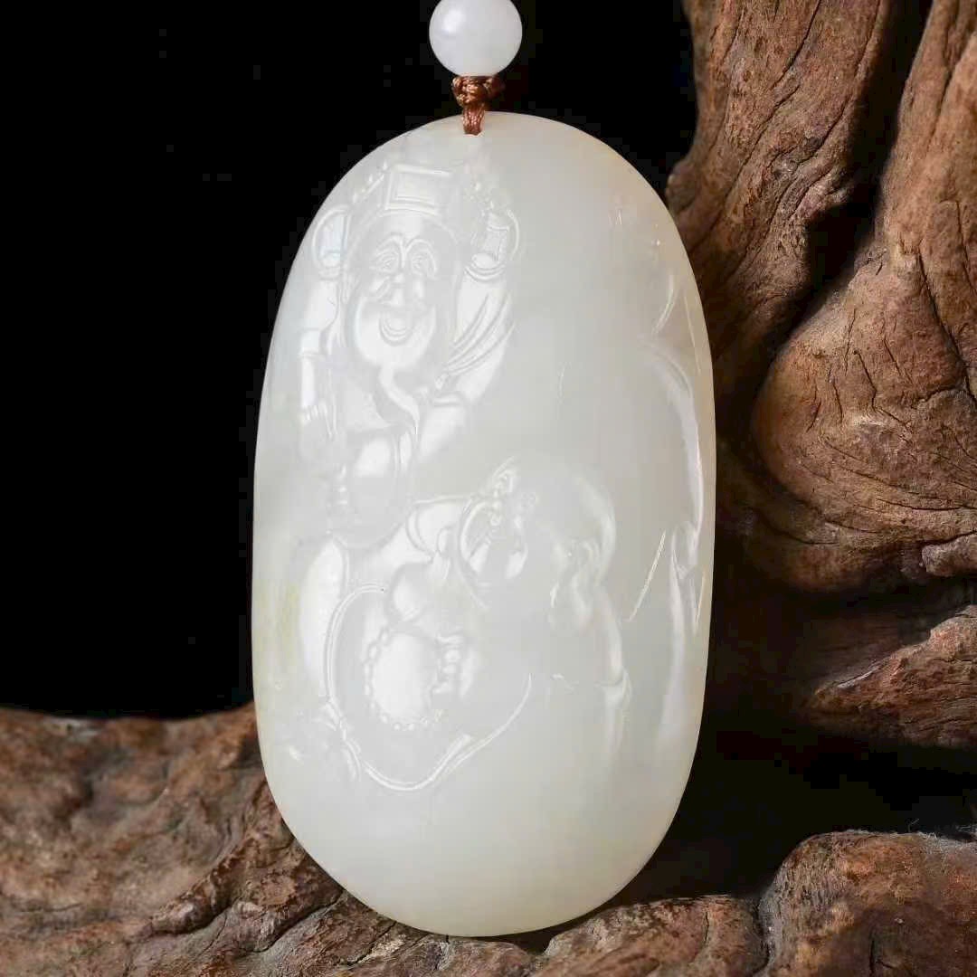 Mặt dây chuyền Tài Thần – “Nhân tài song vượng”, chế tác từ ngọc Hòa Điền tự nhiên, tượng trưng cho song toàn cả người lẫn tài. Tác phẩm do nghệ nhân Tô công chạm khắc, chất ngọc mịn màng, bóng dầu tự nhiên, cầm tay là thấy độ ấm nhuần.