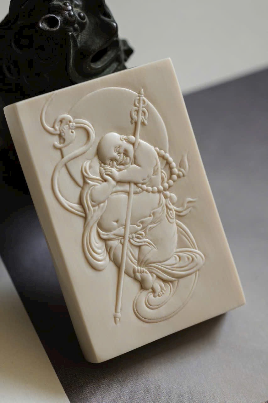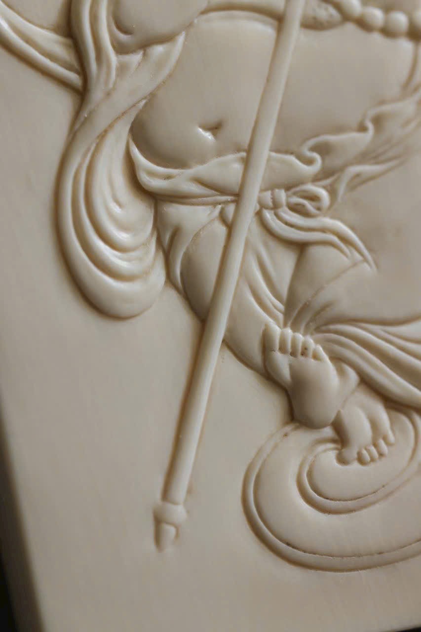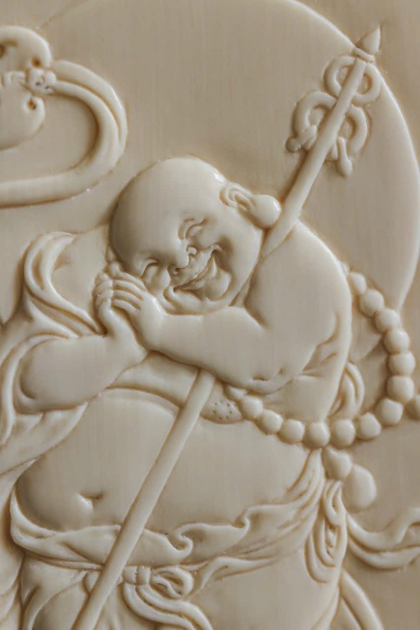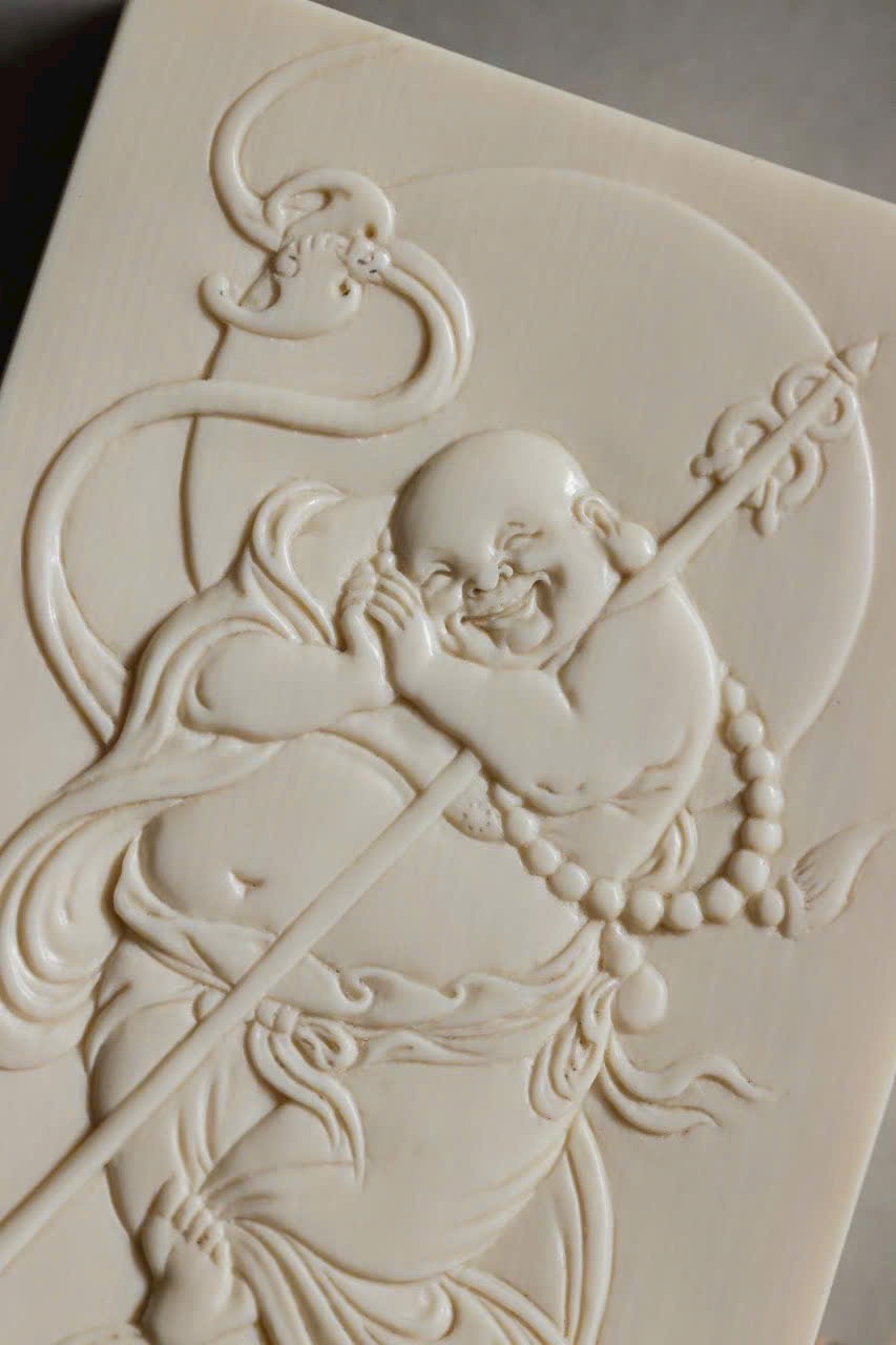 Tác phẩm chạm khắc từ n.gà voi ma mút, từng nếp áo uyển chuyển như dòng nước chảy, nét cười khắc sâu đầy nội lực. Hình thể tròn đầy, hài hòa, được mài giũa hàng trăm lần tạo nên độ bóng mượt và ánh sắc ấm áp. Tượng toát lên khí chất an lạc, hiền hòa, mang lại cảm giác thanh tịnh và may mắn cho người đeo.