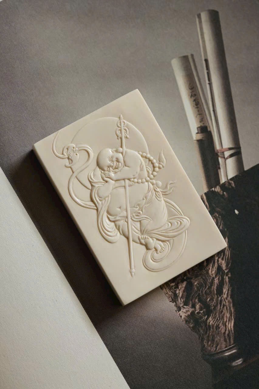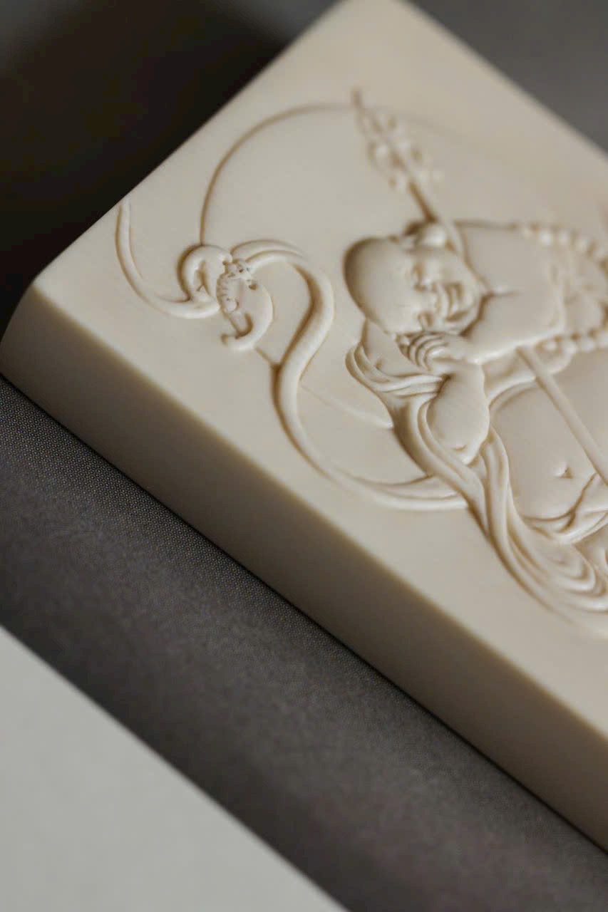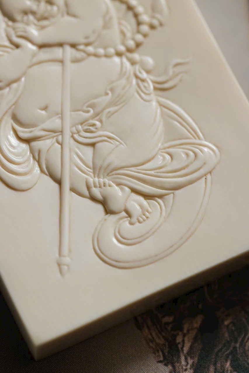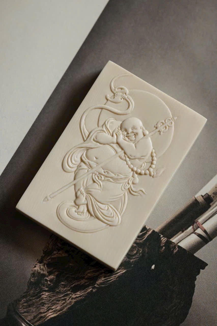 Tác phẩm chạm khắc từ n.gà voi ma mút, từng nếp áo uyển chuyển như dòng nước chảy, nét cười khắc sâu đầy nội lực. Hình thể tròn đầy, hài hòa, được mài giũa hàng trăm lần tạo nên độ bóng mượt và ánh sắc ấm áp. Tượng toát lên khí chất an lạc, hiền hòa, mang lại cảm giác thanh tịnh và may mắn cho người đeo.
