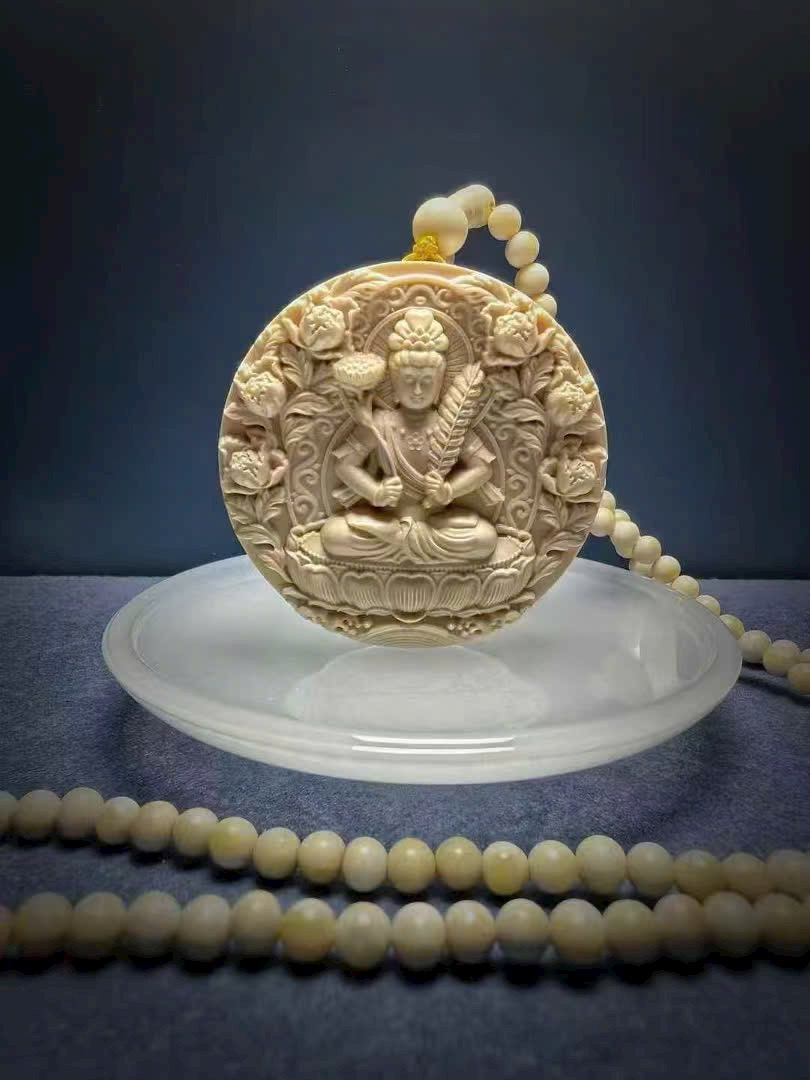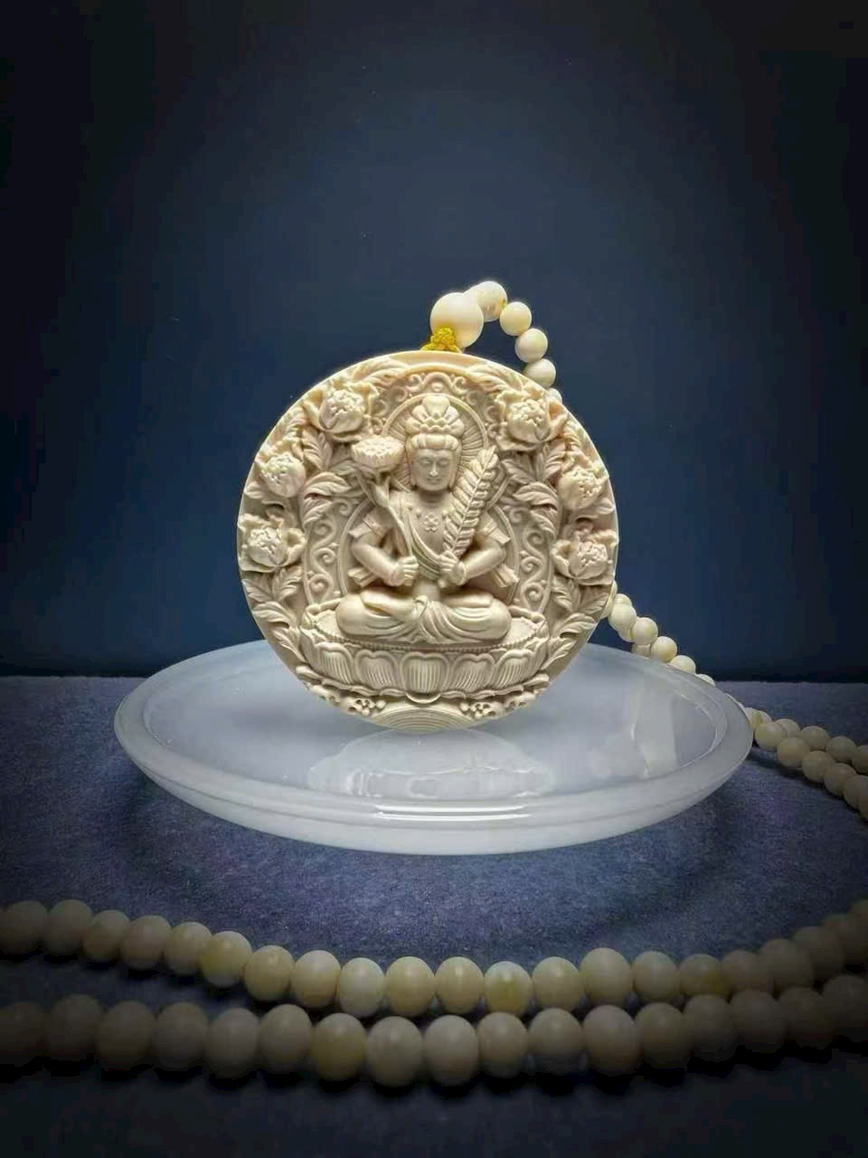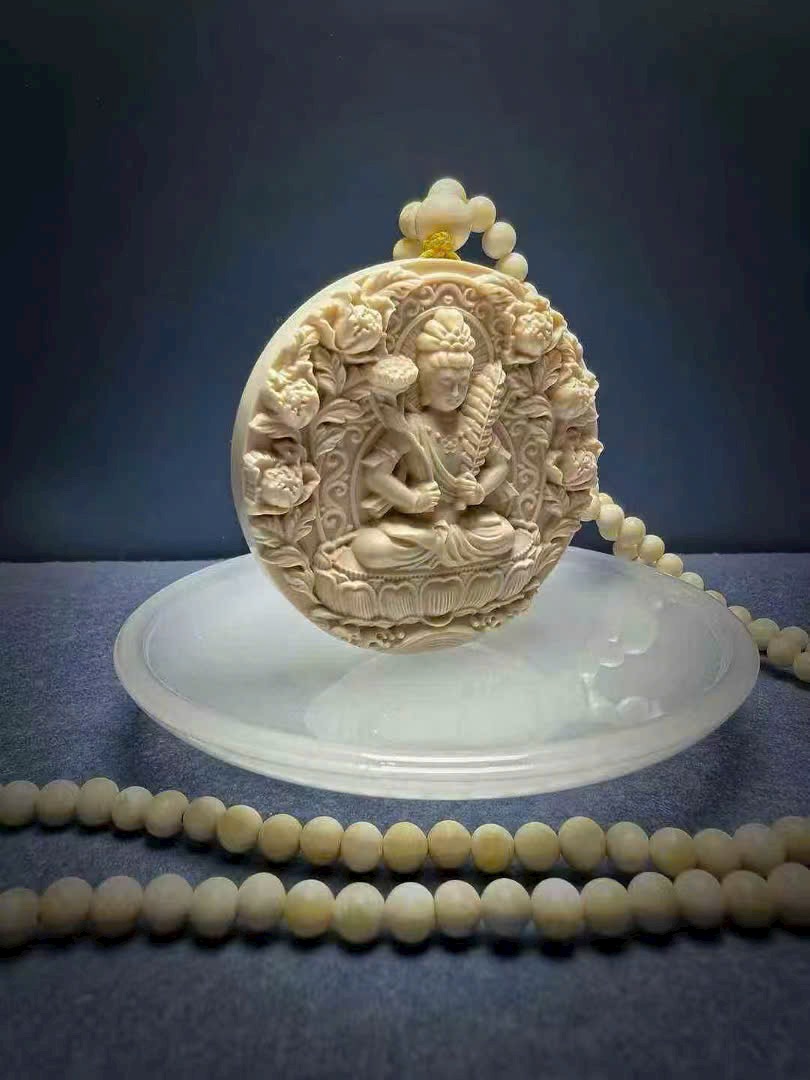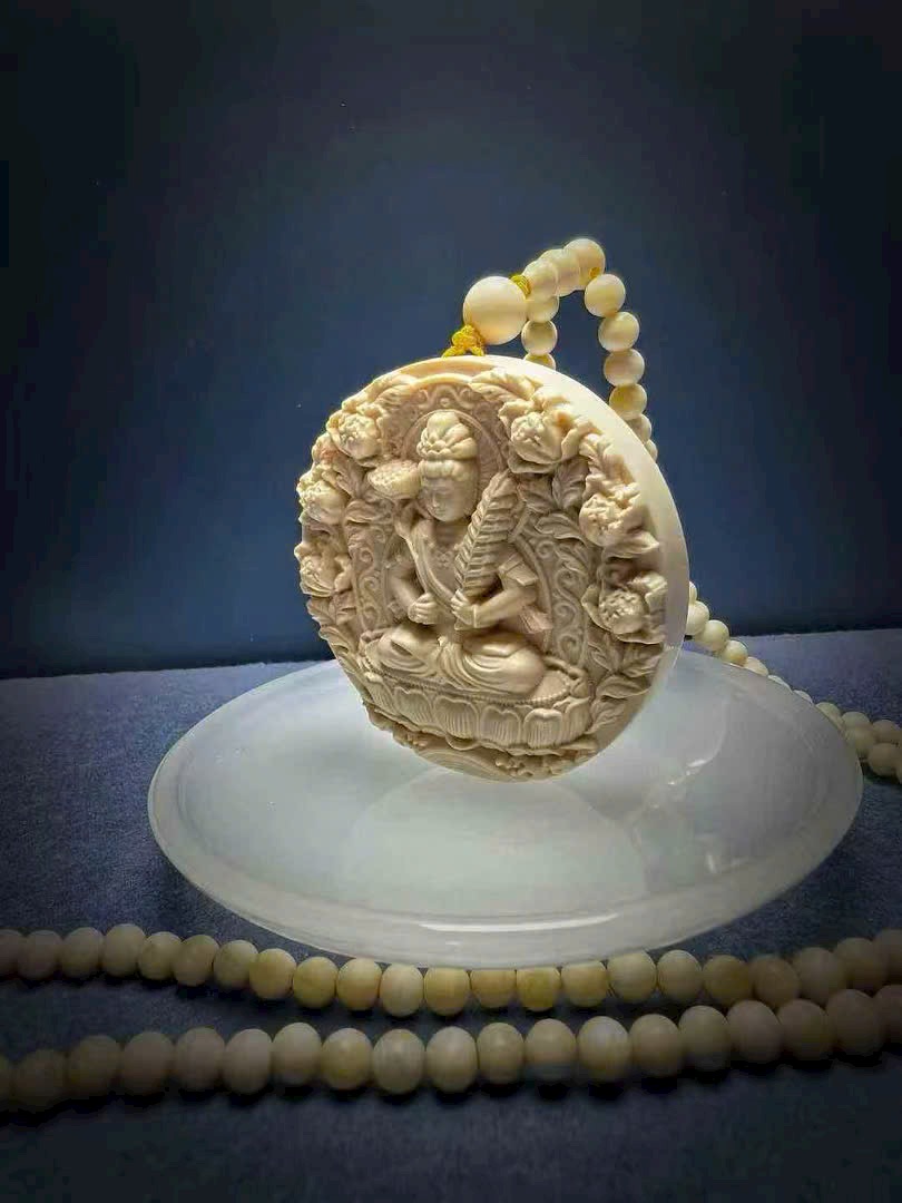 Mặt tròn thủ công, chạm khắc tinh tế; là vị hộ thân thần của tuổi Sửu và Dần. Chọn tâm ngà trong như thạch, chất liệu mịn và đầy vân, kiểu dáng mới lạ độc đáo. Tạo hình kinh điển, thần thái sinh động, đường chạm sắc nét — xứng đáng là món bảo vật sưu tầm.