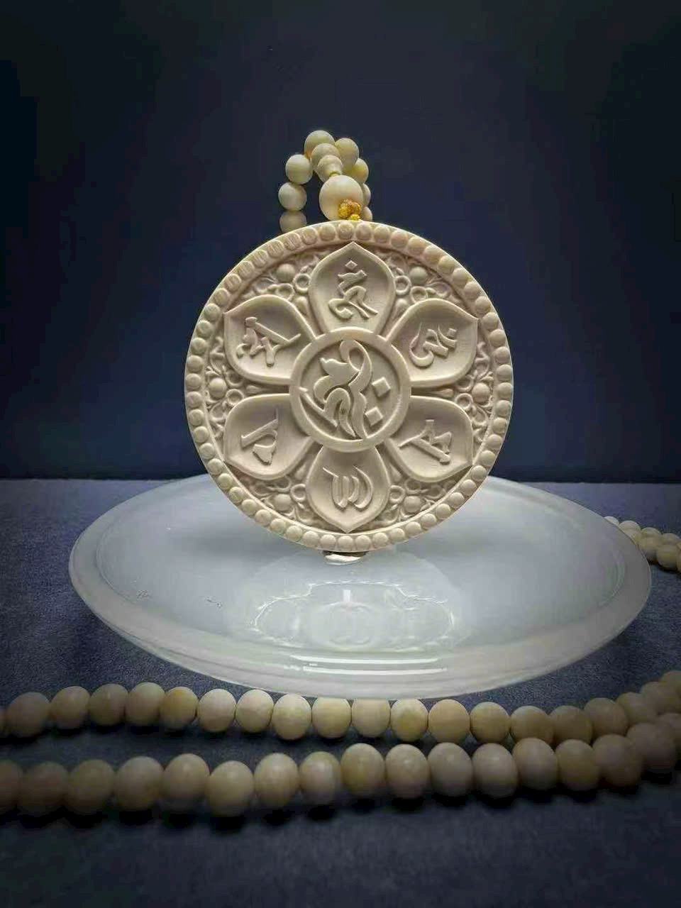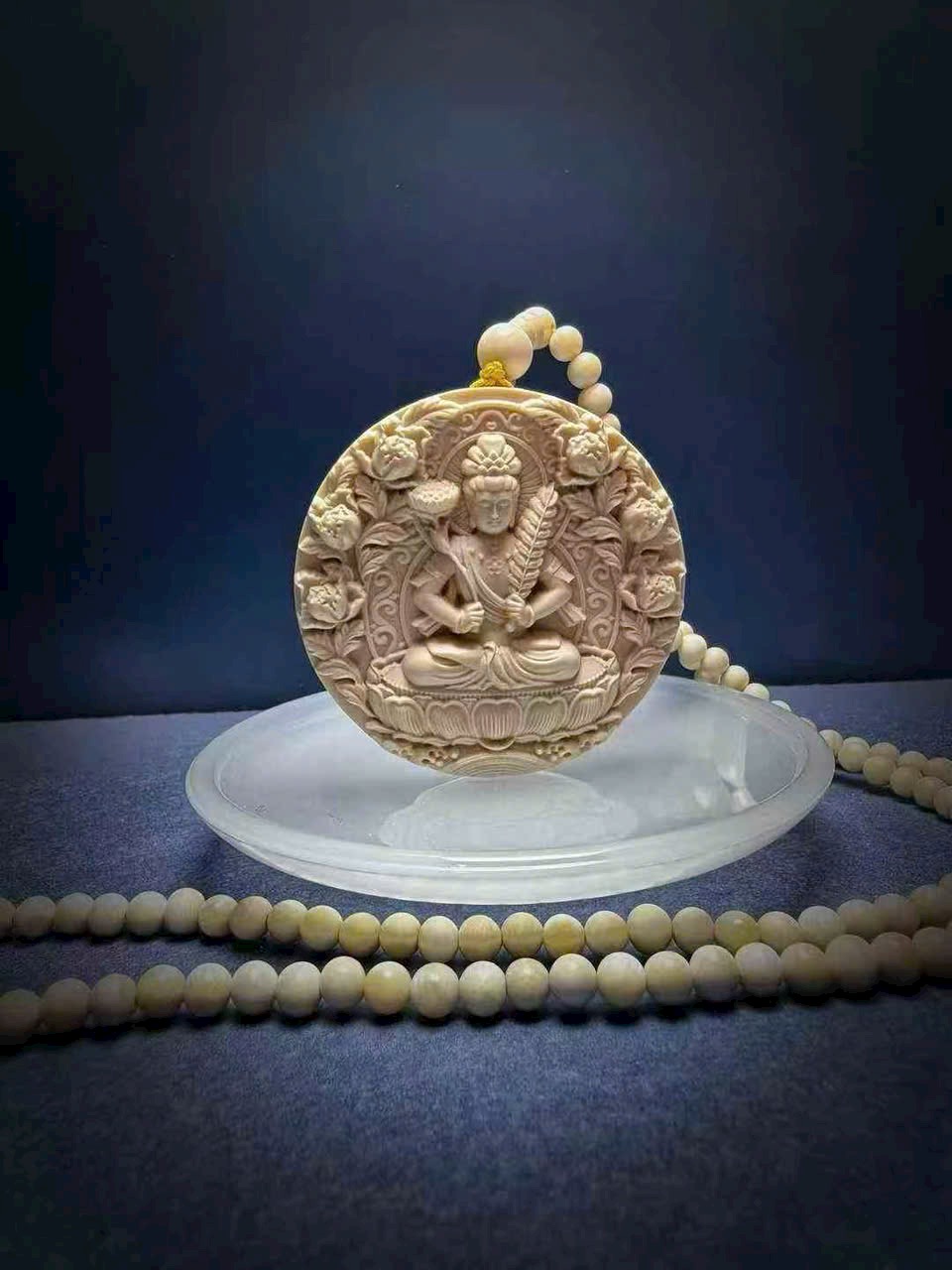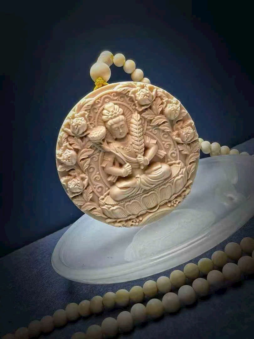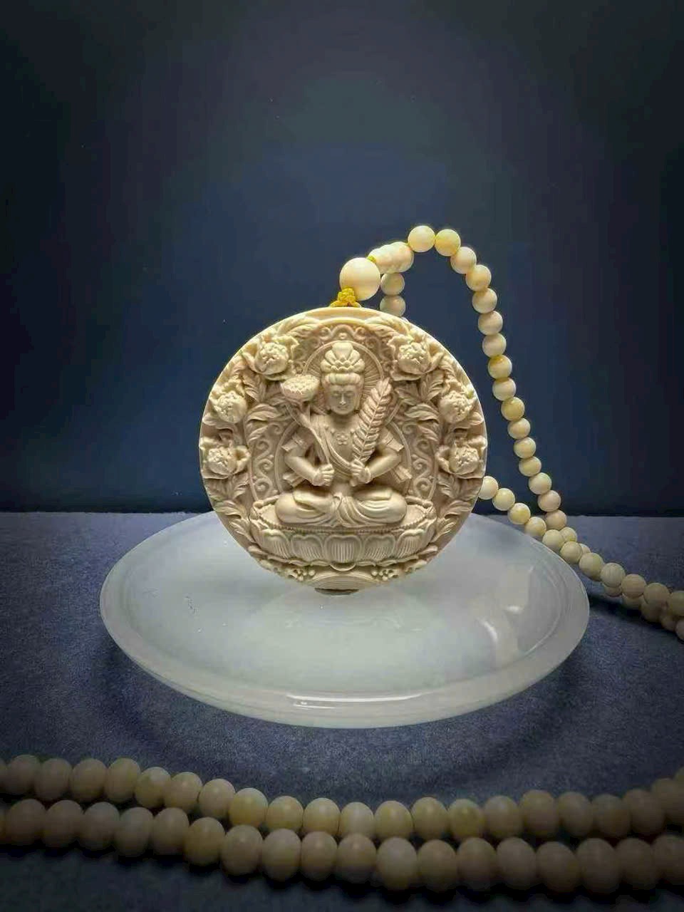 Mặt tròn thủ công, chạm khắc tinh tế; là vị hộ thân thần của tuổi Sửu và Dần. Chọn tâm ngà trong như thạch, chất liệu mịn và đầy vân, kiểu dáng mới lạ độc đáo. Tạo hình kinh điển, thần thái sinh động, đường chạm sắc nét — xứng đáng là món bảo vật sưu tầm.