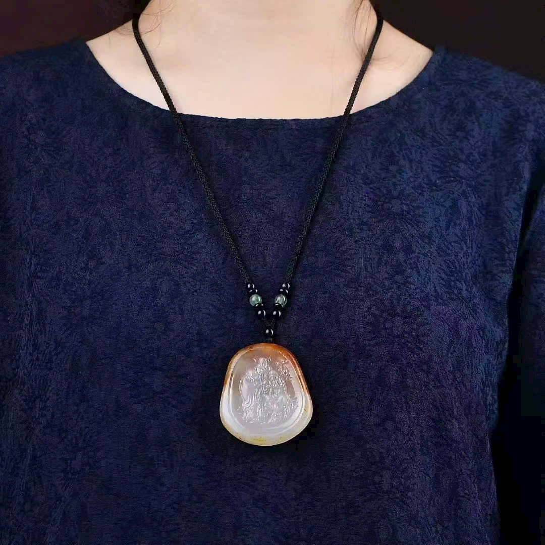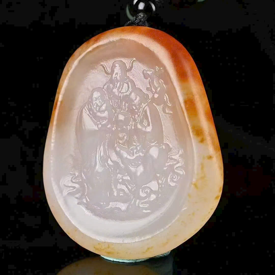 Ngọc mịn màng, ấm nhuận, sắc ngọc dịu dàng. Tác phẩm do danh sư chế tác thuần thủ công, khắc tinh xảo Phúc Tinh, Lộc Tinh và Thọ Tinh, ba vị Phúc – Lộc – Thọ hội tụ trong một, tinh hoa văn hóa cát tường Trung Hoa: cuộc sống viên mãn, sự nghiệp thành công, sức khỏe trường thọ.